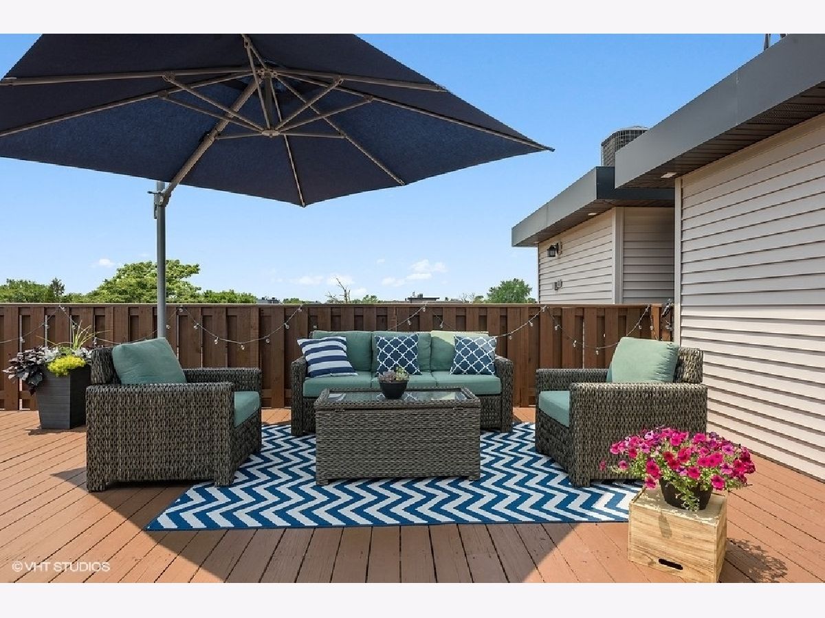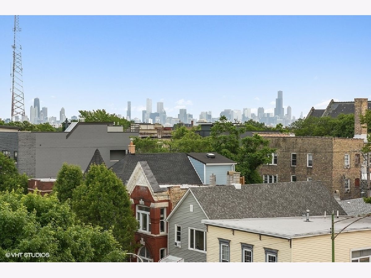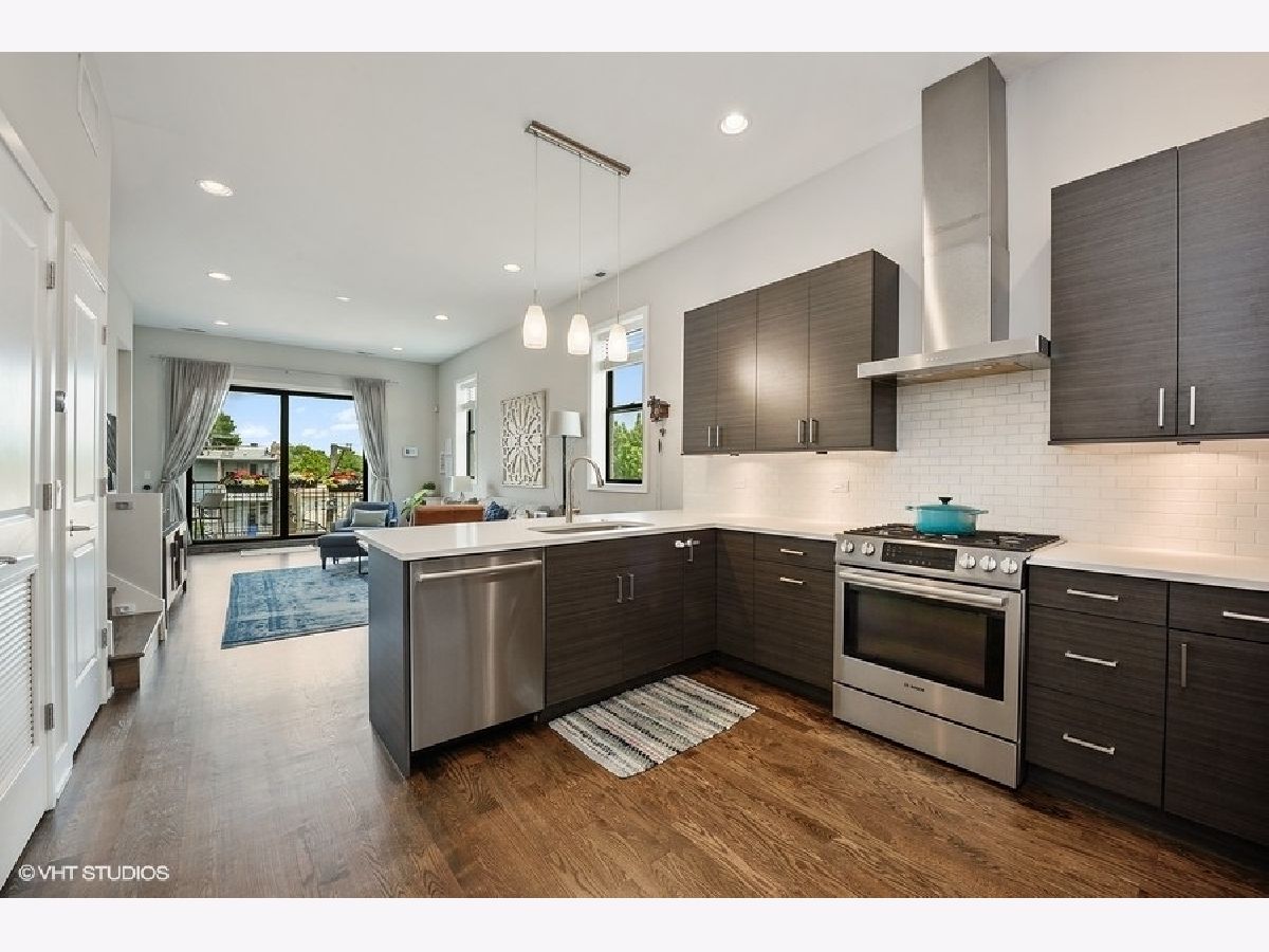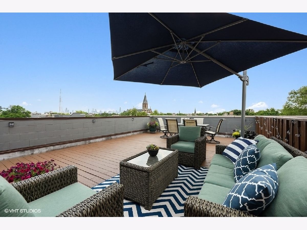 Logan Square PENTHOUSE unit located on a beautiful tree-lined street a block from the Blue Line and Palmer Square built in 2016. Featuring an abundance of natural light due to a Southern Exposure and three private outdoor spaces PLUS a private roof top deck this unit lives like a townhome. The kitchen features soft close flat panel cabinets, modern dome pendants, white subway tile backsplash and quartz countertops. Bosch appliances include a 5 burner, stainless steel range with hood, and french door refrigerator. The kitchen overlooks the full-width living / dining space with an adjacent powder room conveniently located for guests while entertaining. Along the same wall, a side-by-side washer dryer with built out storage above and separate pantry are tucked behind shaker style white doors. The Master Bedroom features a spacious walk-in closet, complete with California Closet systems while The Master Bath bath includes a floating double vanity, quartz countertops, oversized walk in rain shower and heated floors. Top floor bonus office/den and private rooftop deck with city views! The rooftop is wired for speakers and conveniently includes power and water. The lower level of has an additional full bathroom as well as two bedrooms and a deck off one of the bedrooms. Garage parking included, intercom entry and additional storage closet outside unit.