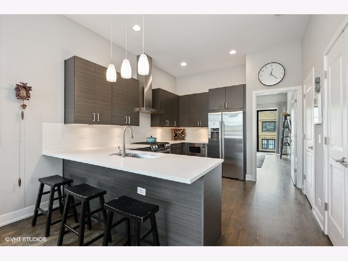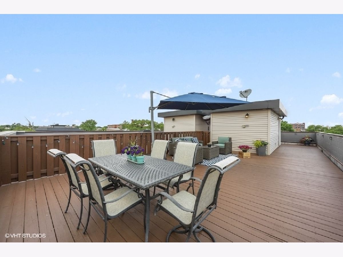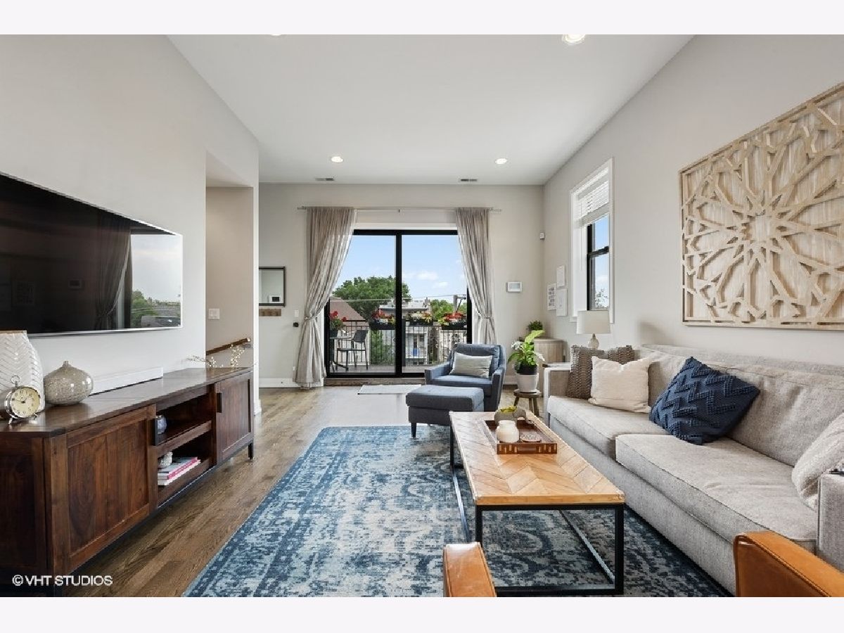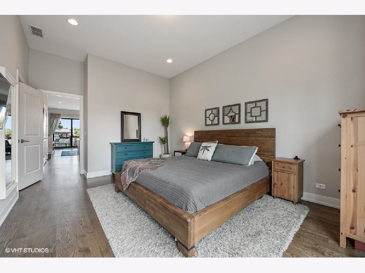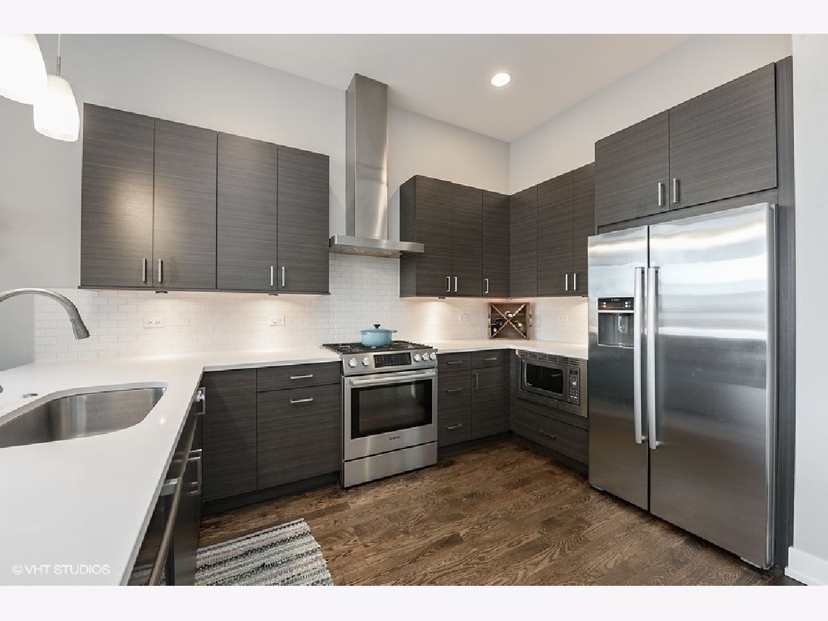Logan Square PENTHOUSE unit located on a beautiful tree-lined street a block from the Blue Line and Palmer Square built in 2016. Featuring an abundance of natural light due to a Southern Exposure and three private outdoor spaces PLUS a private roof top deck this unit lives like a townhome. The kitchen features soft close flat panel cabinets, modern dome pendants, white subway tile backsplash and quartz countertops. Bosch appliances include a 5 burner, stainless steel range with hood, and french door refrigerator. The kitchen overlooks the full-width living / dining space with an adjacent powder room conveniently located for guests while entertaining. Along the same wall, a side-by-side washer dryer with built out storage above and separate pantry are tucked behind shaker style white doors. The Master Bedroom features a spacious walk-in closet, complete with California Closet systems while The Master Bath bath includes a floating double vanity, quartz countertops, oversized walk in rain shower and heated floors. Top floor bonus office/den and private rooftop deck with city views! The rooftop is wired for speakers and conveniently includes power and water. The lower level of has an additional full bathroom as well as two bedrooms and a deck off one of the bedrooms. Garage parking included, intercom entry and additional storage closet outside unit.