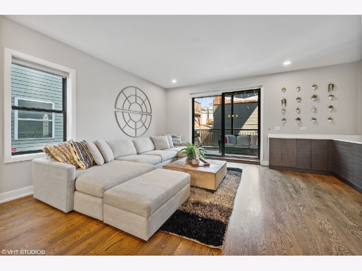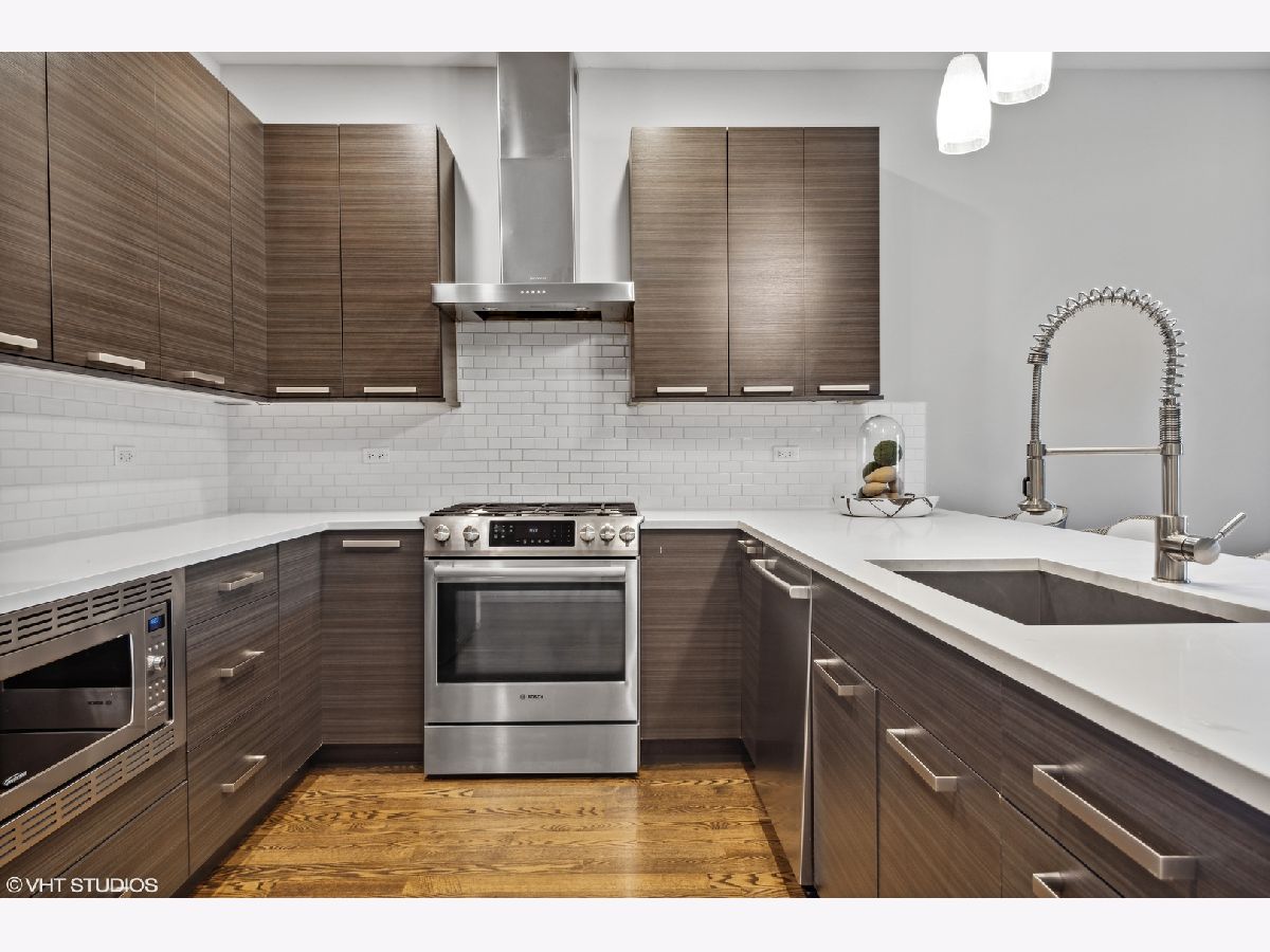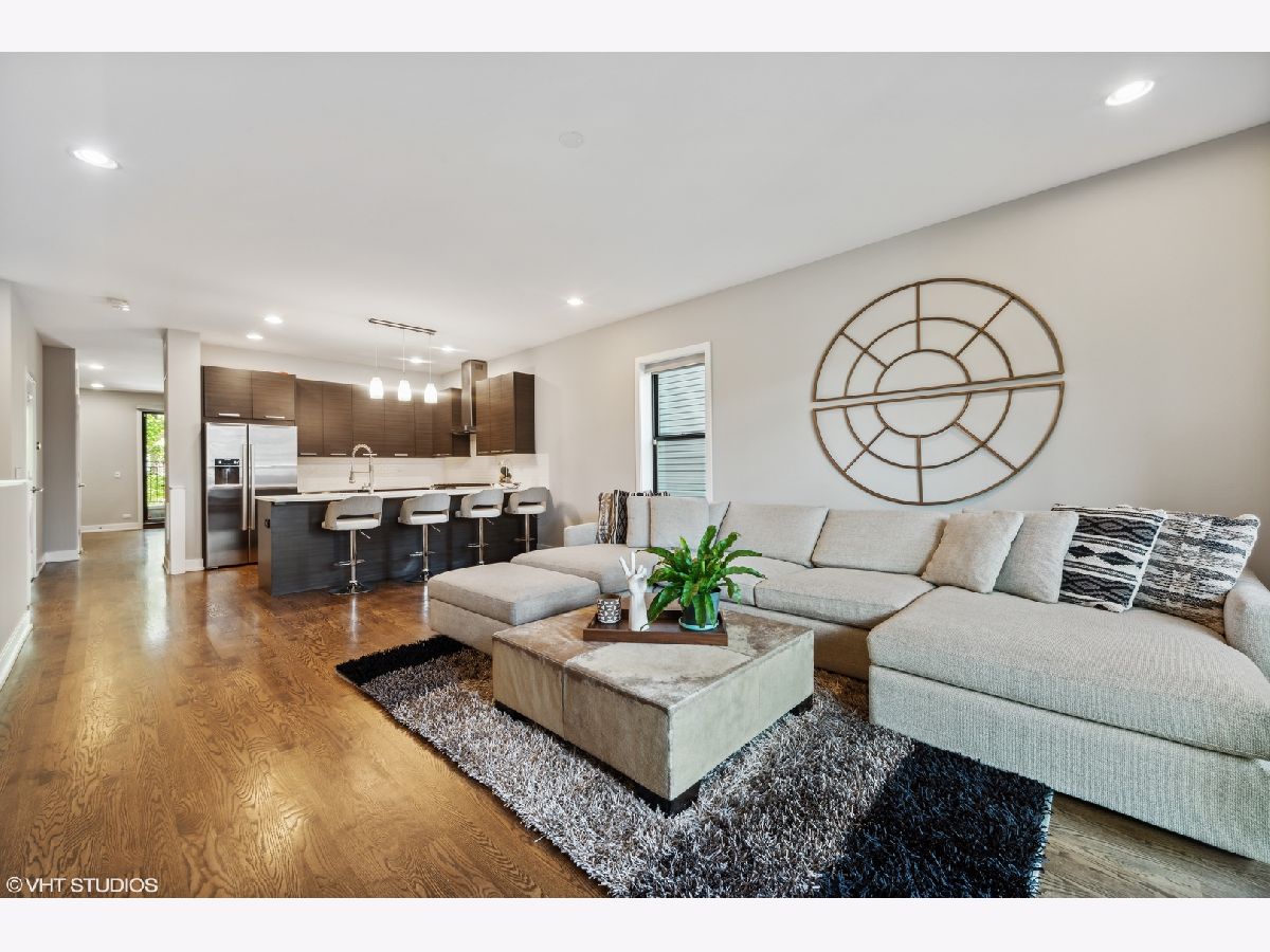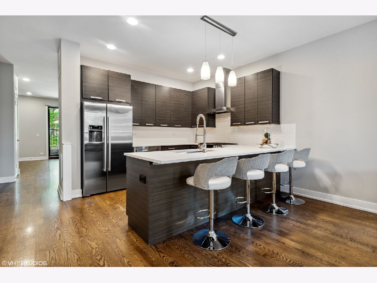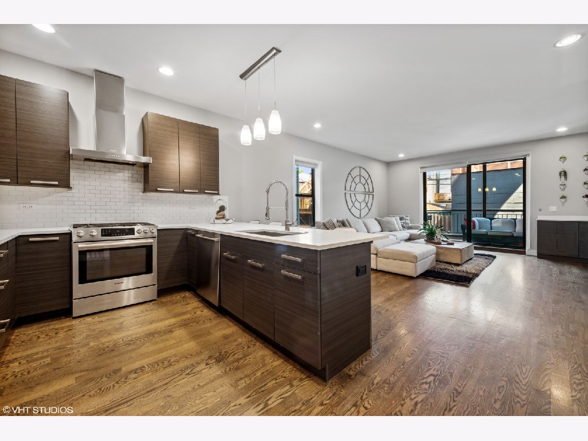 Stunning like-new construction, extra wide all brick 3 bedroom, 2.5 bathroom duplex down in highly desirable Logan Square! This bright, open concept home is adorned with high end finishes throughout. Beautiful chef's kitchen features custom cabinetry, white quartz countertops, stainless steel Bosch appliances, huge island with breakfast bar, and designer lighting. Gorgeous walnut stained flooring throughout. Primary bedroom features a dual built out closets and spa-like ensuite bath with heated flooring and custom tiled walk-in shower. Spacious additional bedrooms boasts ample closet space. Three private outdoor spaces - perfect for entertaining! Deck is pre-wired for internet, audio and video (outdoor speakers will remain with condo). The garage is pre-wired with a 30 amp service (NEMA 14-30 outlet) for electric vehicle charging. Steps from Blue line, Palmer Square, restaurants and shops. Garage Parking included.