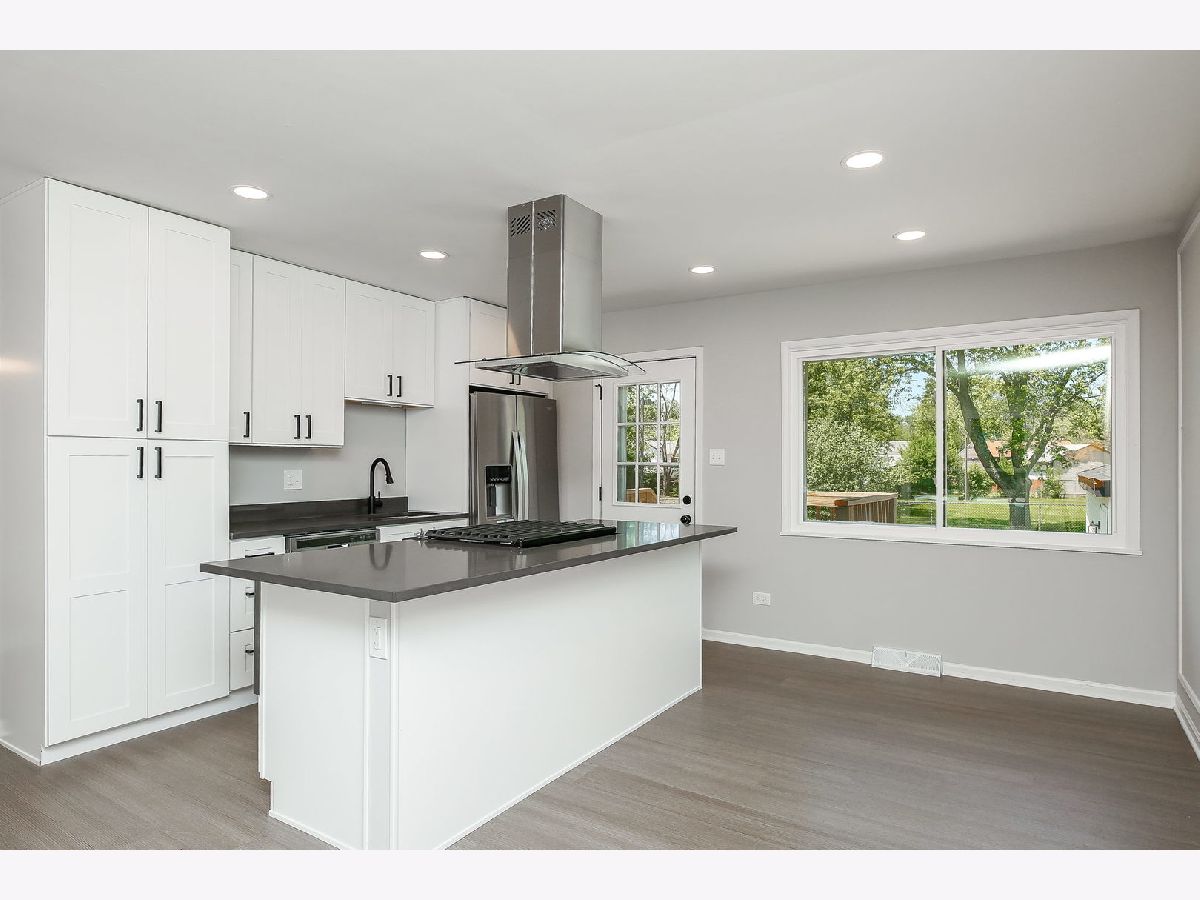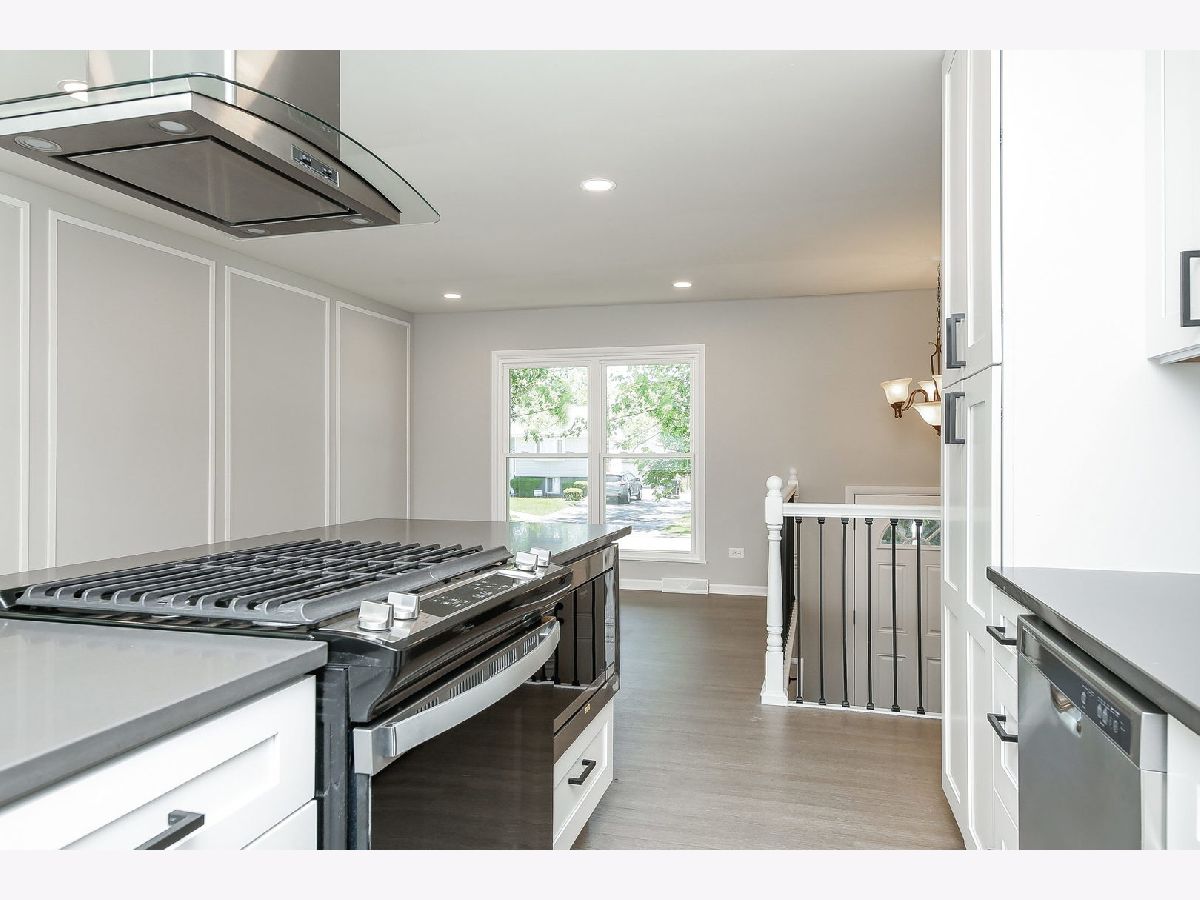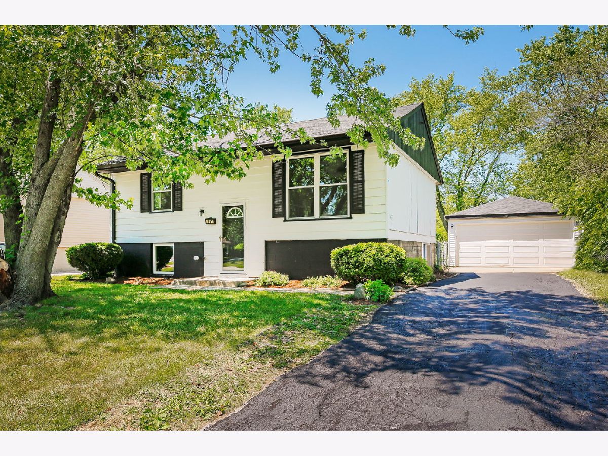 Welcome home to this completely updated raised-ranch featuring 4 bedrooms/2 bathrooms, 2 car detached garage and large fenced yard, perfect for outdoor entertaining! Updated throughout with neutral color palettes, new windows, updated lighting, kitchen, bathrooms, flooring, paint & more! The kitchen features new white cabinetry (with soft close), quartz countertops, brand new SS appliances including gas cooktop, built-in oven & microwave, dishwasher, and modern fridge. Island seating for 5+, with a combo dining area & plenty of room for hosting. New vinyl plank flooring and a modern accent wall compliment the main living area and kitchen/dining room. 2 beds upstairs and updated full bath. Head downstairs where you're welcomed into a large family room - bright and spacious with new carpet throughout! 2 more bedrooms and full bathroom on the lower level as well, along with mechanical/laundry closet. The back door off the kitchen leads to a new, modest deck and into the large fenced yard, backing Veterans Park. Walking distance to schools & bike to forest preserve trails!