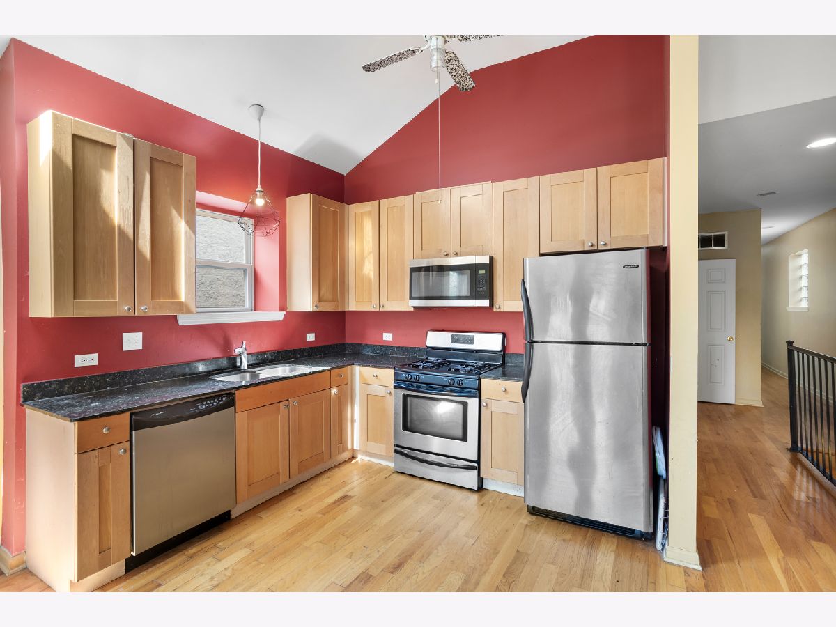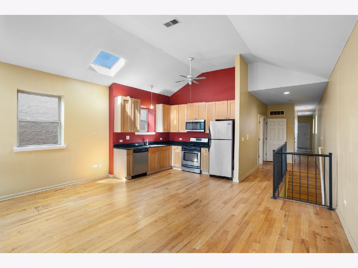 Top Floor Penthouse offers spacious living with an open floor plan and high ceilings. Enter through the main foyer, featuring skylights that bathe the space in natural light. The large open area is ideal for combining a living and dining room. The beautiful kitchen boasts stainless steel appliances, ample cabinet space, and sleek granite countertops, making it a perfect space for entertaining. The master bedroom includes an ensuite with a jacuzzi tub for a luxurious touch, and there are two additional well-sized bedrooms, plus another full bathroom. The home also offers a private rear balcony for outdoor enjoyment, as well as dedicated parking. Recent upgrades include a, a new water heater (2018), and a new back door installed in May 2022. This penthouse provides easy access to the 290 Eisenhower Expressway and is just minutes from Downtown Chicago. It's also located near the Green, Blue, and Pink line train stations.