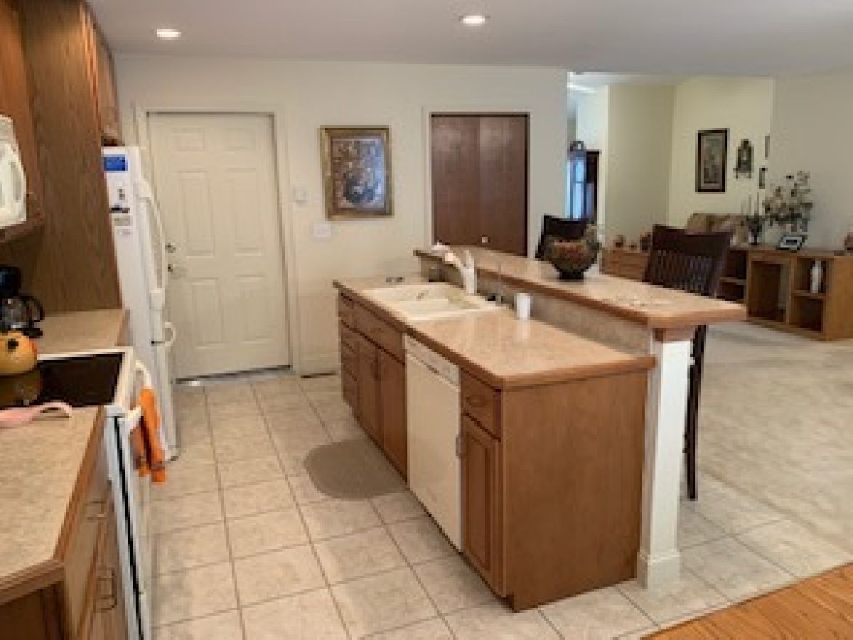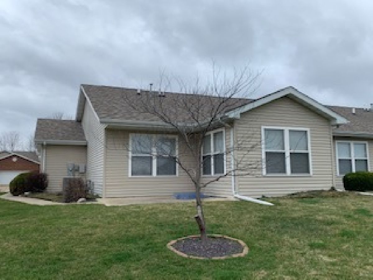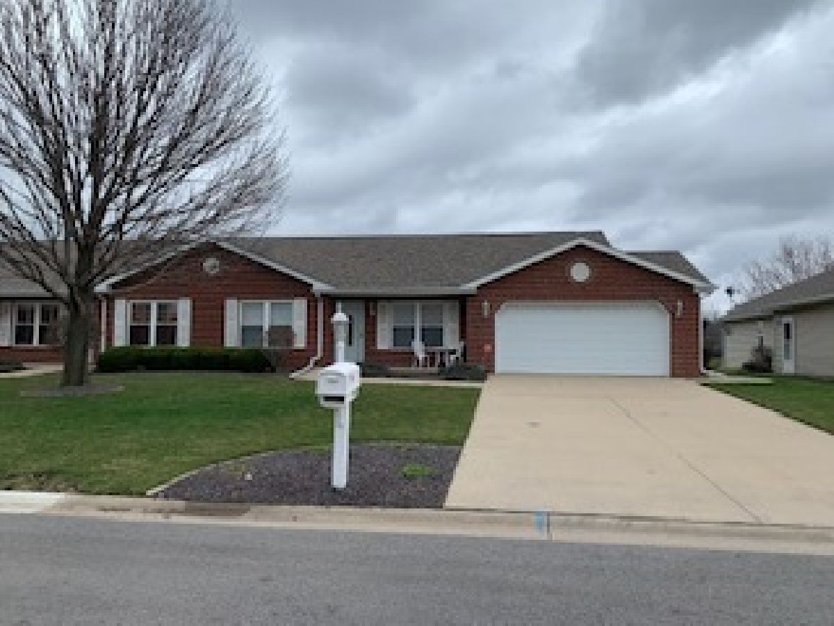 Brick & Vinyl ranch style duplex with unit on the right side. Quarry tile entry with closet opens to irregular shaped carpeted living w/ cathedral ceilings and opens to carpeted dining area that is open to kitchen area w/ quarry tile floors, modern wood cabinets with laminated countertops wood edging, appliances(stove, microwave, refrigerator and disposal, snack bar with 2 stools and recessed lights in kitchen area with dimmers and pantry closet. Hall to bedroom area has closet w/ ceramic tile floor and washer dryer to remain. Carpeted den/family room off dinette area with 3 walls of windows. Carpeted East bedroom with walk-in closet and access to crawl space, bath off bedroom with quarry tile floor, fiberglass walk in shower & vanity w/ marble top. Hall bath w/ quarry tile floors, vanity w/ marble top and fiberglass tub-shower unit. Carpeted west bedroom w/ closet. Attached 2 car garage with electric door operator, closet with gas forced air furnace, central air, hot water heater and humidifier, w/ 200 amp electric service in open garage area. Side door leads to concrete sidewalk to concrete patio in the rear. Alarm system control located in kitchen by door to garage, system owned by seller and will have purchase. Property being sold "AS IS".