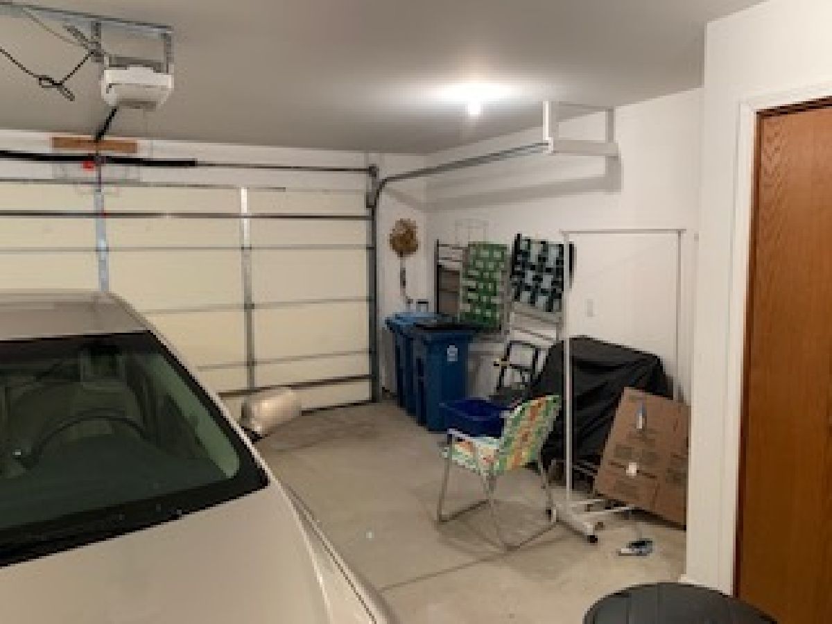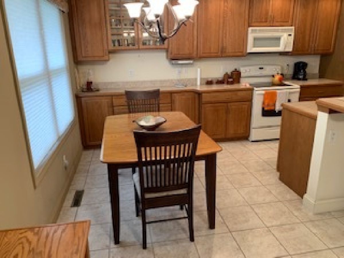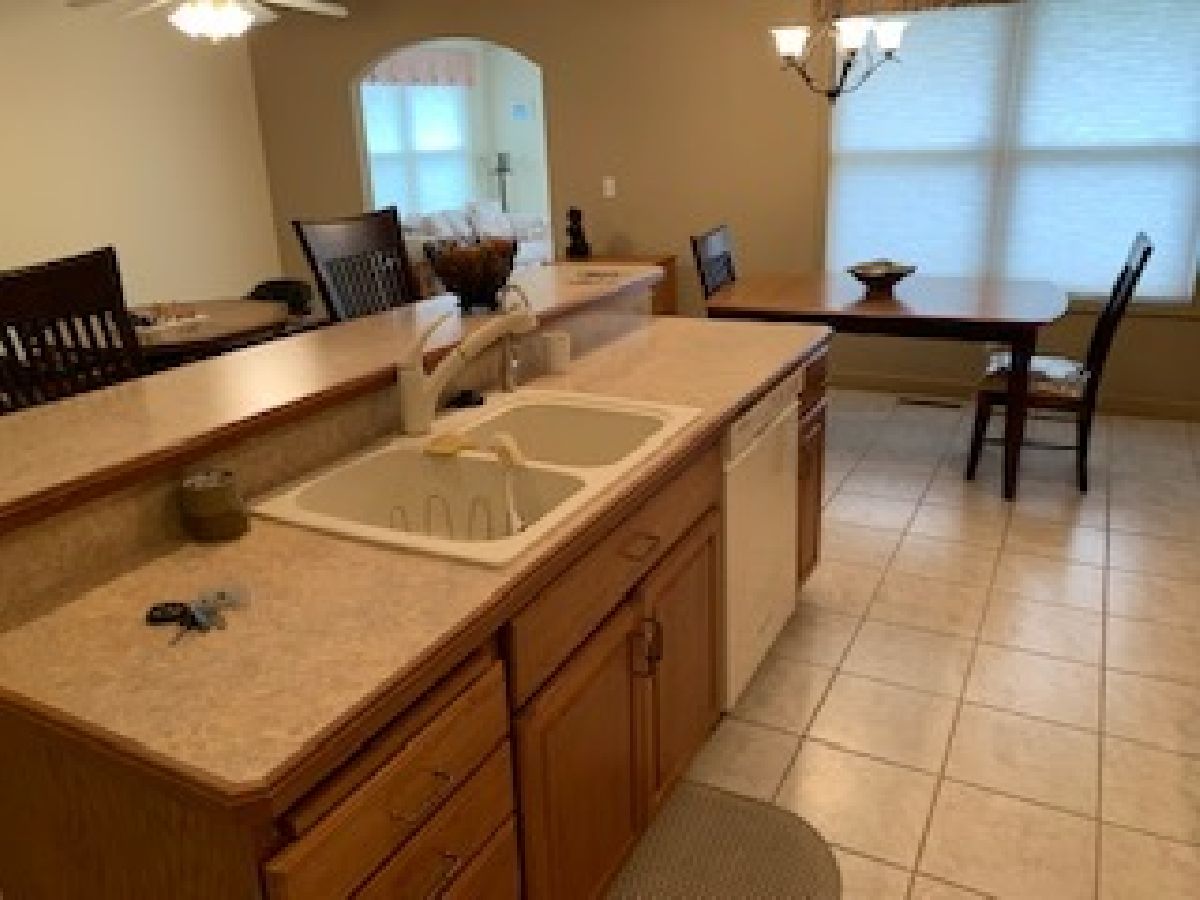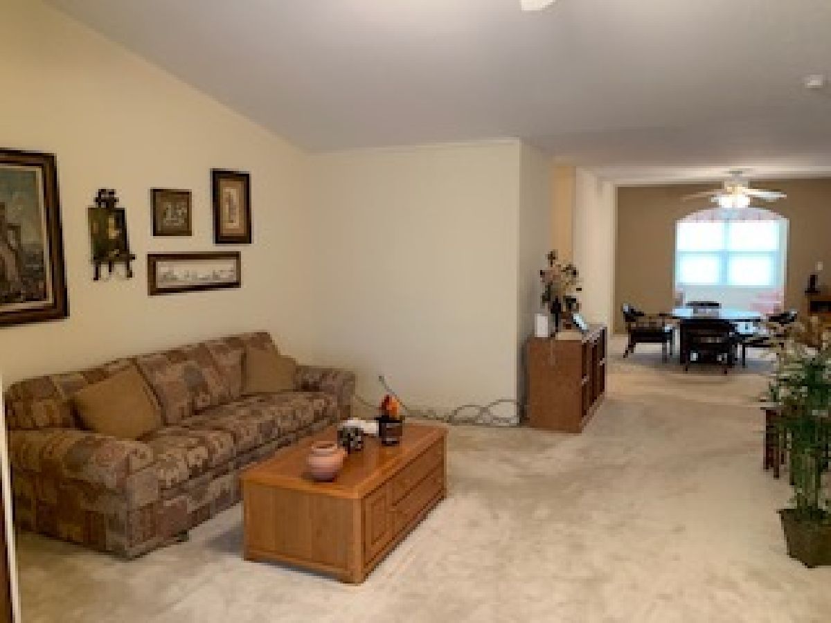 Brick & Vinyl ranch style duplex with unit on the right side. Quarry tile entry with closet opens to irregular shaped carpeted living w/ cathedral ceilings and opens to carpeted dining area that is open to kitchen area w/ quarry tile floors, modern wood cabinets with laminated countertops wood edging, appliances(stove, microwave, refrigerator and disposal, snack bar with 2 stools and recessed lights in kitchen area with dimmers and pantry closet. Hall to bedroom area has closet w/ ceramic tile floor and washer dryer to remain. Carpeted den/family room off dinette area with 3 walls of windows. Carpeted East bedroom with walk-in closet and access to crawl space, bath off bedroom with quarry tile floor, fiberglass walk in shower & vanity w/ marble top. Hall bath w/ quarry tile floors, vanity w/ marble top and fiberglass tub-shower unit. Carpeted west bedroom w/ closet. Attached 2 car garage with electric door operator, closet with gas forced air furnace, central air, hot water heater and humidifier, w/ 200 amp electric service in open garage area. Side door leads to concrete sidewalk to concrete patio in the rear. Alarm system control located in kitchen by door to garage, system owned by seller and will have purchase. Property being sold "AS IS".