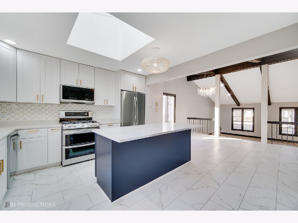 Welcome to this beautifully remodeled 5-bedroom 3 bath home in the heart of Flossmoor. The large foyer opens up into the formal living room with open concept to the dining room and kitchen. The brand-new kitchen is a true highlight, boasting quartz countertops, stainless steel appliances and a breakfast nook. Directly off the kitchen is a massive family room with separate bar, fireplace, skylights and double sliding doors to the back yard. The open and spacious floor plan seamlessly combines the living and dining areas, providing an ideal setting for both relaxation and entertaining with tons of natural light. The main level also includes a bedroom and full bath and laundry room. Upstairs, you'll find 4 spacious bedrooms with ample closet space. The master suite includes a beautifully updated en-suite bathroom with modern fixtures with a walk-in shower and stand alone tub. Other notable features of this home include a two-car garage, central heating & cooling, luxury vinyl flooring throughout the main floor and carpet on the 2nd floor. The home includes new paint, flooring, cabinets, countertops, appliances, HVAC system and fresh landscaping. The home is located close to easy highway access, Metra line, shopping & restaurants. AS-IS Sale.