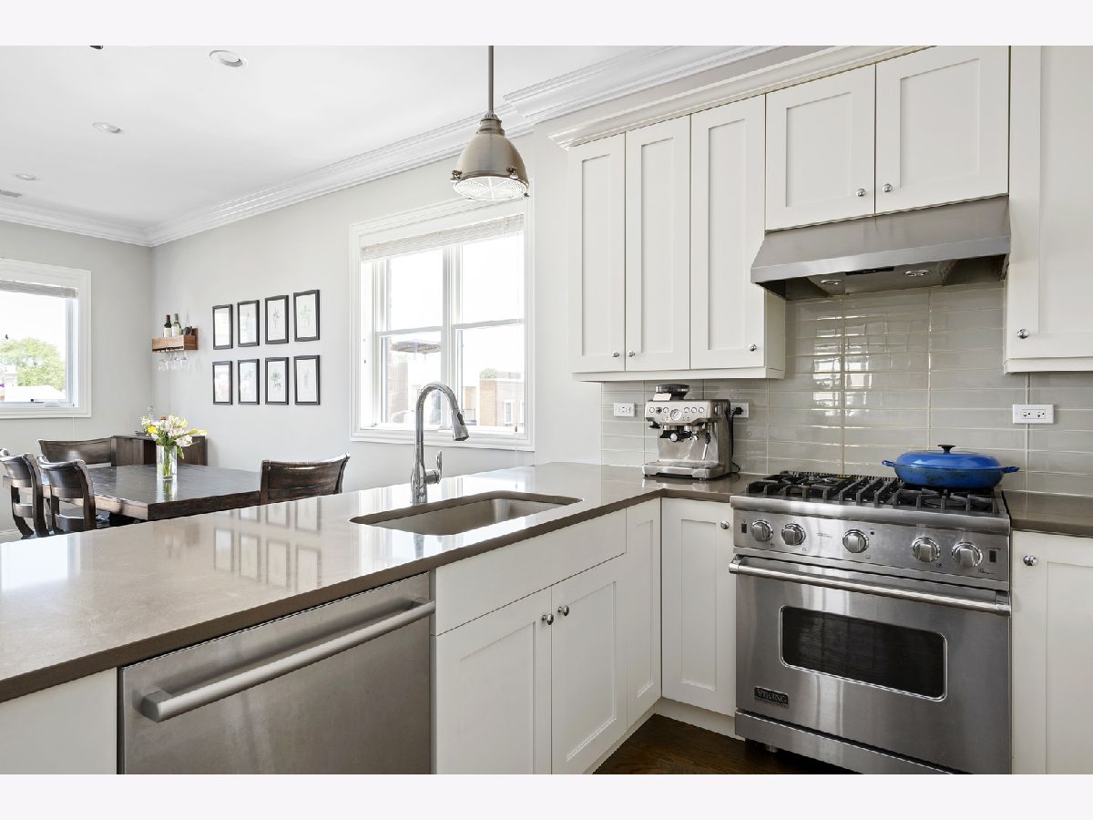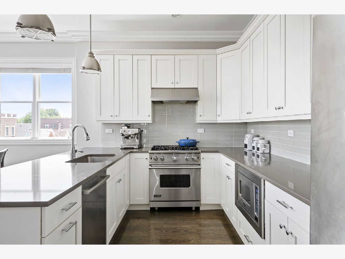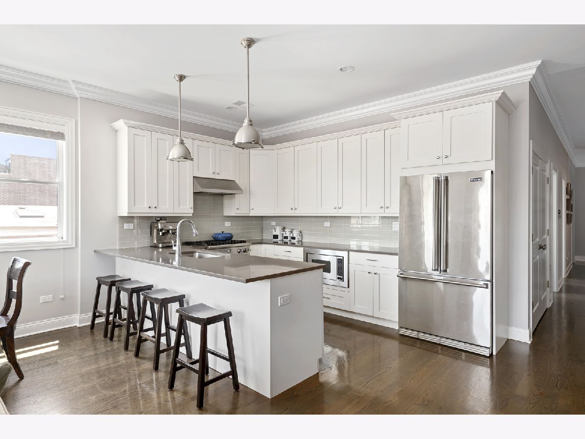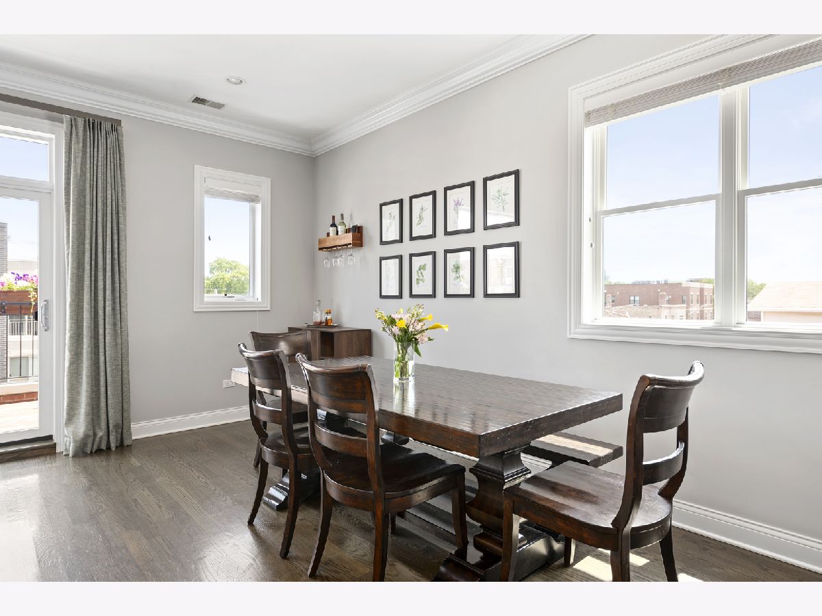 Extra wide 1800 square feet 3 bed 2 bath top floor unit in Roscoe Village! Sitting on an extra wide 28X128 ft lot, this all brick building built in 2015 will not disappoint. The home features a large private roof deck that spans the entire building with skyline views, a wooden pergola, and raised garden beds that include a Bluetooth irrigation system. Additional 2nd deck off of the living room that is perfect for grilling and entertaining. Throughout the home you will find extensive millwork, crown molding, and dark hardwood floors. Enjoy the open floorplan and custom white kitchen with stone countertops, full tiled backsplash & professional Viking appliances. At the front of the unit is a giant living room with a gas fireplace, combined dining area and expansive windows offering tons of sunlight. Head down the hall to two good size bedrooms and full bath with dual vanities. At the back of the unit is the large primary suite with a walk-in closet and primary bath complete with an oversized steam shower, heated floors, and double vanity. 1 garage parking space included and additional storage. This is very conveniently located in the Roscoe Village Neighborhood with quick access to shopping, Hamlin Park, river walk, dog park, kids playscape, restaurants, and downtown within minutes down Clybourn.