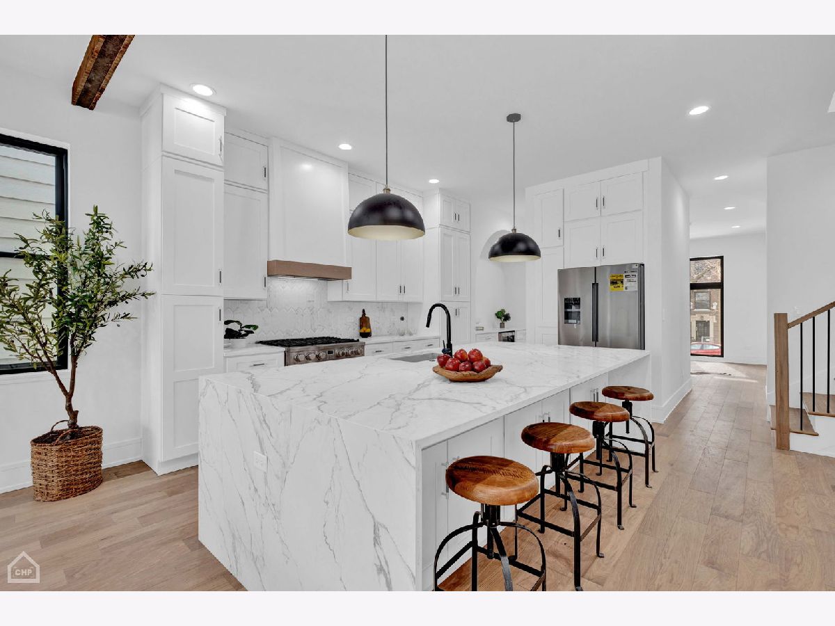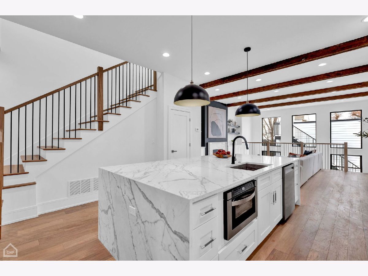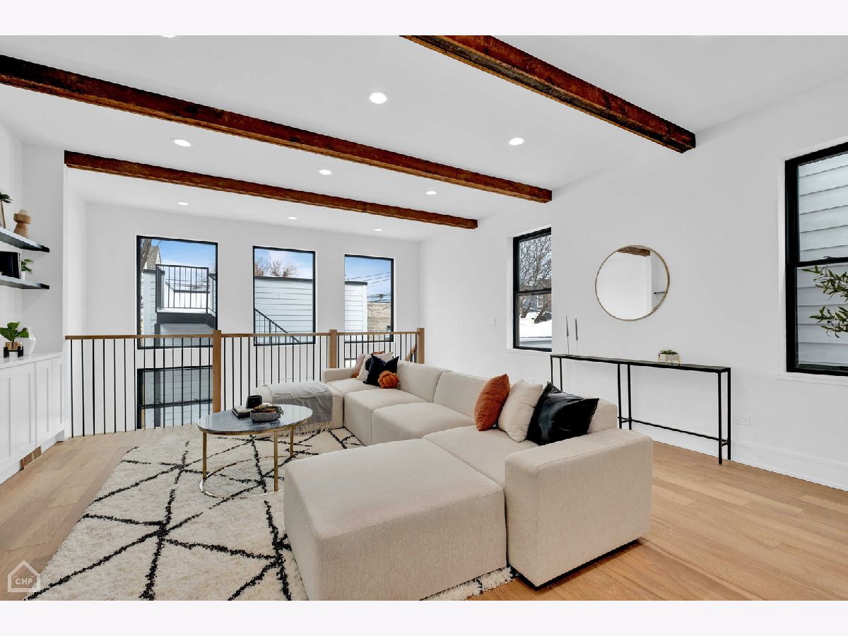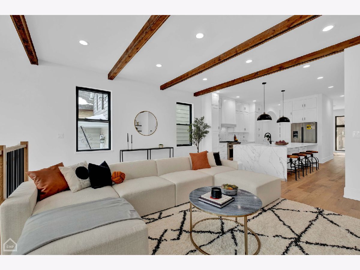 Masterfully rehabbed, 6-bedroom, 3.1-bath Avondale single-family home is a seamless blend of modern luxury and timeless charm. Thoughtfully designed for both comfortable living and elegant entertaining, the home features 4-bedrooms conveniently located on the second level, floor-to-ceiling windows that fill the space with natural light, stunning white oak hardwood floors, and custom millwork throughout. At the heart of the home is the chef's kitchen, a true show stopper with double-stacked custom cabinetry, a handcrafted wood-wrapped hood, a butler's pantry with a wine fridge, a walk-in pantry for additional storage, and a high-end Bosch appliance package. The 5-foot kitchen island, topped with quartz waterfall edges, serves as a functional centerpiece and a bold design element. Flowing effortlessly into the family room with a built-in entertainment center, this space is perfect for hosting or relaxing. The second level boasts a remarkable primary suite with cathedral ceilings, decorative wooden beams, and a MASSIVE dressing room. The spa-like en-suite bathroom is adorned with Calacatta marble tile, a double vanity, and a wet room illuminated by skylights, complete with a soaking tub, rain shower, and handheld body spray. Three additional bedrooms with generous closets and a convenient laundry room with floating shelves complete this level. The lower level is equally impressive, featuring extra tall ceilings, a large rec room with a sleek wet bar, quartz countertops, a wine fridge, and two additional bedrooms with a full bathroom. This versatile space is perfect for guests, a home office, or an exercise room. Outdoor living is elevated with a rooftop deck over the garage, ideal for entertaining, and a brand new two-car garage for added convenience. Other highlights include a mudroom off the rear entrance and an energy-efficient dual-zone HVAC system. Situated just minutes from Logan Square and steps from Avondale's vibrant restaurants, shops, and public transit, this home delivers the perfect combination of modern luxury, comfort, and urban convenience.