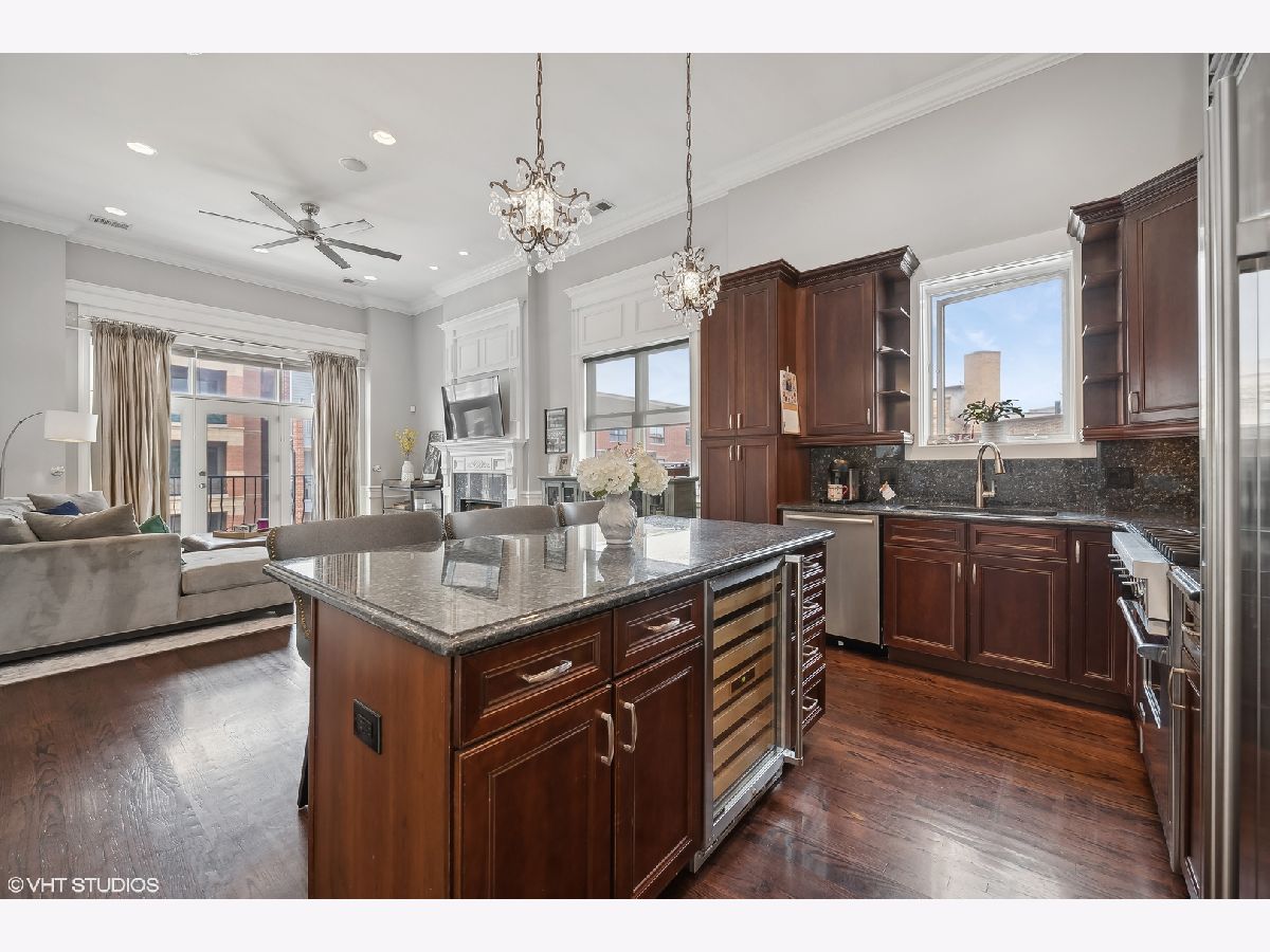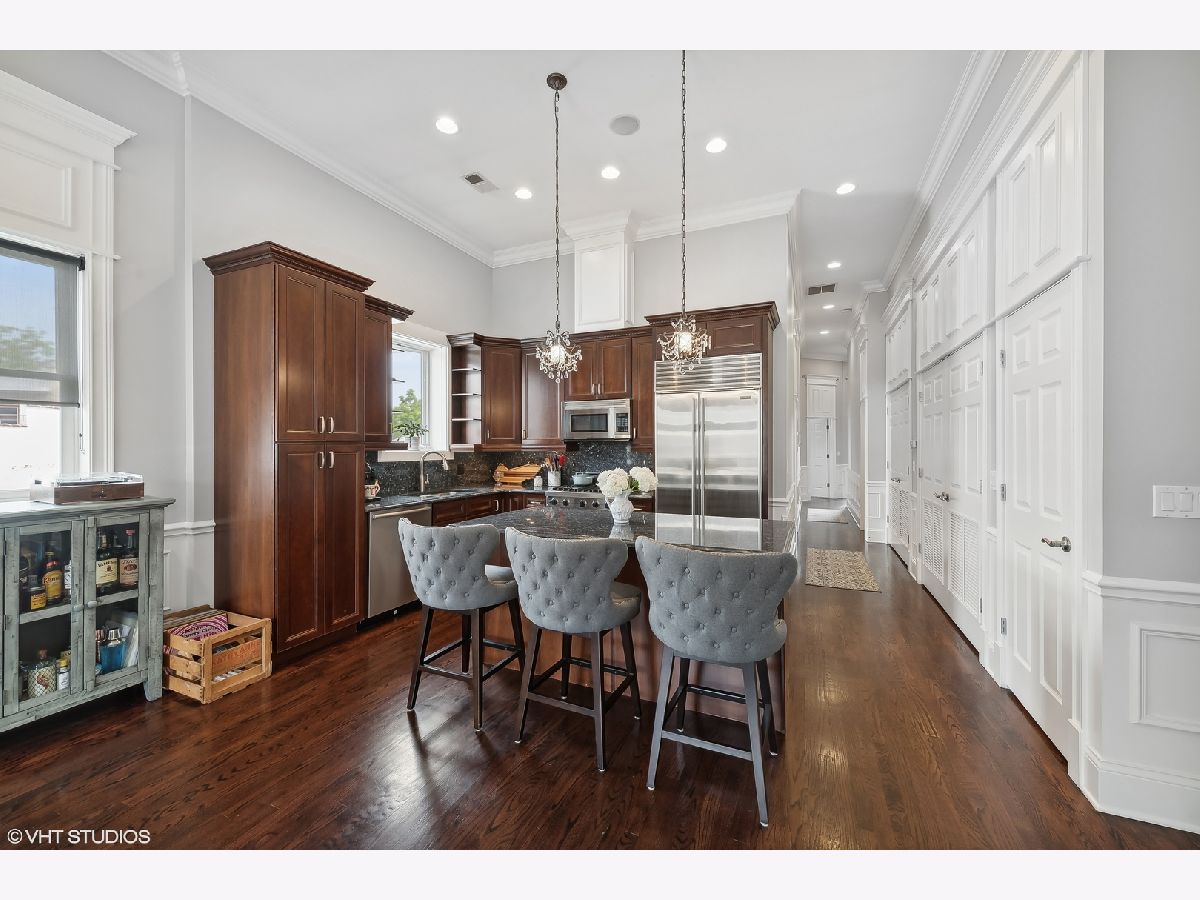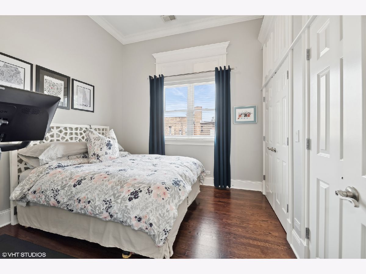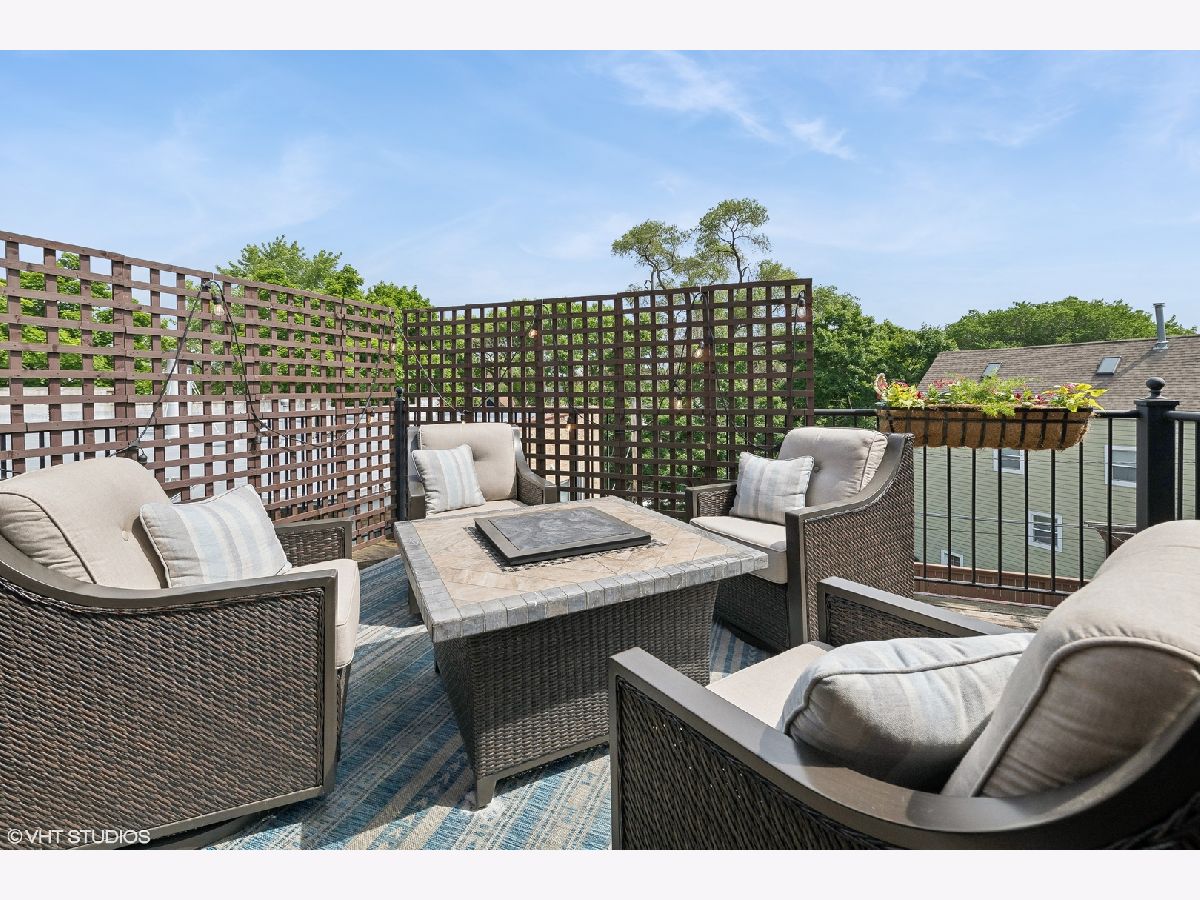 Introducing a stunning penthouse in Roscoe Village, offering 2 bedrooms and 2 bathrooms with soaring 12+ ft ceilings. This impeccably designed residence boasts elegant hardwood floors and custom millwork throughout. The expansive, light-filled living space is perfect for entertaining and intimate moments, featuring a gas fireplace, a large private deck, along with coveted roof rights. The eat-in kitchen is equipped with a large center island, 42" custom wood cabinetry, premium SubZero, Bosch, and Viking appliances, a wine fridge, luxurious stone countertops, and a large pantry. A spacious primary suite offers custom-designed closets and a spa-like bathroom with stone countertops, a deep soaking tub, a separate walk-in shower, double vanity, and a private water closet. Additional features include a side-by-side washer/dryer, low assessments, and an unbeatable location just steps from local Roscoe Village shops, Costco, boutique cafes, renowned dining, and the vibrant Hamlin Park. This sophisticated penthouse combines luxury living with the best of city convenience.