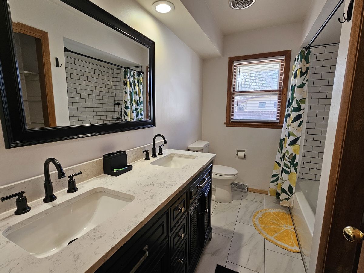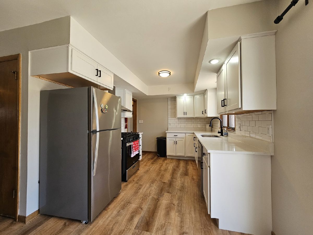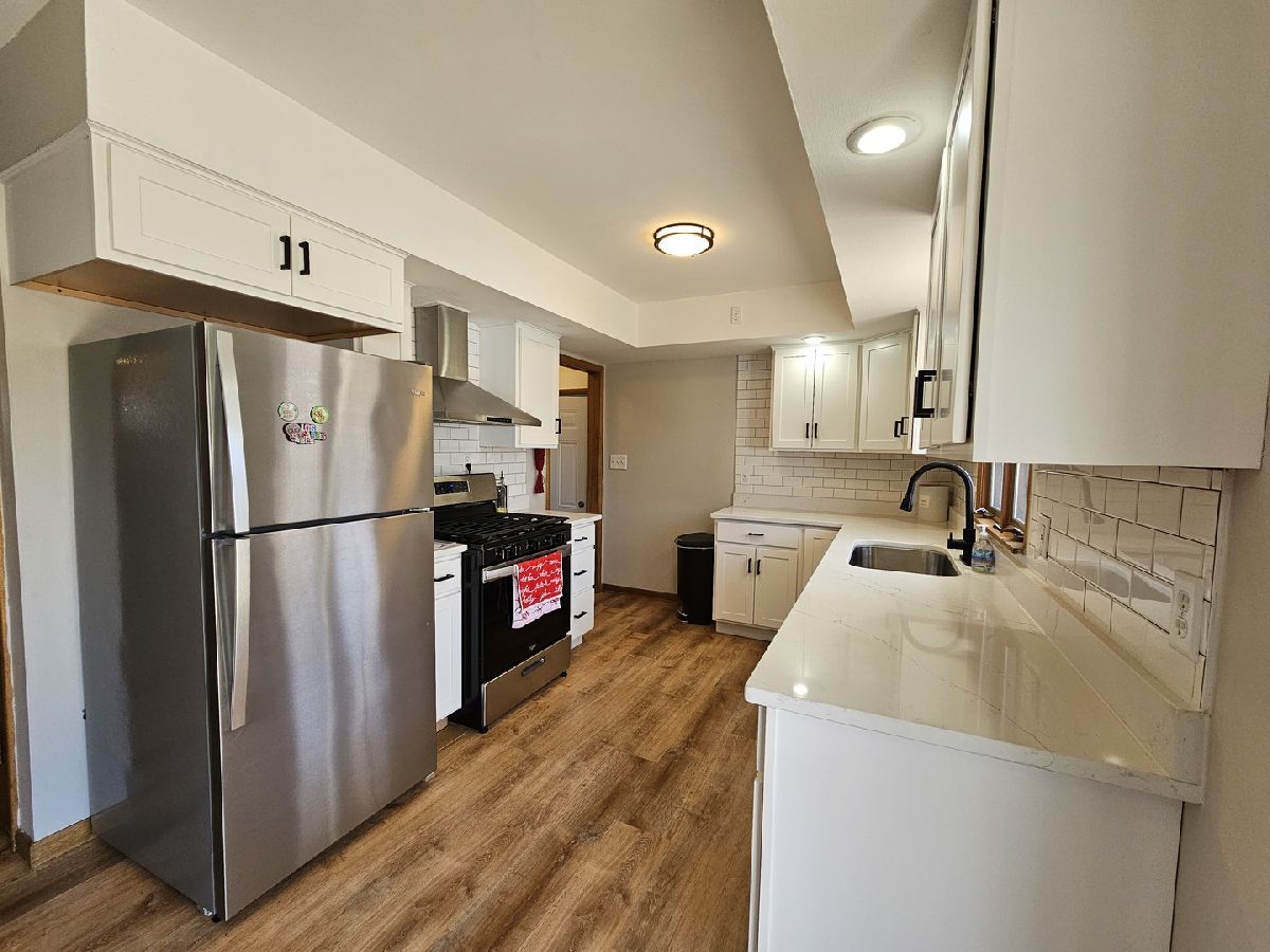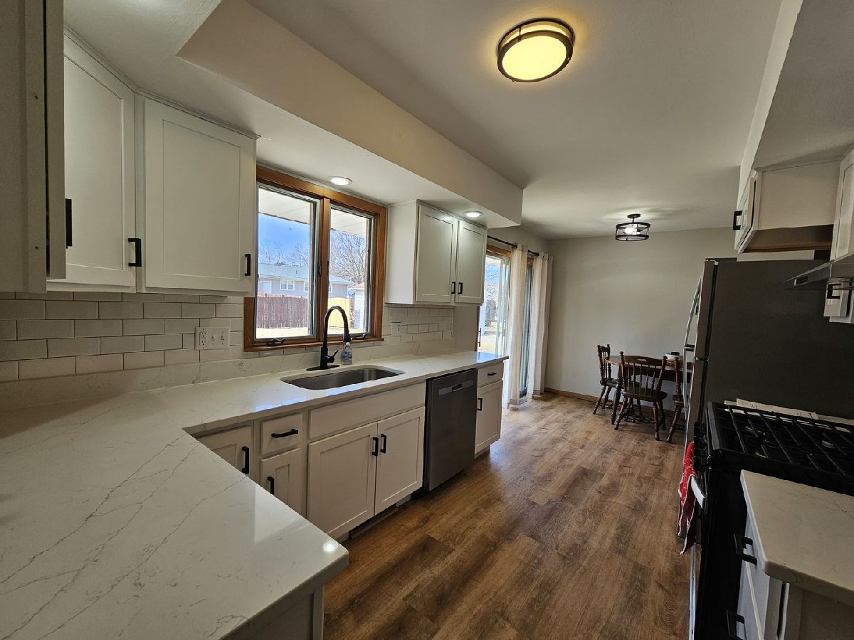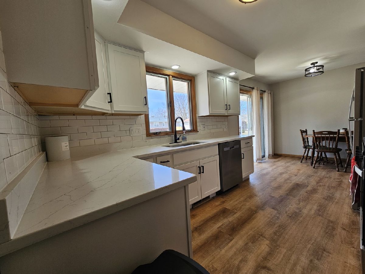 This charming 3-bedroom, 2-bath home in Freeport, IL, beautifully combines modern updates with classic appeal. The kitchen boasts soft-close cabinets, stunning Quartz countertops, and luxury vinyl flooring that flows seamlessly into the living and dining areas. Refinished hardwood floors enhance each bedroom, adding warmth and sophistication. The main-floor bathroom features a stylish tile shower, a double vanity, and the convenience of first-floor laundry hookups. Downstairs, the partially finished basement offers a cozy rec room with a wood-burning fireplace and a bar-perfect for entertaining. A spacious two-car garage completes this inviting home, situated on a peaceful street with easy access to local amenities.