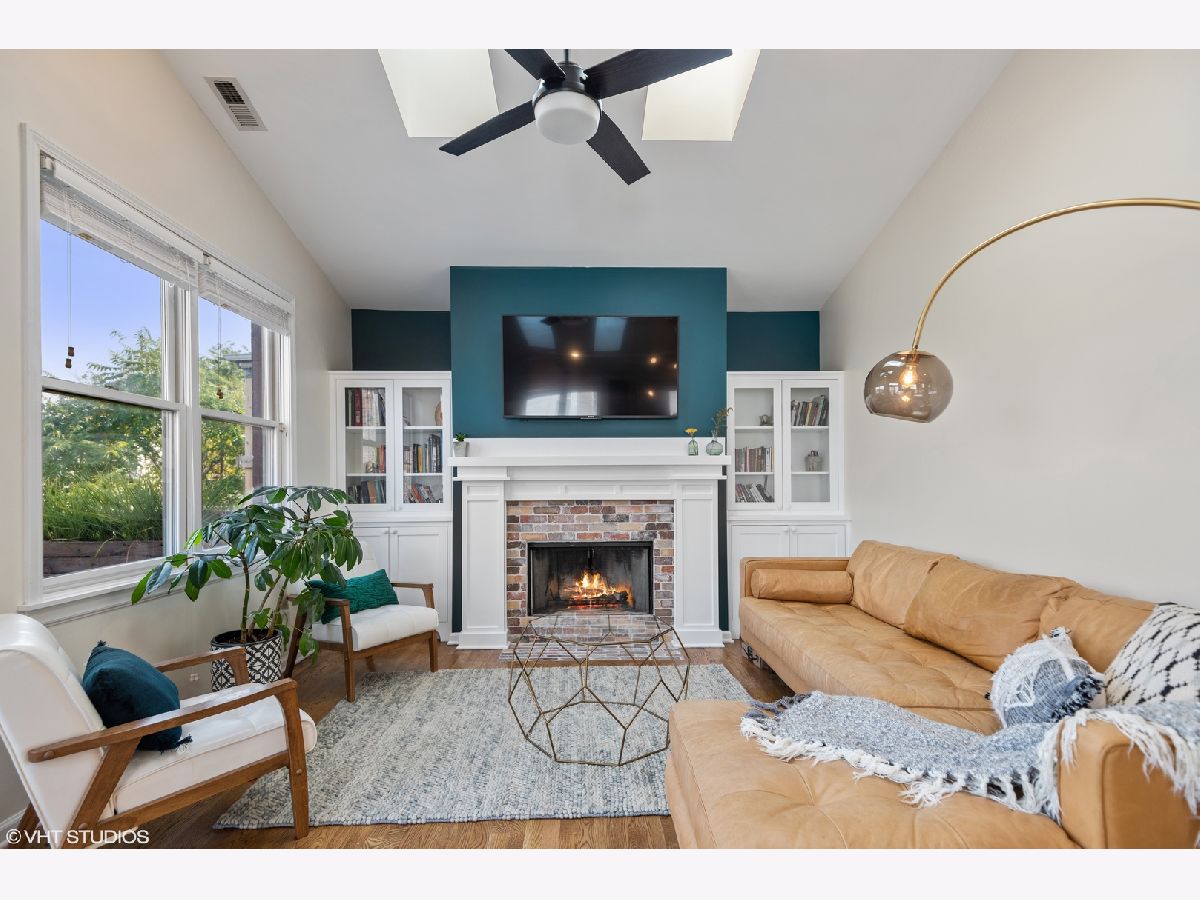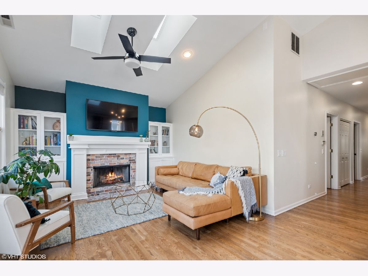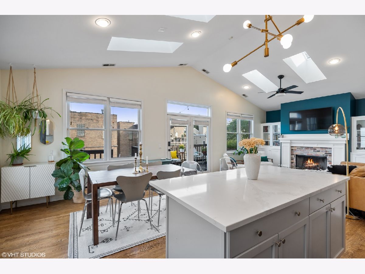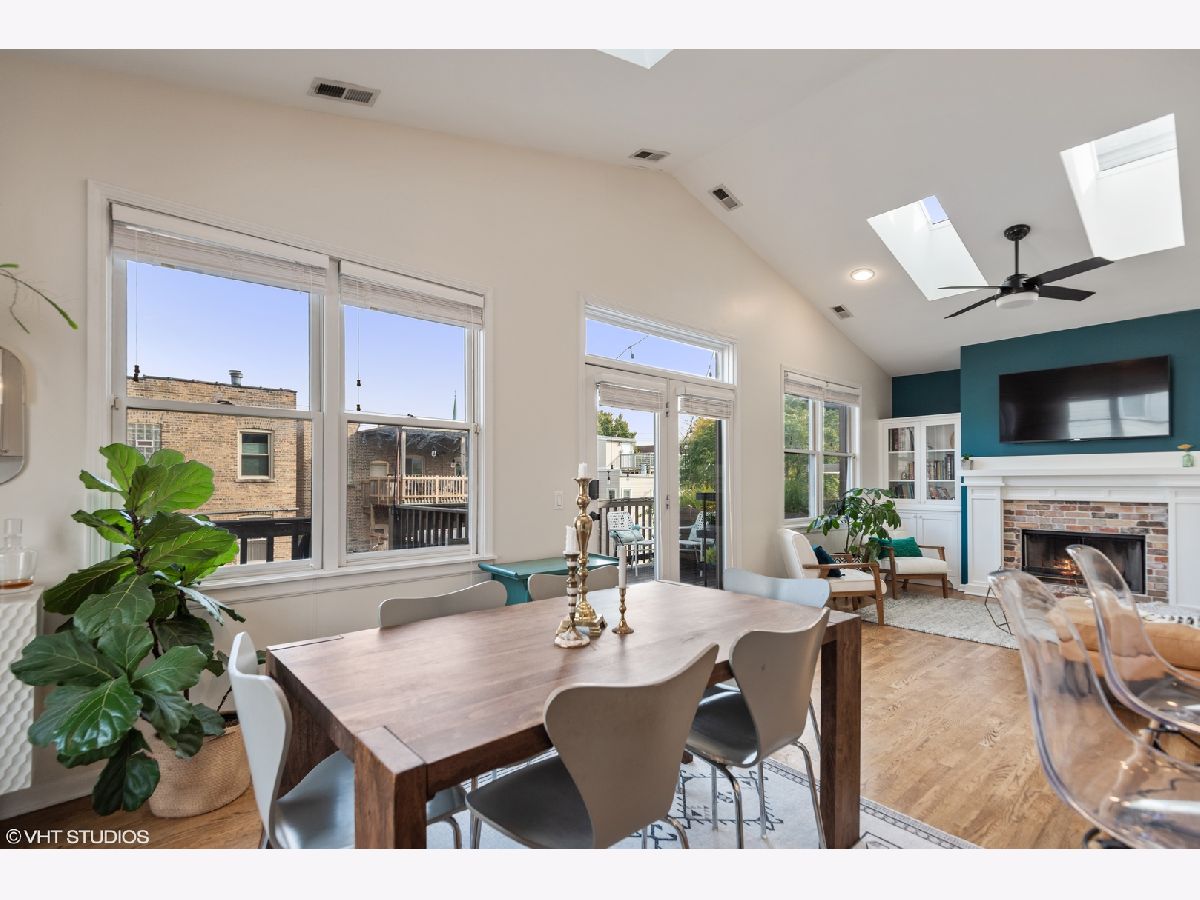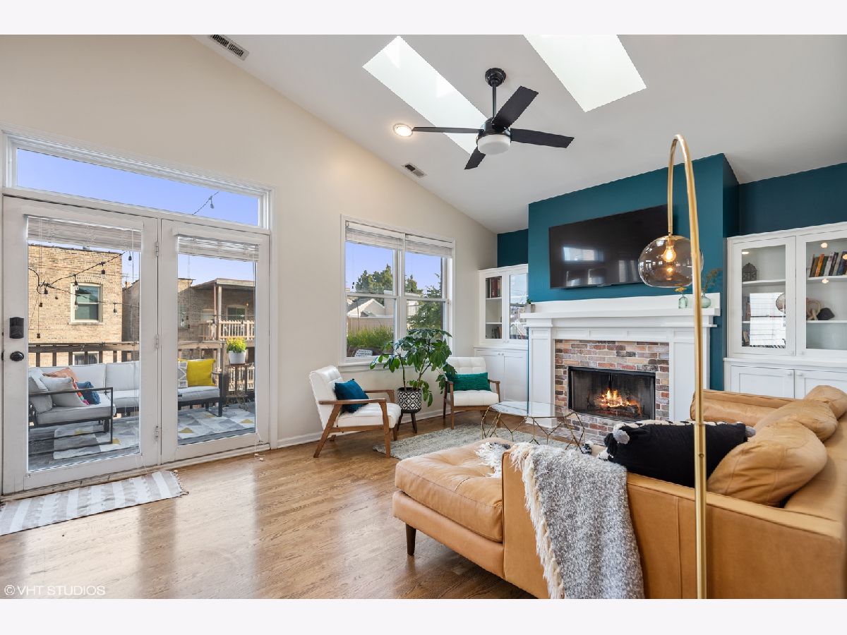 Light pours into this extra-wide 3bd/2ba top floor unit built by renowned luxury builder Environs. A private staircase entrance off the 2nd floor leads up to the spacious entryway w/ ample closet space, opening up into one of TWO living areas featuring an updated cozy fireplace w/ shiplap, custom built-in shelves and marble tiled hearth. The back living area adjoins the dining room and tastefully updated kitchen, drenched in sunlight coming through the 4 large skylights set in vaulted ceilings, and sliding doors leading onto your large private deck. The primary bedroom features dual closets and completely remodeled ensuite bath w/ large walk-in shower and double vanity. The sizeable 2nd and 3rd bedrooms offer plenty of closet space and perfect location for office or guest bedroom, murphy bed included! 2nd full bathroom w/ tub recently refreshed with trendy wallpaper, modern fixtures, and floating vanity. One garage parking spot included in the price. Conveniently located to shops, restaurants, CTA Red,Brown,Purple train and Belmont Bus line, parks and more!
