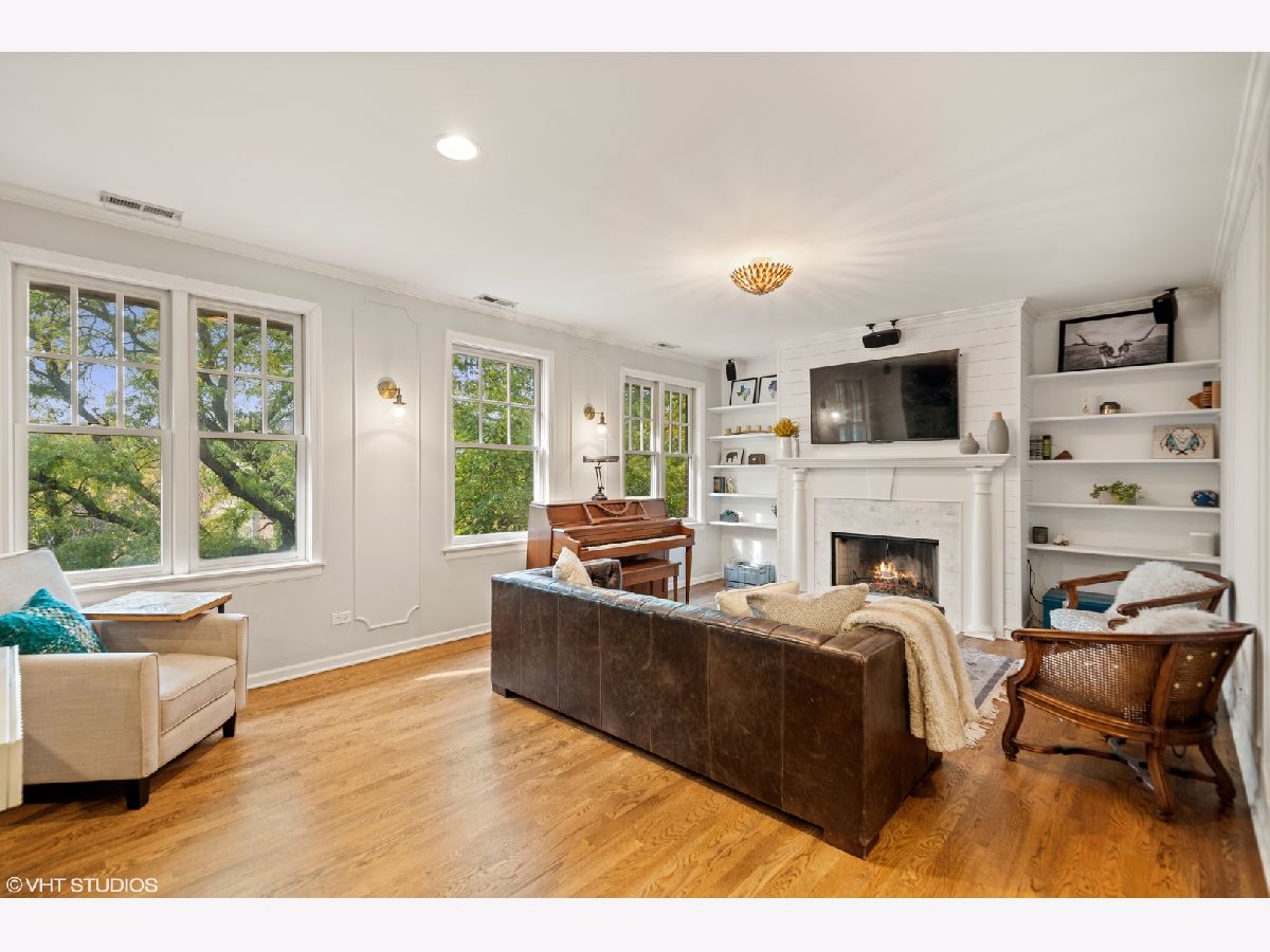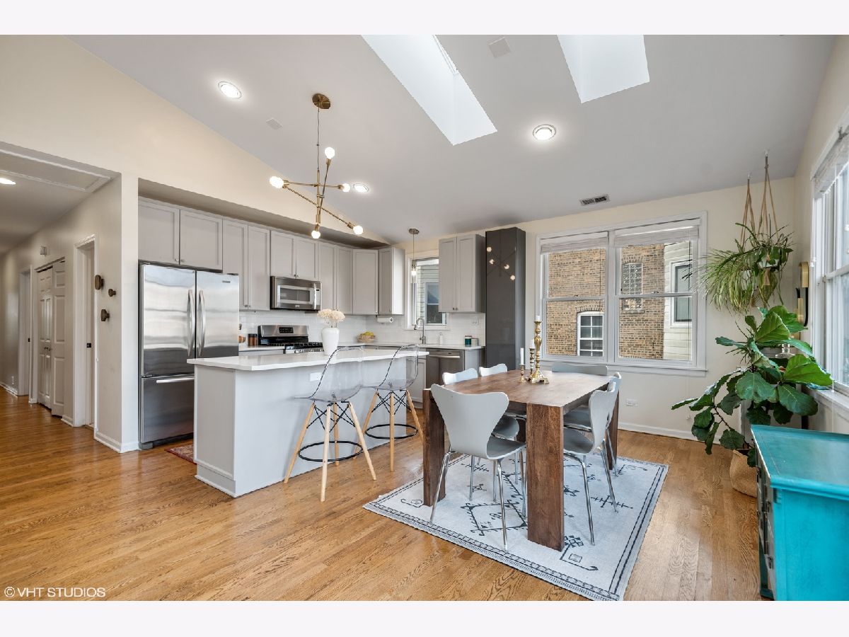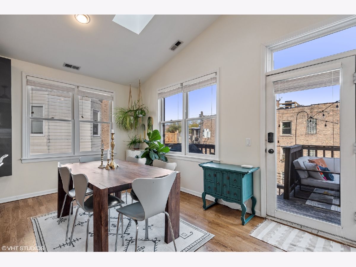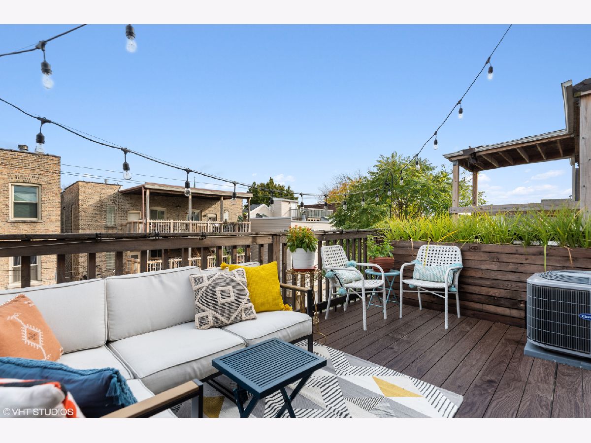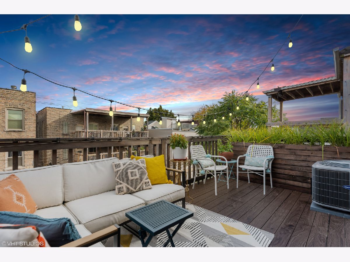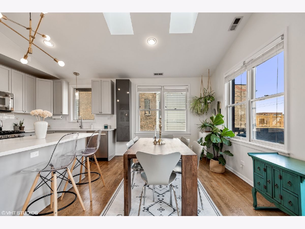 Light pours into this extra-wide 3bd/2ba top floor unit built by renowned luxury builder Environs. A private staircase entrance off the 2nd floor leads up to the spacious entryway w/ ample closet space, opening up into one of TWO living areas featuring an updated cozy fireplace w/ shiplap, custom built-in shelves and marble tiled hearth. The back living area adjoins the dining room and tastefully updated kitchen, drenched in sunlight coming through the 4 large skylights set in vaulted ceilings, and sliding doors leading onto your large private deck. The primary bedroom features dual closets and completely remodeled ensuite bath w/ large walk-in shower and double vanity. The sizeable 2nd and 3rd bedrooms offer plenty of closet space and perfect location for office or guest bedroom, murphy bed included! 2nd full bathroom w/ tub recently refreshed with trendy wallpaper, modern fixtures, and floating vanity. One garage parking spot included in the price. Conveniently located to shops, restaurants, CTA Red,Brown,Purple train and Belmont Bus line, parks and more!