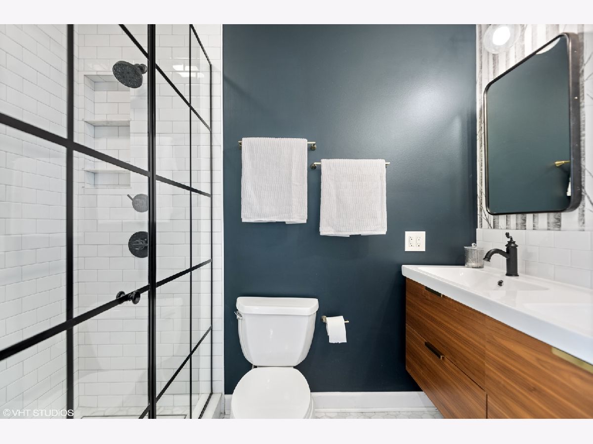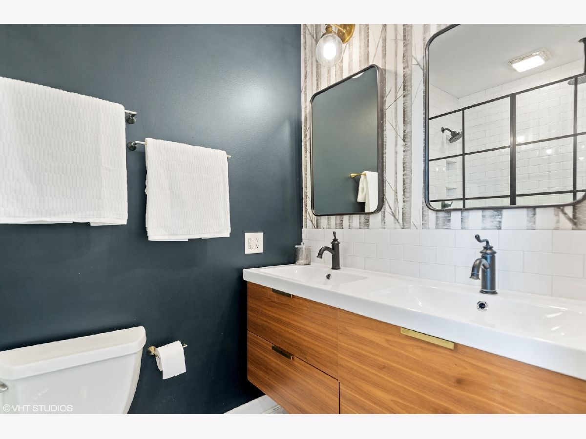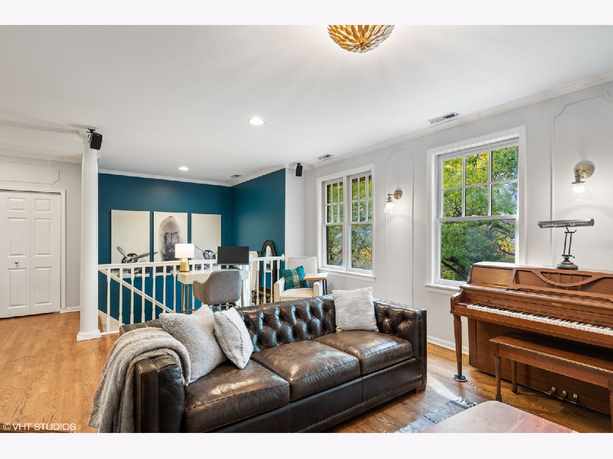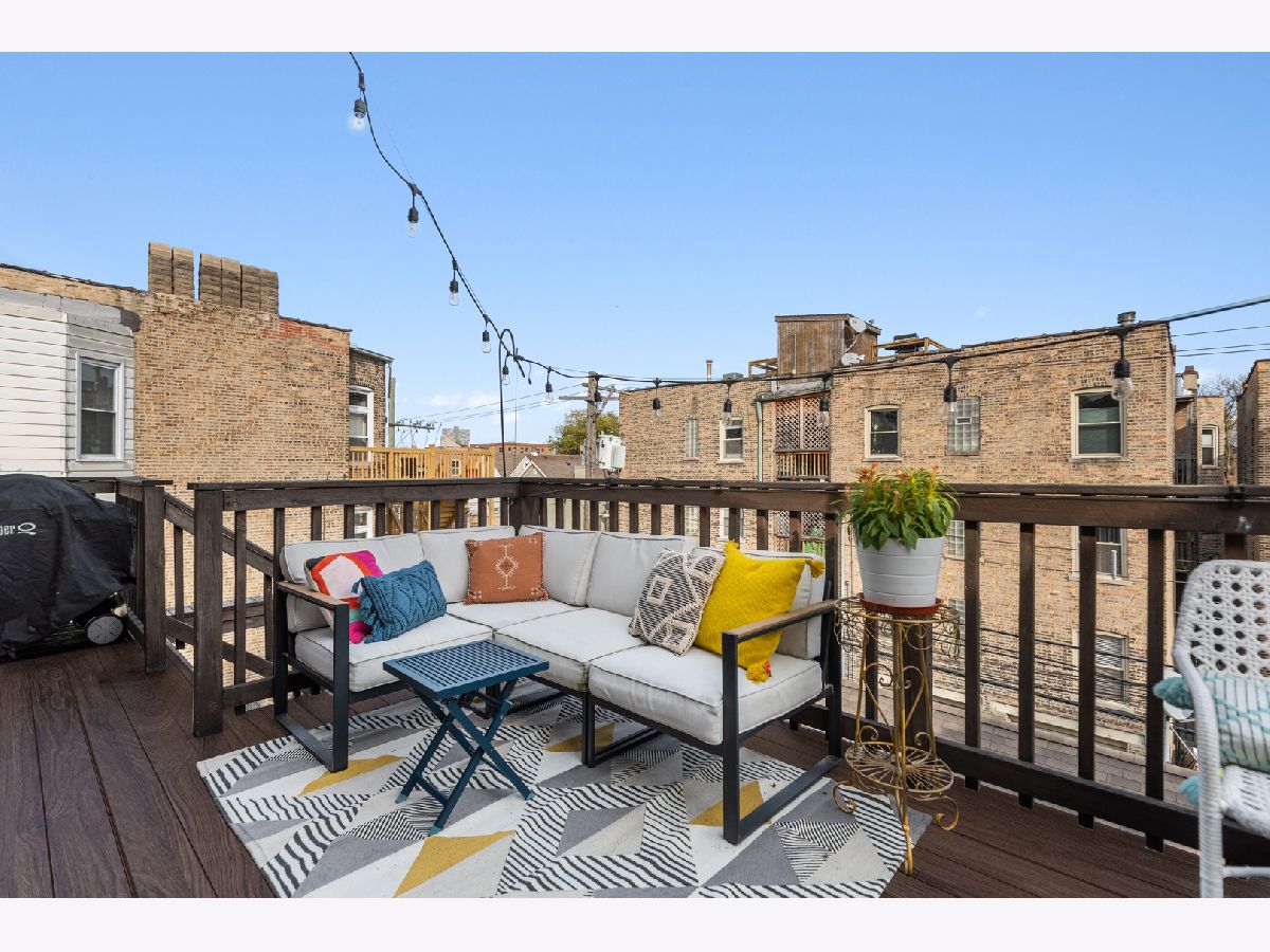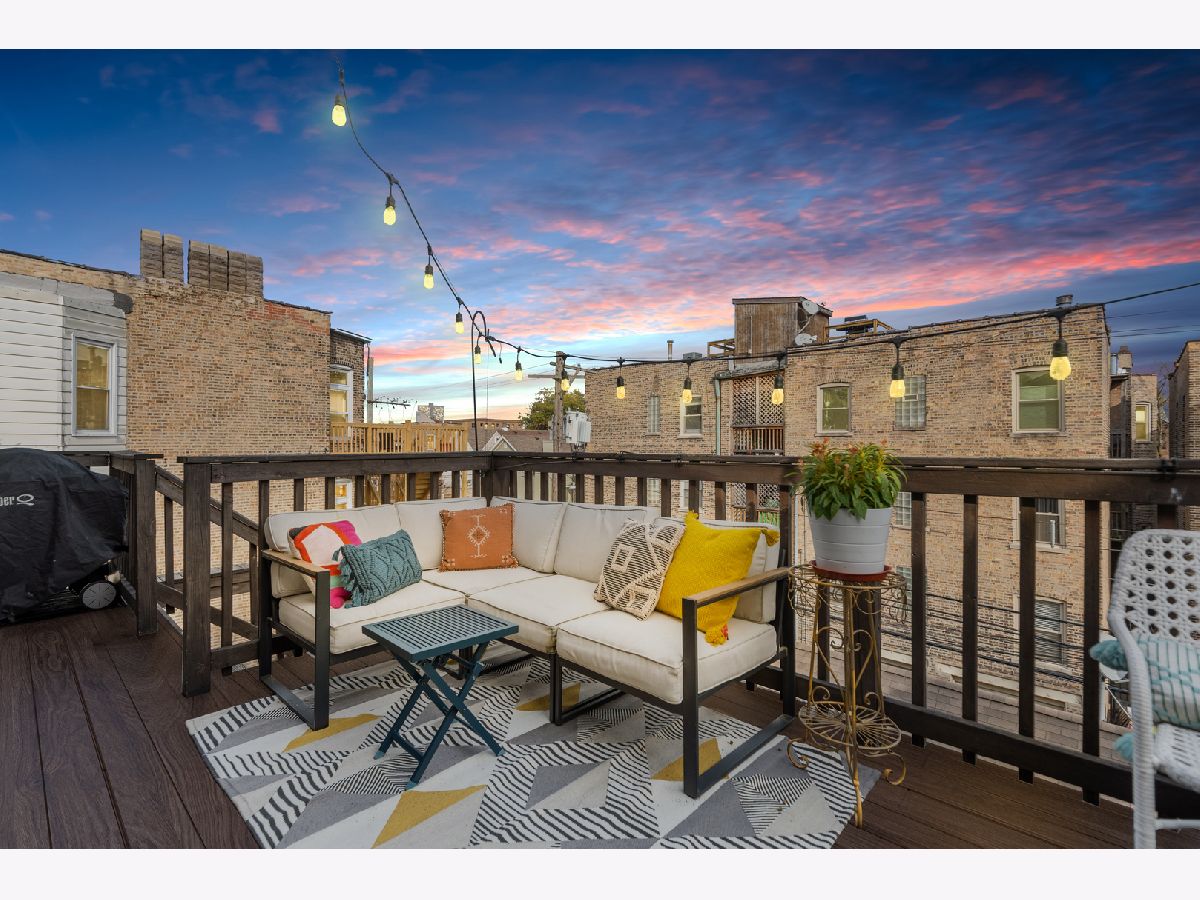 Light pours into this extra-wide 3bd/2ba top floor unit built by renowned luxury builder Environs. A private staircase entrance off the 2nd floor leads up to the spacious entryway w/ ample closet space, opening up into one of TWO living areas featuring an updated cozy fireplace w/ shiplap, custom built-in shelves and marble tiled hearth. The back living area adjoins the dining room and tastefully updated kitchen, drenched in sunlight coming through the 4 large skylights set in vaulted ceilings, and sliding doors leading onto your large private deck. The primary bedroom features dual closets and completely remodeled ensuite bath w/ large walk-in shower and double vanity. The sizeable 2nd and 3rd bedrooms offer plenty of closet space and perfect location for office or guest bedroom, murphy bed included! 2nd full bathroom w/ tub recently refreshed with trendy wallpaper, modern fixtures, and floating vanity. One garage parking spot included in the price. Conveniently located to shops, restaurants, CTA Red,Brown,Purple train and Belmont Bus line, parks and more!