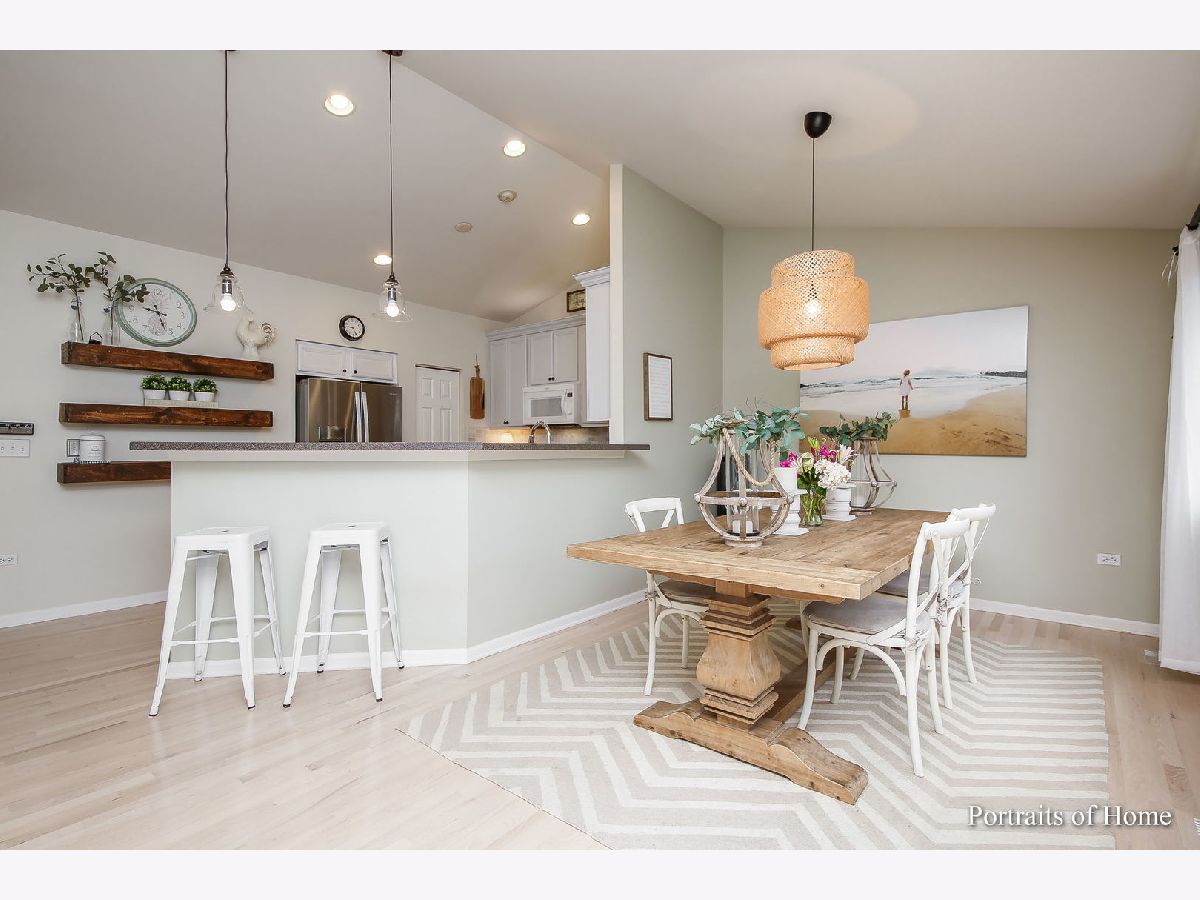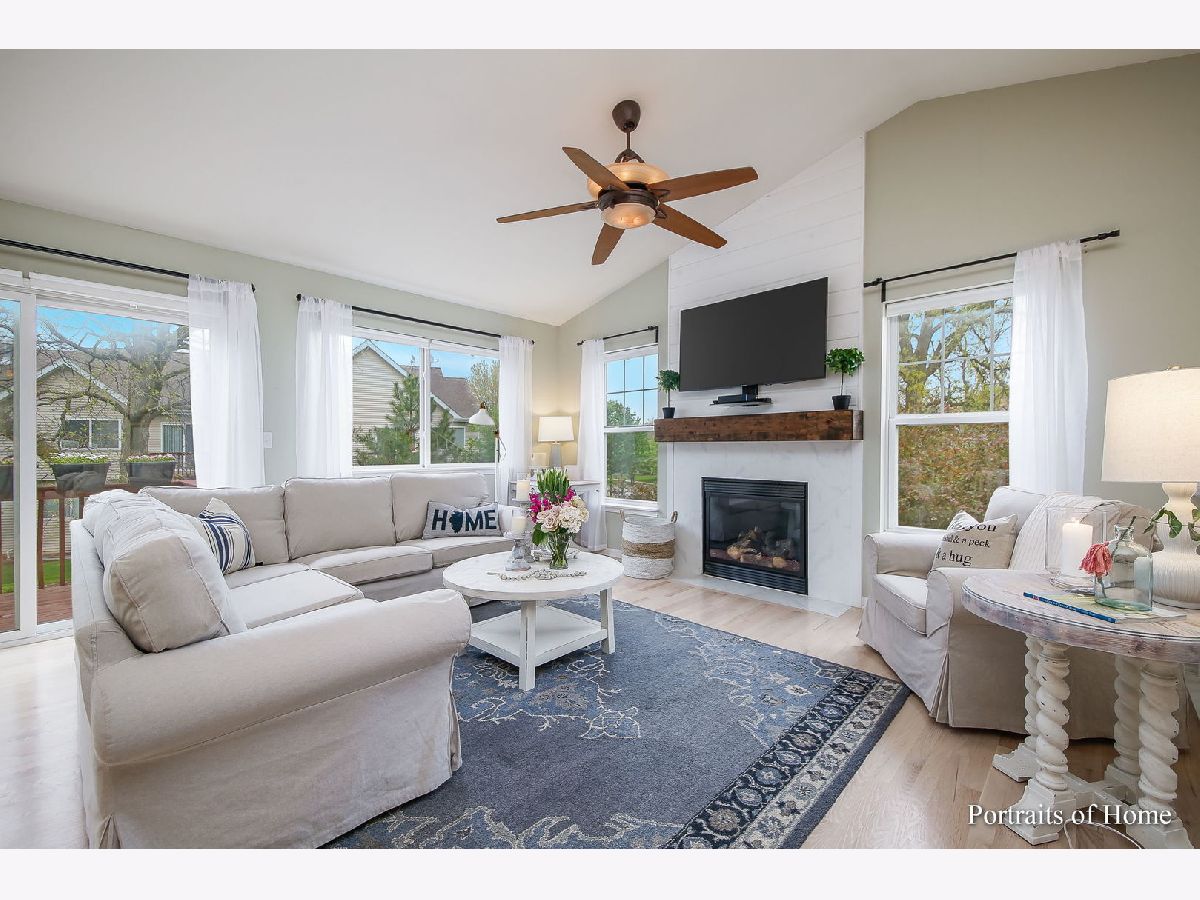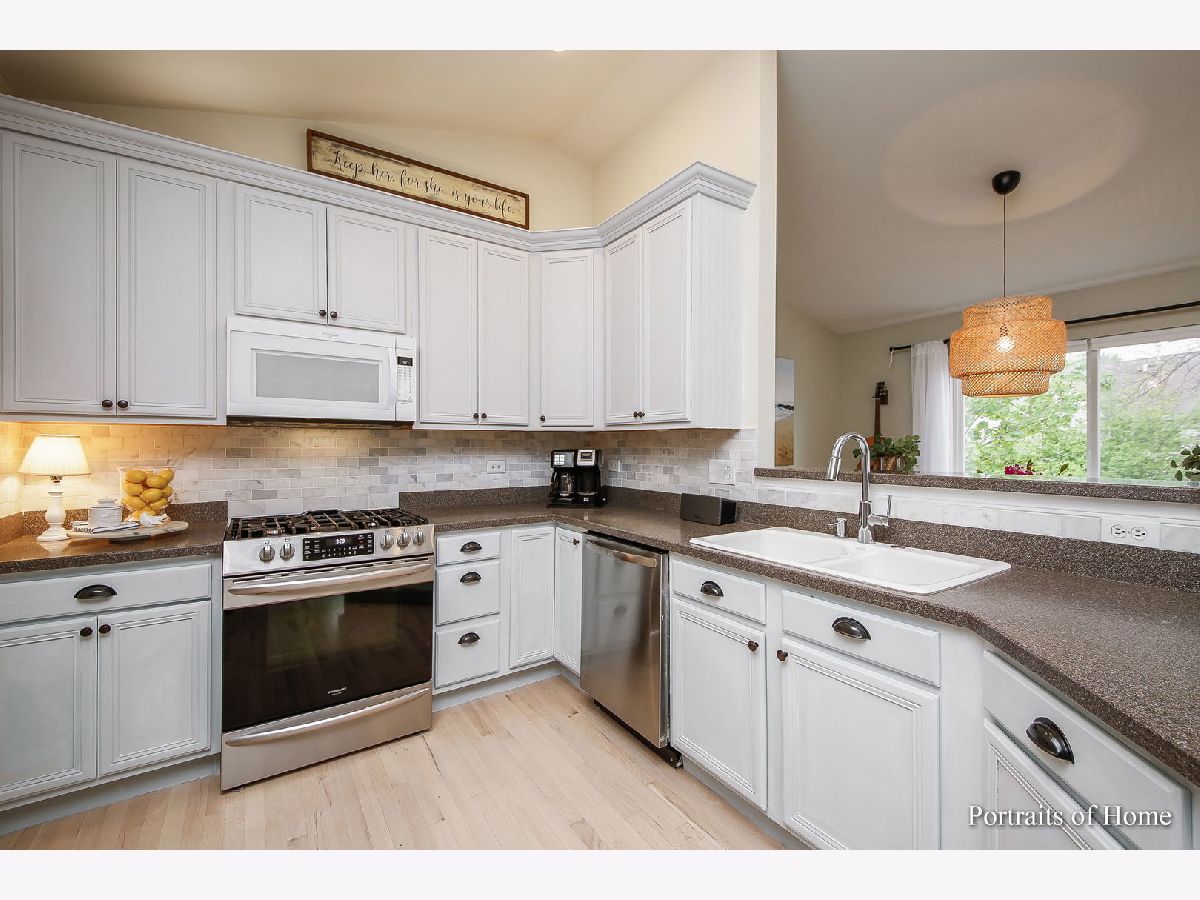 Pottery Barn HGTV Beauty Combined. END UNIT with ton of windows, white woodwork and multiple panel doors. I can hear you now sigh, and think WoW I can live here! Not only that, but it's 2 doors away from single family homes and backs to a beautiful wooded walking path. I don't know where to start, the newly redone whitewash oak floors, and you can't help but notice the vaulted ceilings in Living room, dining room and kitchen. Living room has a beautiful rustic beam mantel flanked by 2 large windows, (Just a flip of a switch to turn gas on) Large kitchen with 42" tall cabinets with crown molding, breakfast bar for 4-6, stainless steel appliances stay, top grade 5 burner gas slide in stainless steel stove with all the bells and whistles like a built-in air fryer, beam shelving stay, Dining room has double patio door to enjoy the views of the walking path. Large master bedroom with triple windows, has accent wall of shiplap, beautiful lighting, walk in closet, on suite has soaking tub, separate shower with clear doors and double vanity. Powder room with new vanity, shiplap, sophisticated wallpaper, new lighting. 3rd bedroom has 2 large windows, walk in closet. 2nd full bath is equally as beautiful. Laundry room has built in wall paneling with coat hooks and plenty of space to move. Family room has a second fireplace!! loads of windows and patio doors to covered patio to enjoy the views of walking path. Not done yet, unfinished basement with rough in plumbing in case you want even more space.