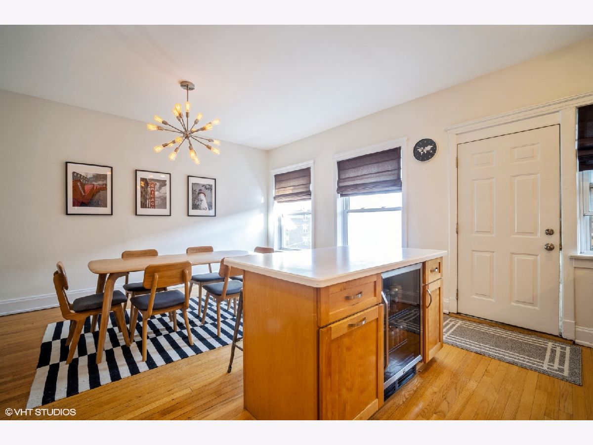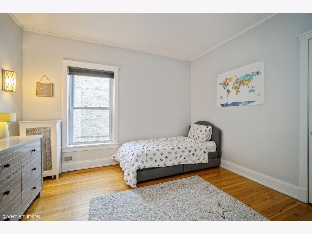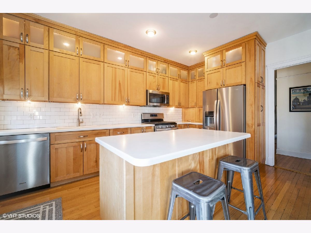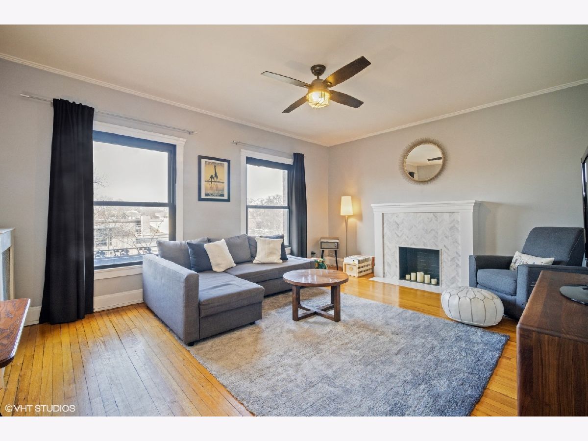Light and bright well maintained 3 Bedroom top floor condominium is perfectly located just blocks from Lake Michigan beaches and parks and across the street from highly ranked Lincoln Elementary School! Large Living Room with lots of light, hardwood floors and decorative fireplace with chevron patterned carrara marble surround (2017) and bright floor and ceiling trim welcomes you as you enter the home. 3 bedrooms with hardwood floors and large closet spaces. Beautifully remodeled extra large open Kitchen and dining area with a wall of floor to ceiling wood cabinets, corian countertops, newer stainless steel appliances side-by-side refrigerator/freezer, microwave, gas oven/range, and dishwasher, (new in 2021), center island with a wine fridge/beverage cooler, (new in 2019) is perfect for entertaining. Exterior Kitchen door (with newer "Larson" full view back storm door with stowaway screen) leads to back patio deck for outdoor nights. Upgraded bathroom with tub and shower, newer toilet, sink/vanity, fixtures, mirrors, lighting and tile surround with glass door (2017). There is also a large extra deep hall closet for ample storage. Newer neutral paint. Hardwood floors through out. Large 10 x 10 basement storage for this unit included. 3 window air conditioners included. Close to restaurants, shopping, Trader Joe's, Starbucks. Easy access to both CTA El, Metra, and Pace Bus routes. A walker's dream! Don't miss this one!