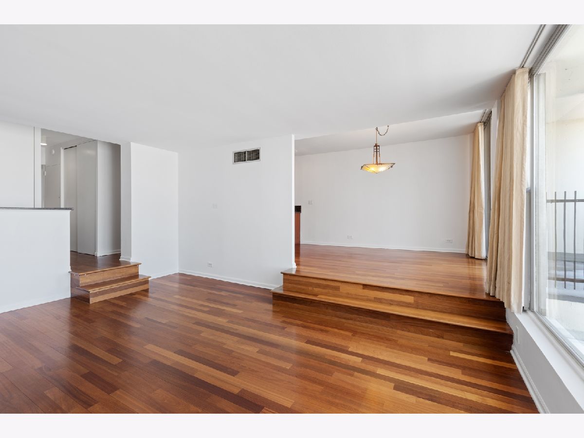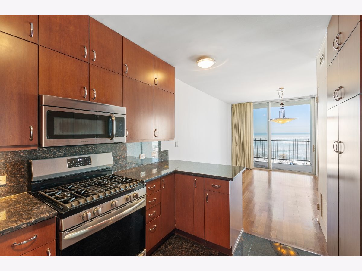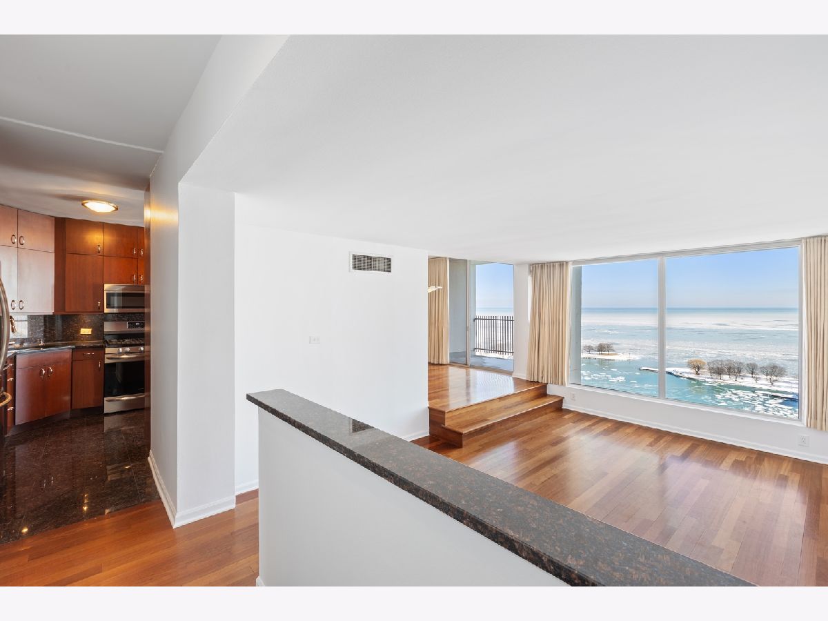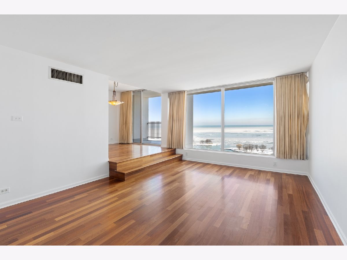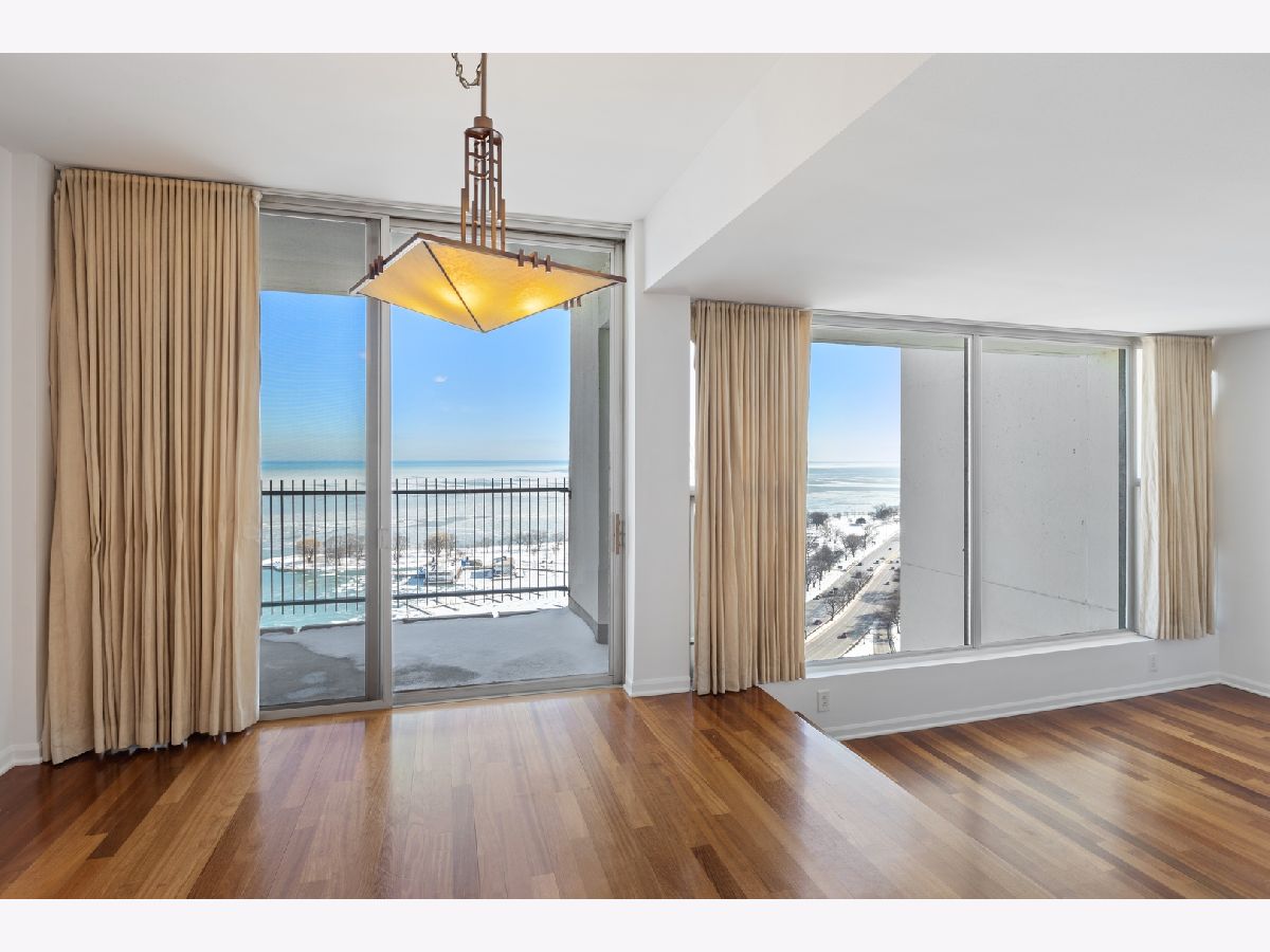 This beautiful open home with expansive lakefront views, large picture windows and southeast light, has a dream location for Chicago living and is the perfect, move-in ready 2 bedroom, 2 bath. Gleaming hardwood floors throughout and recently expertly painted "Benjamin Moore super white," 9-foot ceilings with dramatic sunken living room and dedicated dining space that overlooks the balcony and lakefront. Thoughtful kitchen with newer stainless steel appliances and to-the-ceiling cabinets - more storage than you'll find anywhere - and granite countertops, backsplash and flooring. Designer closets and master bath with perfect porcelain tiling throughout. Both well-sized bedrooms with unobstructed city views. Live the life in this architectural-inspired lakefront building with three towers, few hallways, and little wasted space, renowned for its striking facade. Well-managed, dog-friendly with gym, pool, "lakeview" room, exceptional valet parking, package service and on-site management. Easy transit location. Enjoy everything the city has to offer - as well as nature and sports - close to the park, lakefront, marina, yacht club and tennis and golf and nearby restaurants.