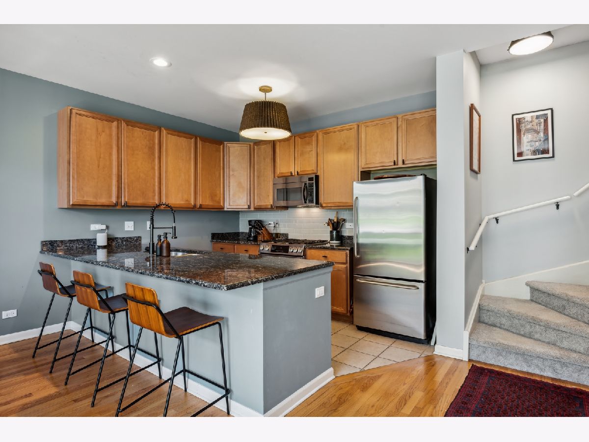 Absolutely impeccable 2 bedroom 2.5 bath Avondale townhome. The coveted Belmont River Club offers the quiet stillness of the suburbs with easy access to all of Chicago's action. The pathways, trees, and river culminate to provide a sanctum away from city chaos. Garage parking (with tandem space) and private access all lead into the foyer of the home. This room is perfectly set up to accommodate a home office and keep your work-life out of sight. You can happily overlook your front yard garden. The hardwood floors continue up into the living room and boast a wide layout with an open concept kitchen and dining room. The newly installed backsplash, stainless steel appliances, and abundant counter space make your home THE spot for entertaining. Both bedrooms offer private ensuite access. The large primary bedroom offers side-by-side vanities and dual walk-in closets. One closet is currently set up as an adorable nursery while the other is decked out with custom built-ins. The top-floor bedroom has plenty of storage and a large east-facing balcony perfect for catching the morning sun on lazy days. Easy access to 90/94, Marianos, Roscoe Village, Honey Butter Fried Chicken, and James Beard darling restaurant Parachute.