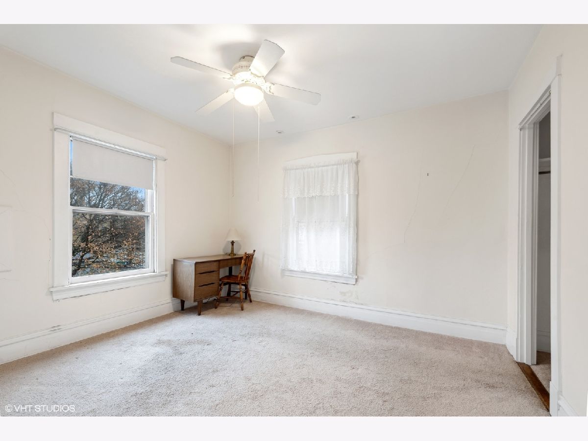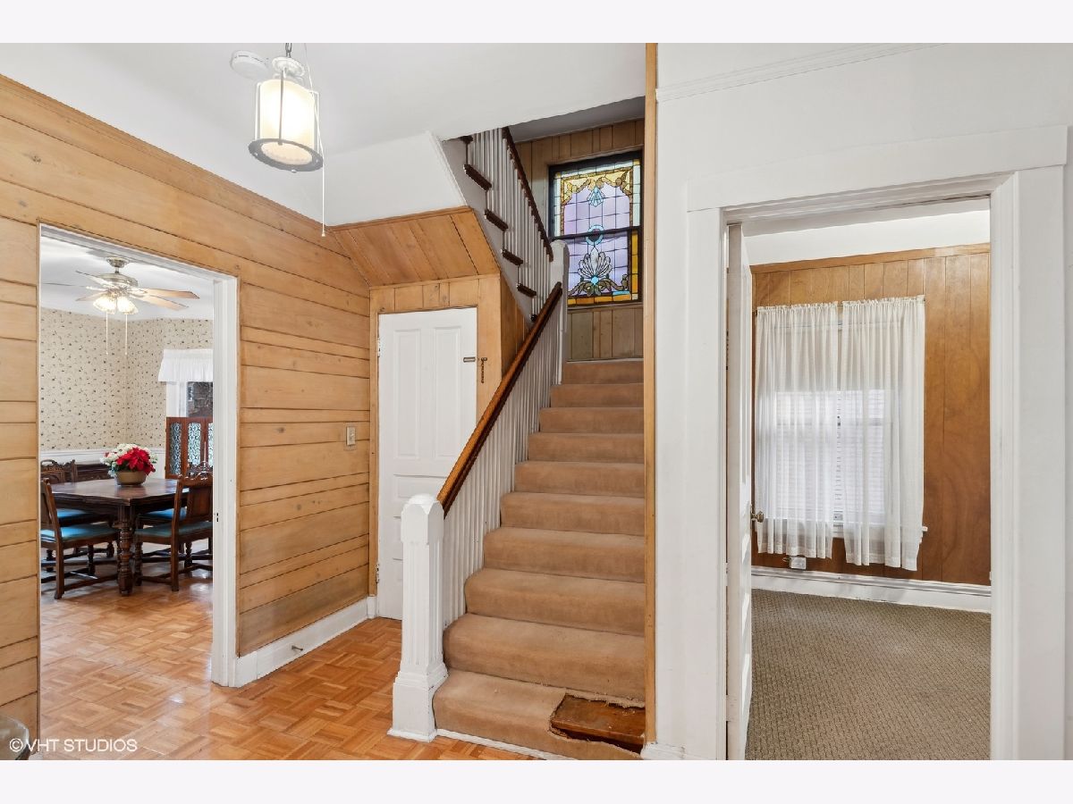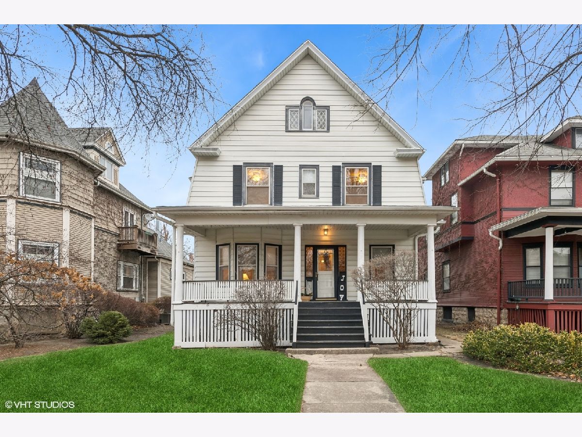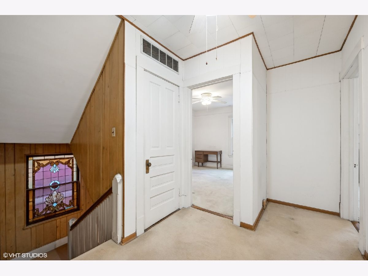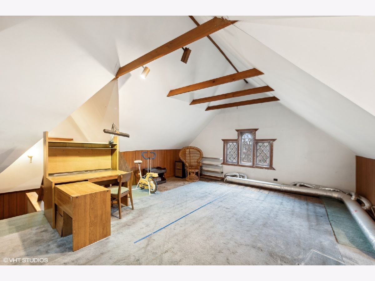 Discover Oak Park's hidden gem on a charming cul-de-sac! This home boasts modern amenities, including newer central air, boiler, and water heater. The inviting front porch and vestibule, adorned with delightful vintage wallpaper, welcome you inside. You'll fall in love with the charming staircase featuring a large stained glass window and the spacious vintage kitchen with a breakfast bar. The first-floor bedroom/office and full bathroom are perfect for a hybrid work space or multi-generational living. The second floor offers 5 generously sized bedrooms with ample space to create a future master ensuite. The standout third-floor attic, with 280 sq ft, 6" plank flooring, beam ceilings, and a floor-to-ceiling window, is ideal for a family room, exercise room, art/dance studio, or nanny quarters. Beneath all the carpeting, you'll find beautiful hardwood floors! The lovely backyard includes a garden area, and the 2-car garage with side drive provides convenient alley access. Located just a few blocks from the Metra Train Station and the vibrant downtown of Oak Park, this home is perfectly situated. Bring your vision and stay for your dream home!