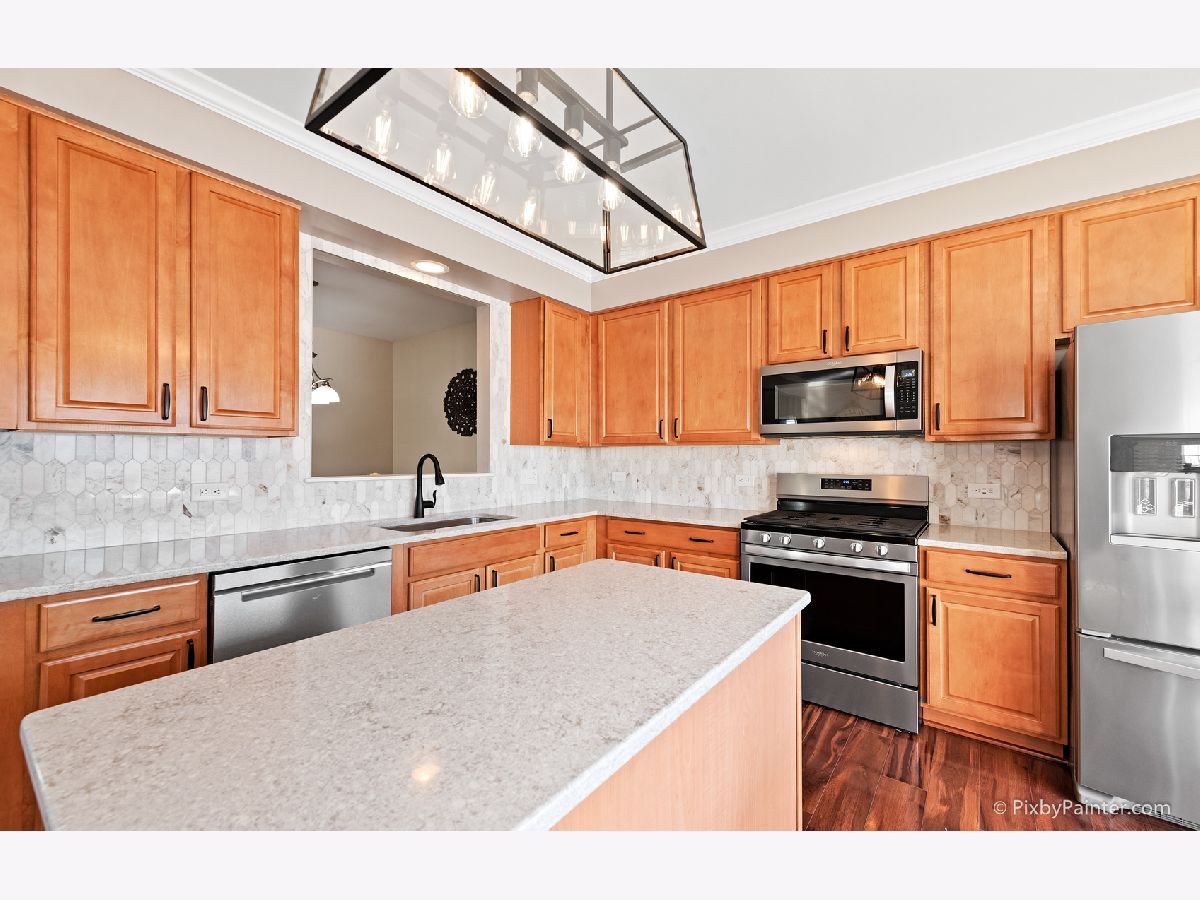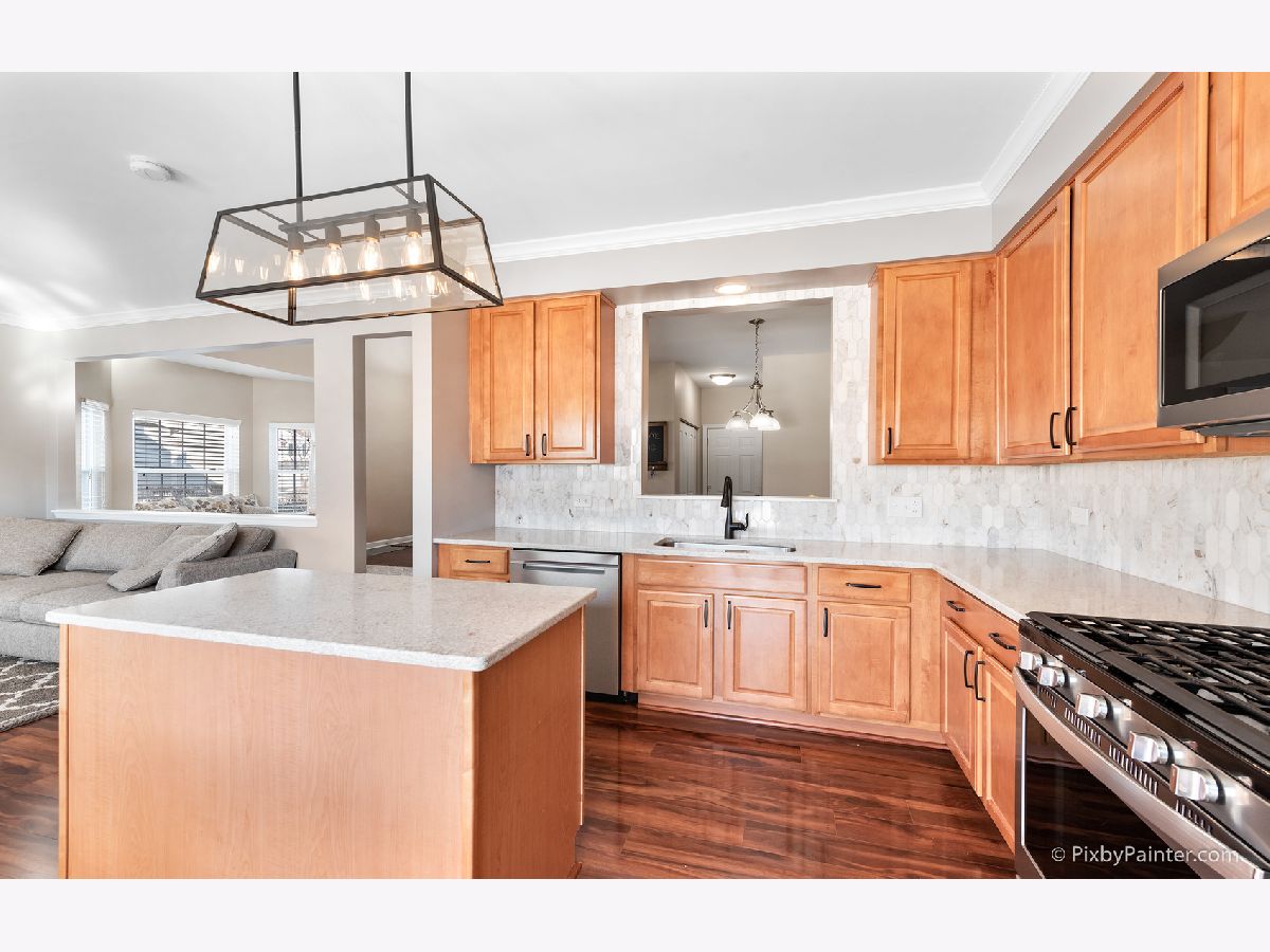 Amazing and RARE opportunity to own this 3 bed, 2.1 bath townhome with TOTALLY REMODELED KITCHEN & MASTER BATH! End-unit with private entrance, bright 2-story foyer with wood laminate floors all throughout main level. Neutral paint colors throughout. Upgraded 4 1/4" baseboards throughout. Living room off the entry with bay window, lets in tons of natural light. Separate dining room area with "pass through" to the kitchen. Oh, and let's talk about the kitchen! You'll love prepping meals in this totally remodeled space with custom cabinetry, center island, NEW appliances, tile backsplash, and quartz counters. Designer lighting. It's to die for! Opens to the family room with stone fireplace, and space for your TV to mount right above. (TV mount is included) Perfect space for movie night, ball game, or to binge watch your favorite shows! After a long day head upstairs to your master retreat, where the sellers spared no expense on the spa-like master bathroom! Totally remodeled with gorgeous double vanity, tile plank floors, 12x24 wall tile in the walk-in shower with frameless glass surround. This bathroom was taken down to the studs and done the right way! Walk-in closet and sliding barn door in master bedroom. 2 additional bedrooms AND upstairs laundry. Some windows have been replaced. Perfect home if you're just getting started or downsizing. Why go through the hassle of a remodel when the work has already been done for you! Near parks, recreation, and more! Hurry to see it before it's gone! Multiple offers received: highest and best by 5 PM today 2/24