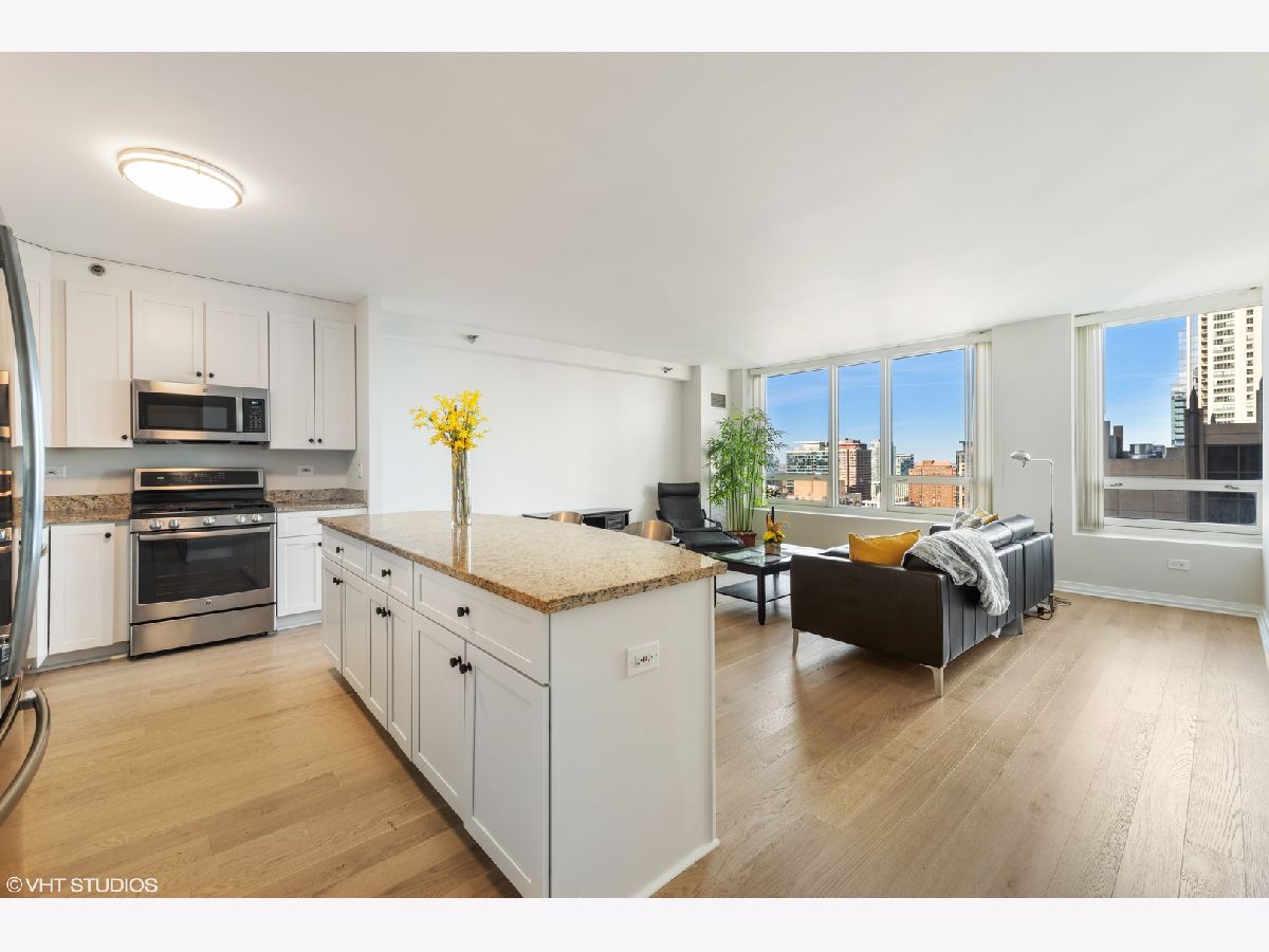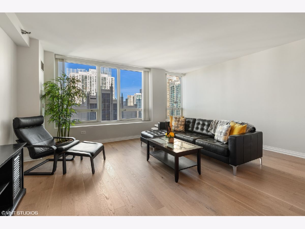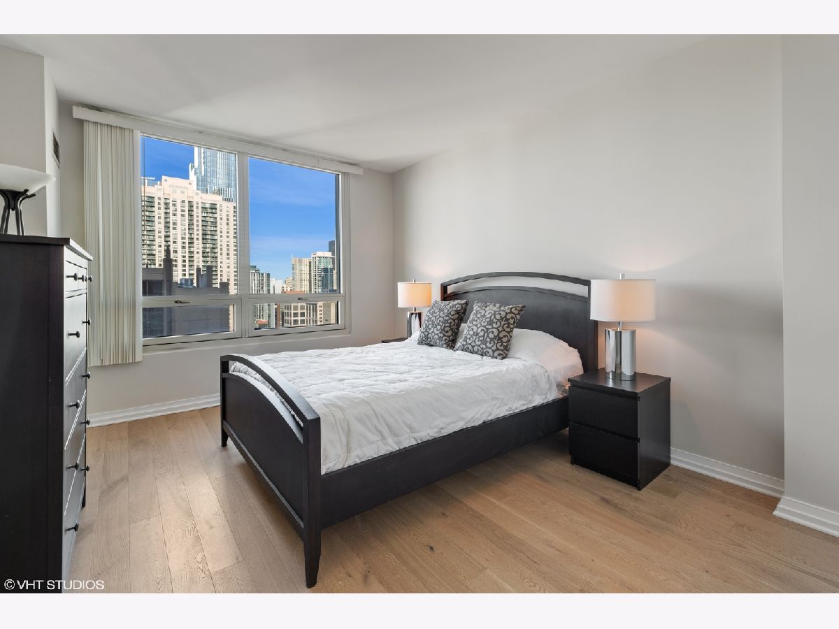 BRAND NEW GORGEOUS RENOVATION LOCATED in the HEART OF RIVER NORTH ! *** BRAND NEW RICH, NATURAL WHITE OAK HARDWOOD FLOORS THROUGHOUT !! ****** HIGH FLOOR, PANORAMIC, UNOBSTRUCTED, CITY VIEWS of ICONIC buildings ! *** OPEN KITCHEN is perfect for ENTERTAINING, with HUGE GRANITE ISLAND & GRANITE COUNTER TOPS, 42" PRISTINE/RENEWED WHITE CABINETS ARE TIMELESS - SOFT CLOSE WITH ITALIAN HARDWARE; NEWER STAINLESS STEEL APPLIANCES. OPEN FLOOR PLAN, with GENEROUS ROOM SIZES with OVER SIZED WINDOWS providing great NATURAL LIGHT and CITY VIEWS from every room. This MOVE-IN READY home is FRESHLY PAINTED ! SPACIOUS MASTER BEDROOM SUITE with HUGE WALK-IN CLOSET plus additional REACH IN CLOSET & LINEN CLOSET. EN-SUITE MASTER BATH with DOUBLE VANITY and OVERSIZED SOAKING TUB. Newer IN-UNIT FULL SIZE FRONT LOADING WASHER/DRYER, HIGH 9 foot CEILINGS, custom LIGHTING, tons of closet space. Exceptionally managed, FULL SERVICE and FULL AMENITY building with 24-HOUR DOORMAN, FITNESS CENTER, POOL/SUNDECK WITH GAS GRILLS, CONFERENCE & PARTY ROOMS, receiving room with PACKAGE DELIVERY SERVICE TO YOUR DOOR. Assessment INCLUDES HEAT/AC, GAS, STORAGE CAGE, BUILDING AMENITIES. Truly an A+ RIVER NORTH LOCATION is STEPS TO MICHIGAN AVE/ LAKEFRONT/ RIVER WALK/ LOOP/ 3 GROCERIES/ TRANSPORTATION/ RESTAURANTS. STRONG BUILDING RESERVES and no rental cap in place. GARAGE PARKING SPACE available for additional.