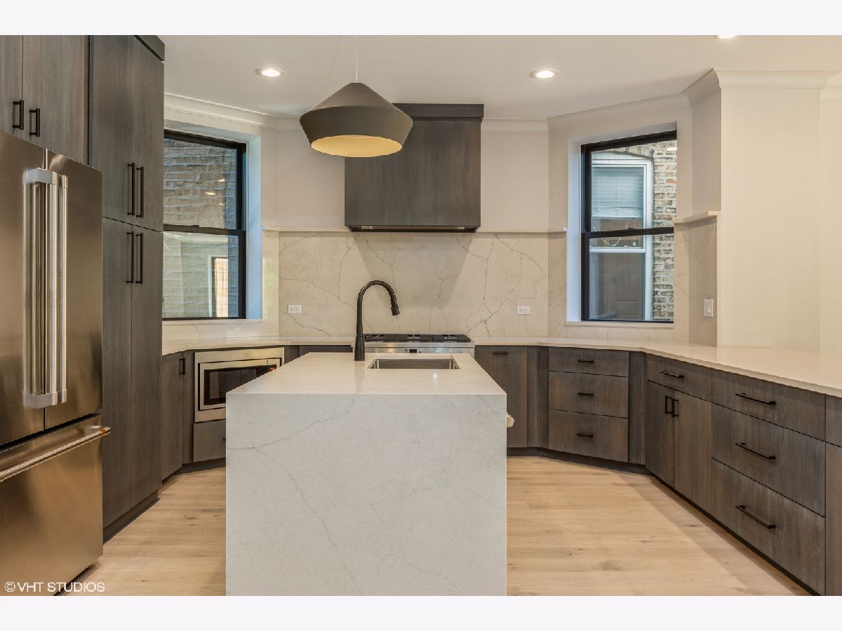 Brand new Gut-rehab of an historic greystone in a prime Logan Square location. This home on an over-sized lot provides the best of both worlds: old world craftsmanship & style combined with brand new finishes and a generous open layout. A covered front porch overlooks vibrant Wrightwood Ave. The first floor is wide open with a spacious living room, dining room, and kitchen. The kitchen features quartz waterfall countertops, custom built soft-close cabinetry, a large functional island for meal prep and hosting, and a huge walk-in pantry. Natural white oak floors throughout alongside abundant windows creates a bright and inspired home. Upstairs there are 3 spacious bedrooms all with their own en-suite bathroom. The primary suite features a large walk in closet, and a beautiful bathroom with a freestanding soaking tub. There is a big laundry room conveniently located on the top floor as well. The lower level offers a family room with a wet bar & beverage center, 2 additional bedrooms, a full bathroom, and a storage room. These bedrooms would make a perfect home office, home gym or guest suites. Gorgeous designer-specified finishes throughout. Step out the back of the home onto a large, tree-covered deck overlooking a large yard. The location is great; just steps to the Logan Square Monument with dining, shopping, and tree-line boulevards all within a short walk from your home. The CTA station at Logan Square is just a short walk away. The home is still in the final stages of construction but can be shown anytime. Photos are from a similar project recently completed by the same developer.
