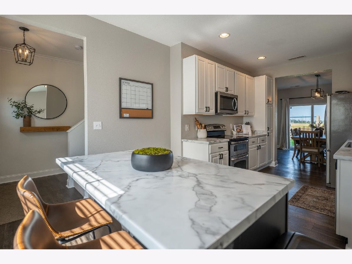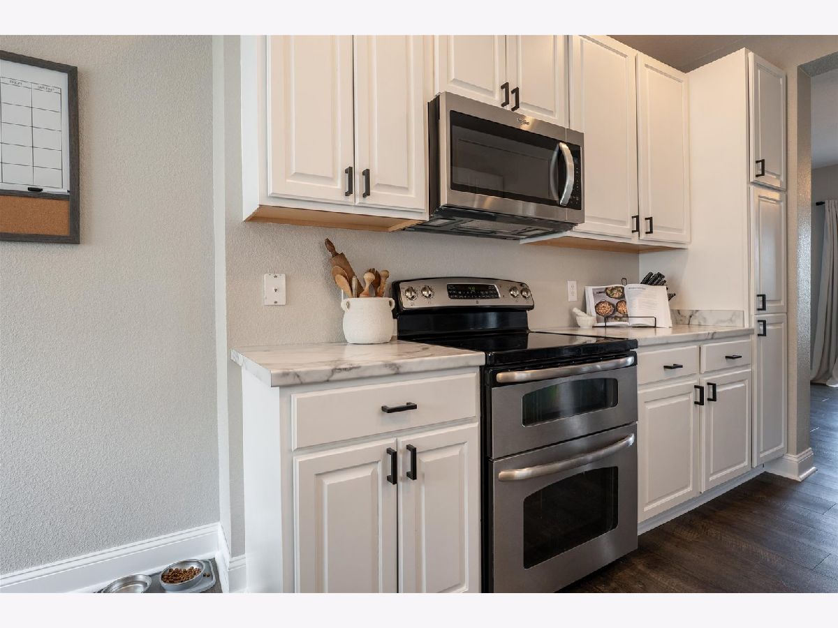 All interior hardware (doorknobs, hinges, light fixtures, ceilings fans), 5" baseboard trim on entire lower level, LVP flooring throughout lower level and upstairs laundry room. Kitchen has freshly painted white cabinets, black hardware, and new countertops, sink & faucet. Fridge & microwave new in 2021, navy blue island with seating and storage added in the dining area. Bathrooms updated with quartz countertops, new hardware, faucets & lighting. Exterior updates: Landscaping, light fixtures (garage & entry), mailbox, front door, installed black aluminum fence in the backyard.