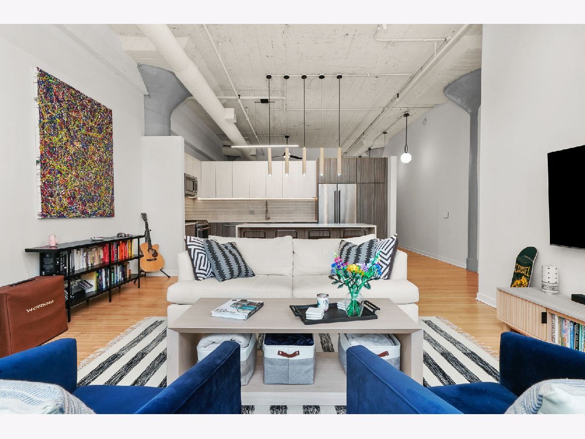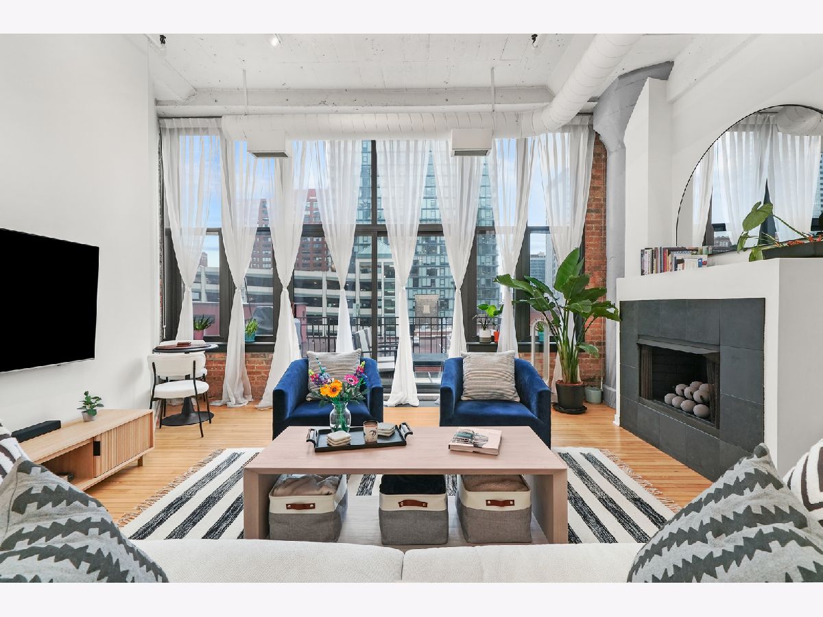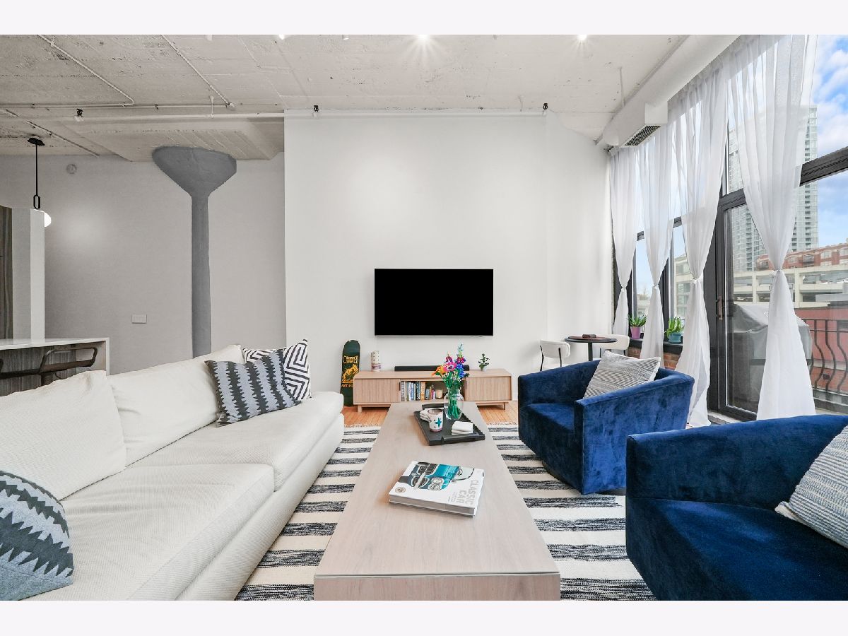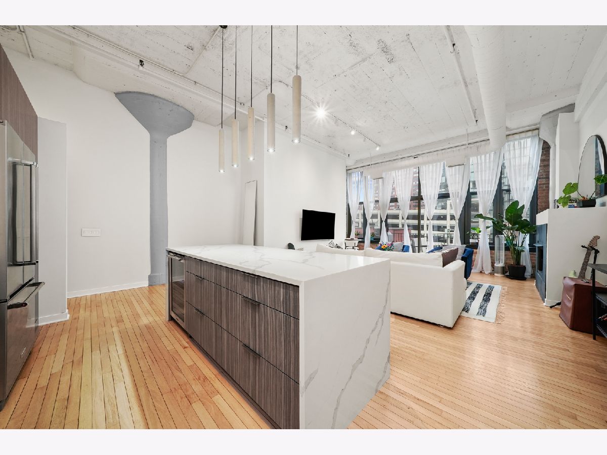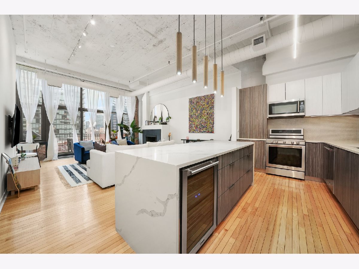 Turn-Key, Fully Renovated 1Bed/1Bath Loft at Union Square Lofts - Prime River North Location! Welcome to this spacious and stylish concrete loft, perfectly located in the heart of River North. This beautifully renovated home features dramatic 12-foot ceilings, gorgeous hardwood floors, and oversized windows that flood the space with natural light. The expansive, open-concept living area offers plenty of room for a large sectional and flows seamlessly into the designer kitchen, complete with custom cabinetry, a stunning 7+ foot waterfall island, stainless steel appliances, and a wine fridge-perfect for entertaining. Retreat to the primary suite featuring custom built-ins, lofted storage, and a thoughtfully designed layout. The updated bathroom is outfitted with classic subway tile and a spacious walk-in shower. Enjoy warm weather on your private balcony, ideal for relaxing or entertaining. Every detail in this unit has been carefully considered-custom cabinets and closets throughout (each with unique, texture-matched finishes), designer lighting, a Bosch washer and dryer, Ecobee smart thermostat, additional storage, and garage parking for $30K. Unbeatable location just one block from the Merchandise Mart Brown Line stop and within half a mile of nearly every major train line. Steps to East Bank Club and some of Chicago's best dining, shopping, and nightlife. Explore this stunning property in 3D! Click the 3D button to take a virtual tour and experience every detail.