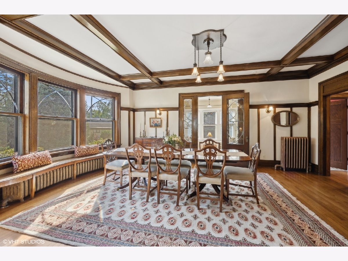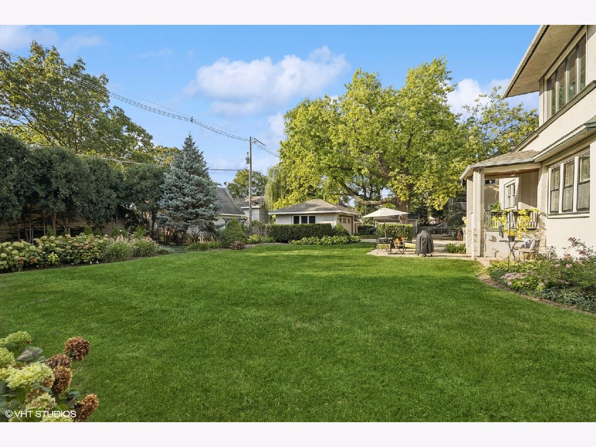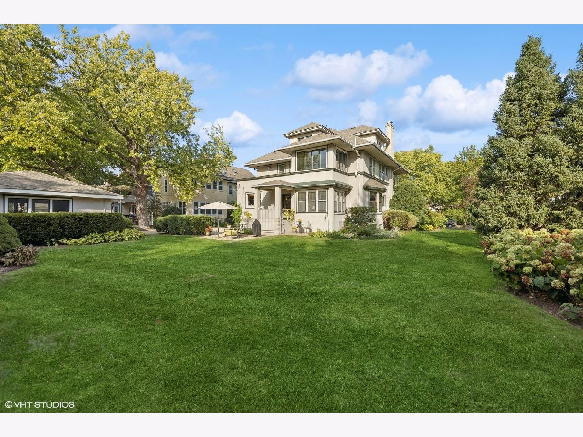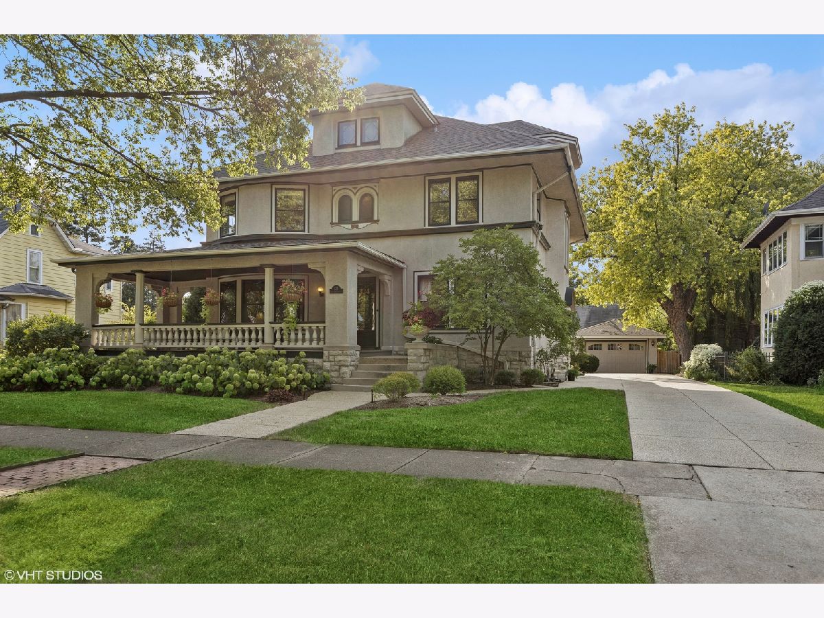 This stately colonial with prairie influences designed by J. N. Tilton, who was a student of Frank Lloyd Wright, is a stunning example of classic architecture with modern updates. It features exquisitely restored millwork, including quarter-sawn oak trim and intricate coffered ceilings in the dining room. Solid pocket doors and leaded glass windows add to its historical charm, while original Tiffany light fixtures enhance its elegance. Upon entering, you'll be greeted by a gracious foyer leading to either a formal living room with a fireplace or a cozy family room adorned with a charming tin ceiling. The expansive dining room, adjacent to the living room, is perfect for both intimate and large gatherings. The chef's kitchen is designed for both functionality and style, boasting a large island, breakfast nook, gas log fireplace and butler's pantry which provides access to the home's rear staircase. The first floor also includes a sunny den, practical mudroom, and powder room. Upstairs, you'll find four bedrooms with ample closet space and two hall bathrooms. The third level offers a sitting area, two additional bedrooms or a flexible space for a home office, along with a full bath. The basement which includes powder room and laundry room offers the opportunity to create expansive recreation space. The home is set on a generous 100x161 foot lot, surrounded by beautifully layered gardens that provide natural privacy. Significant investments have been made to ensure the home's structural integrity and modern comfort, including a new roof, exposed aggregate concrete driveway and walkways, refurbished original windows, replacement windows in the upstairs sunroom, foundation repairs, porch tuckpointing, fresh paint and new carpeting. Situated in the heart of La Grange, this home is just a short walk from its vibrant downtown, the train, and award-winning Cossitt Elementary School!