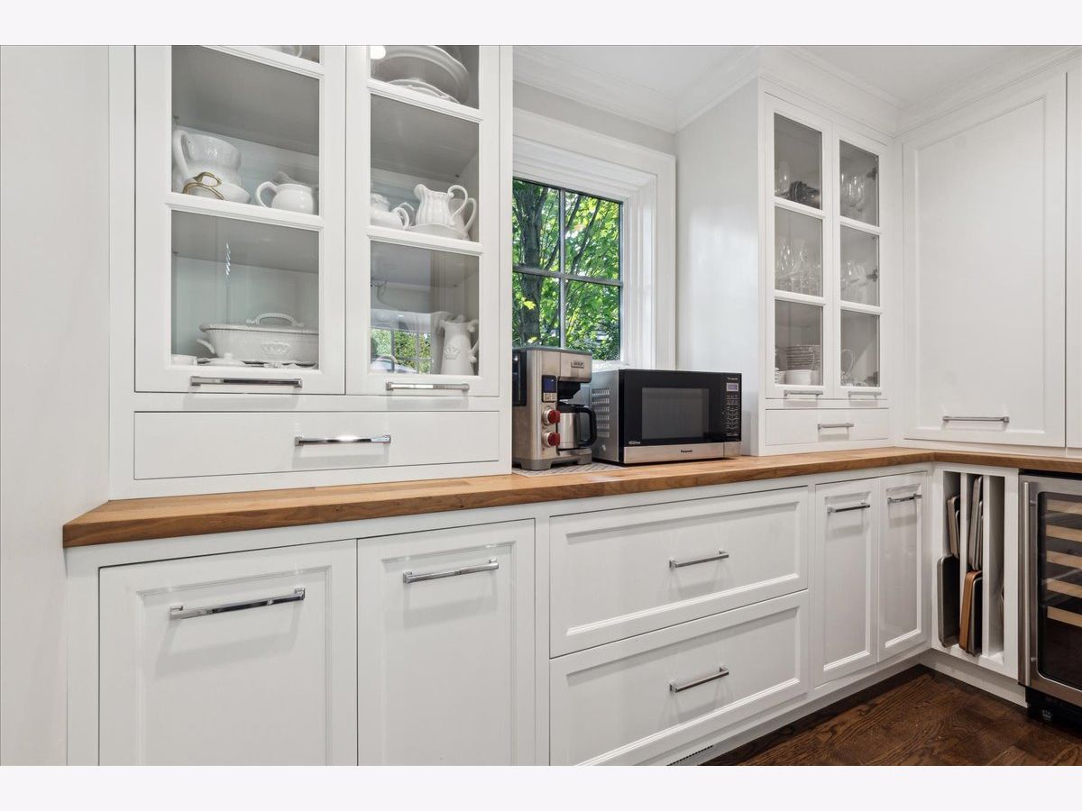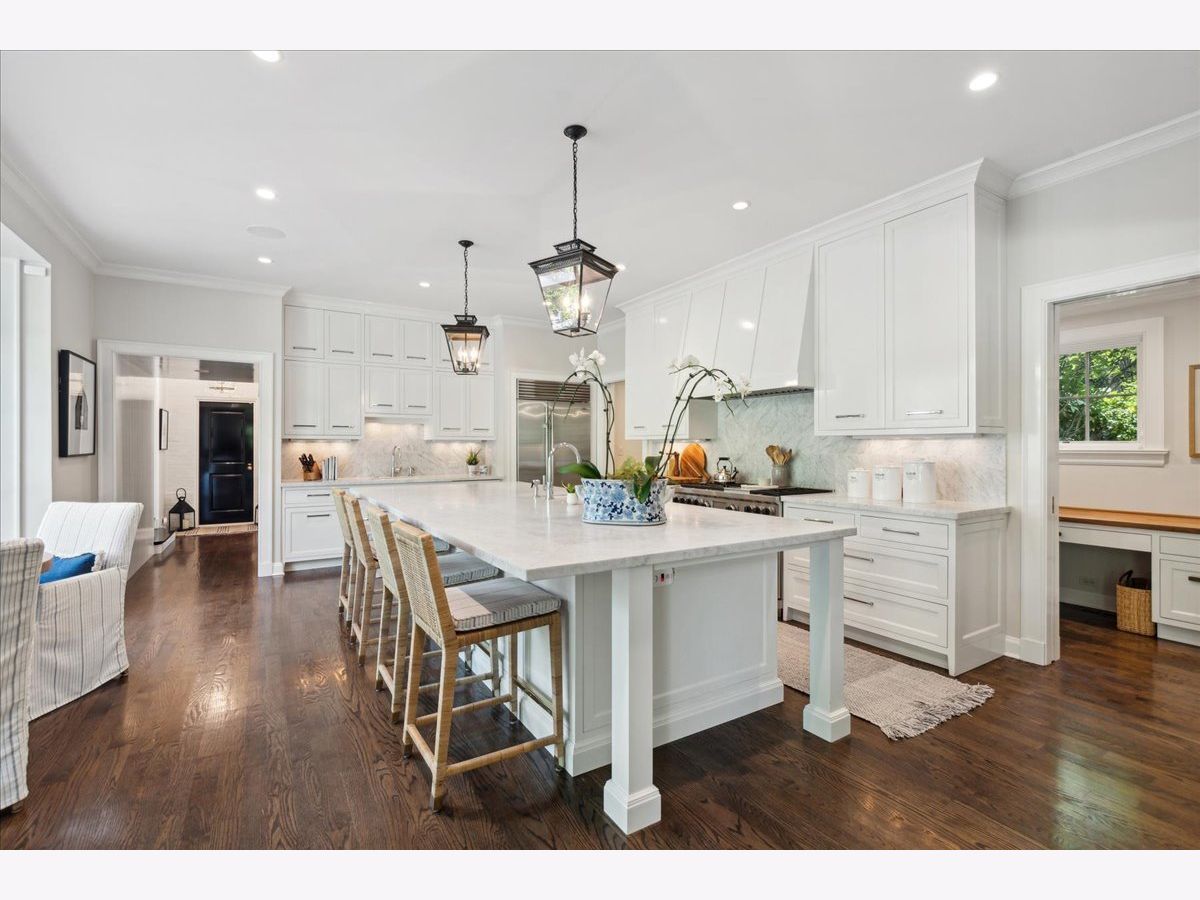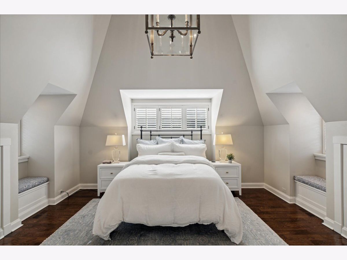 Experience the charm of this East Lake Bluff residence, nestled on nearly half an acre with picturesque ravine views. Thoughtfully renovated and expanded over the years, this home seamlessly marries the timeless elegance of vintage Jerome Cerny design with modern luxury and top-tier finishes. Step into a sun-drenched kitchen featuring a spacious island, professional-grade appliances, and a cozy eating area nestled within a bay window overlooking the lush yard. Convenience abounds with a walk-in butler's pantry and a dedicated workstation nook. The heart of the home is a welcoming family room, complete with a fireplace, custom built-ins, and French doors that open to the backyard and bluestone terrace. Formal entertaining spaces include an elegant dining room with ravine vistas and a sophisticated living room, both graced with fireplaces. A versatile home office and a separate sitting area with lacquered walls and a large bay window offer additional functional spaces. Ascend to the second floor, where the primary suite awaits with vaulted ceilings, built-in window seats, dual walk-in closets, and a serene bath featuring luxurious Perrin & Rowe fixtures. Two additional bedrooms share a charming bathroom and access to a roof deck. The lower levels boast a rec room with fireplace, laundry, an ensuite bedroom, an expansive 20x10 cedar closet, and ample storage. Exquisite details throughout include plantation shutters, custom drapery, designer wallpaper, lacquered walls and millwork, and hardwood floors. A two-car garage with epoxy flooring and direct stairway access to the basement completes this extraordinary property. Experience the perfect fusion of timeless elegance and modern comfort in this exceptional East Lake Bluff residence.