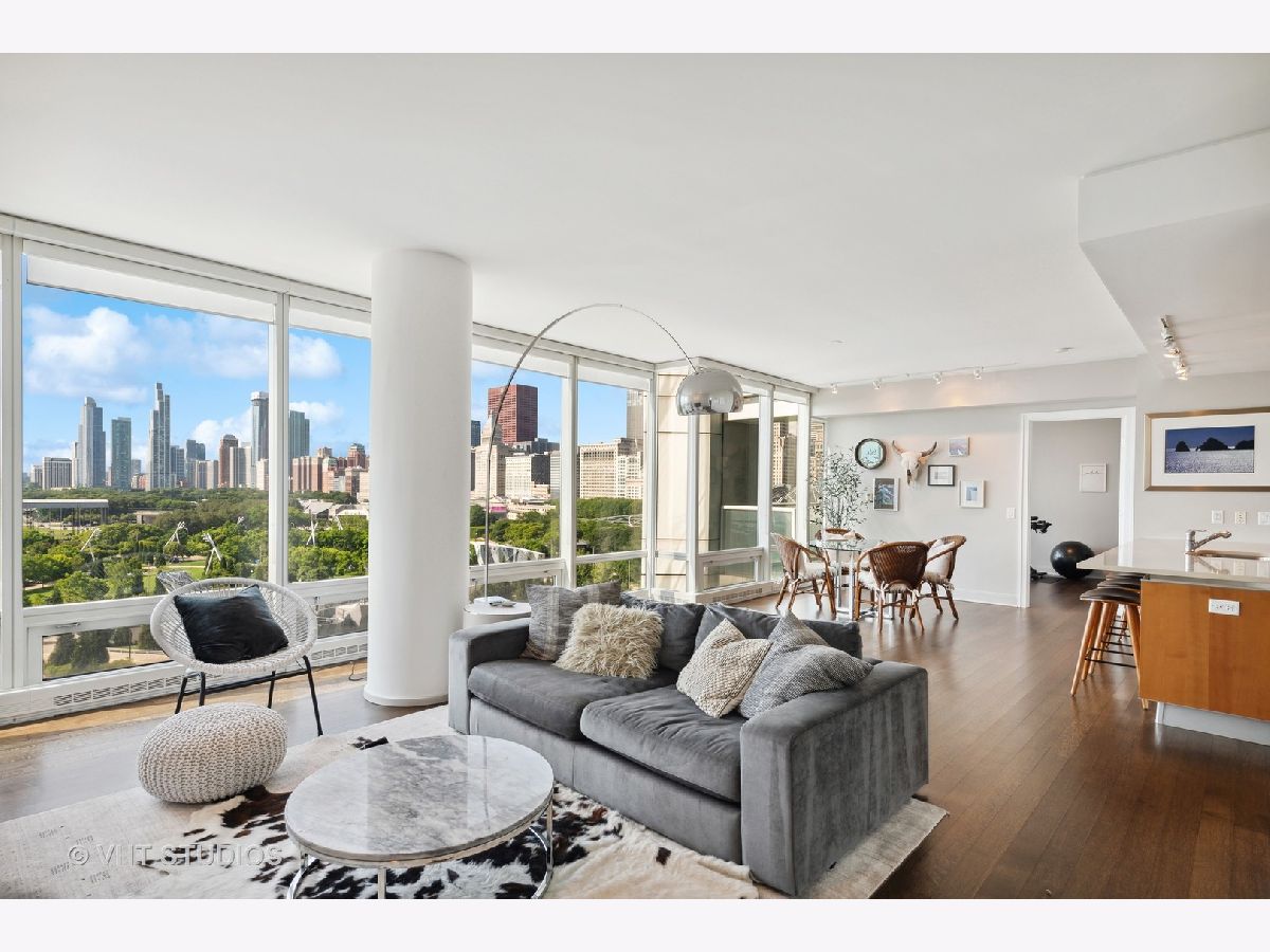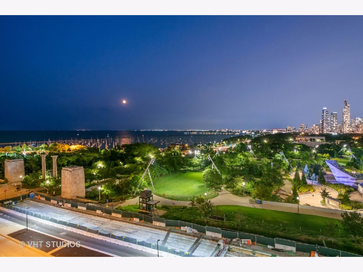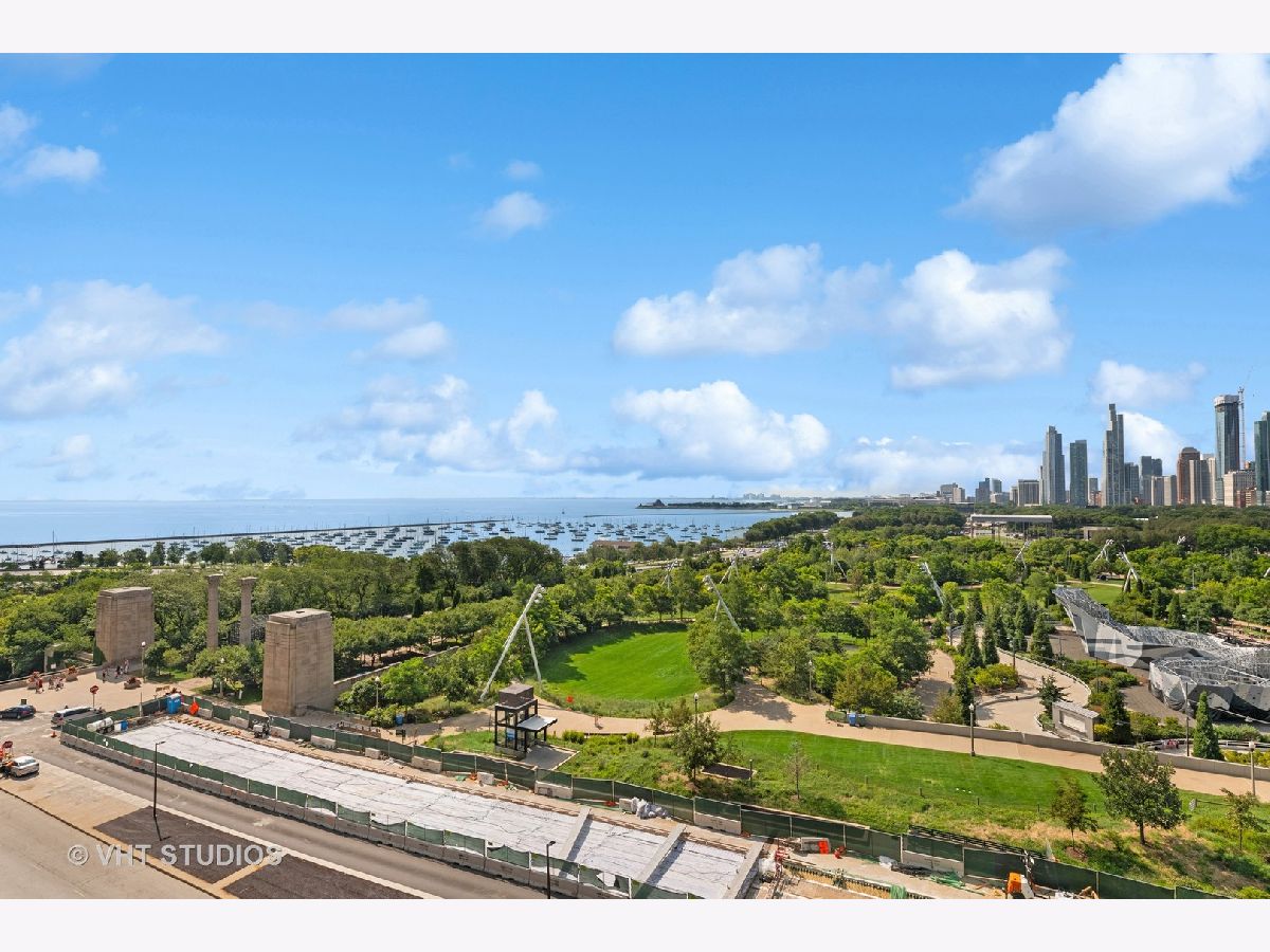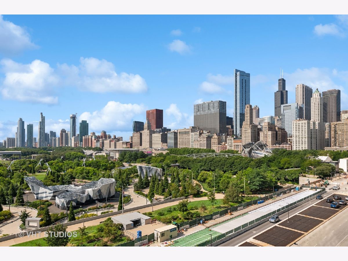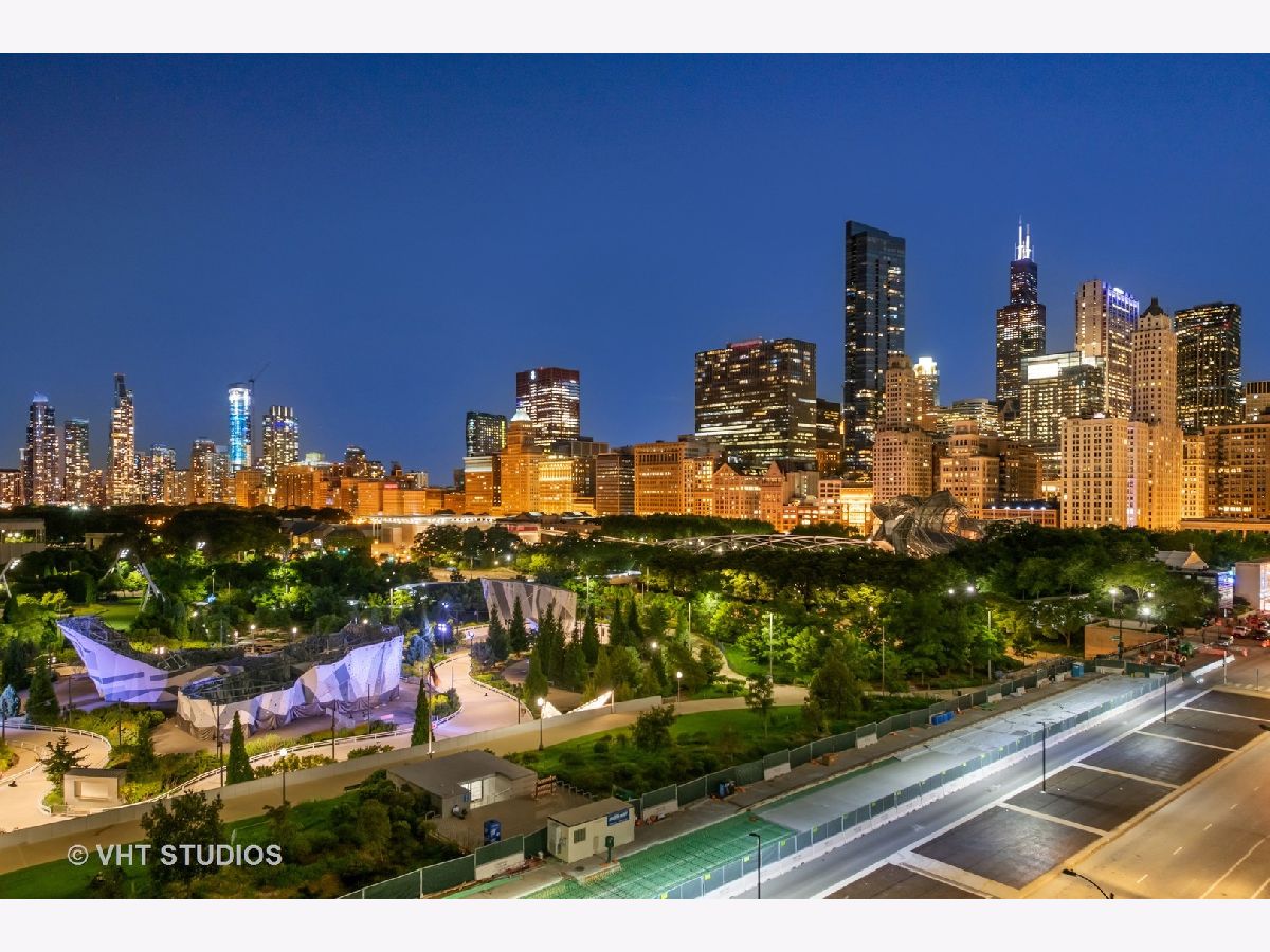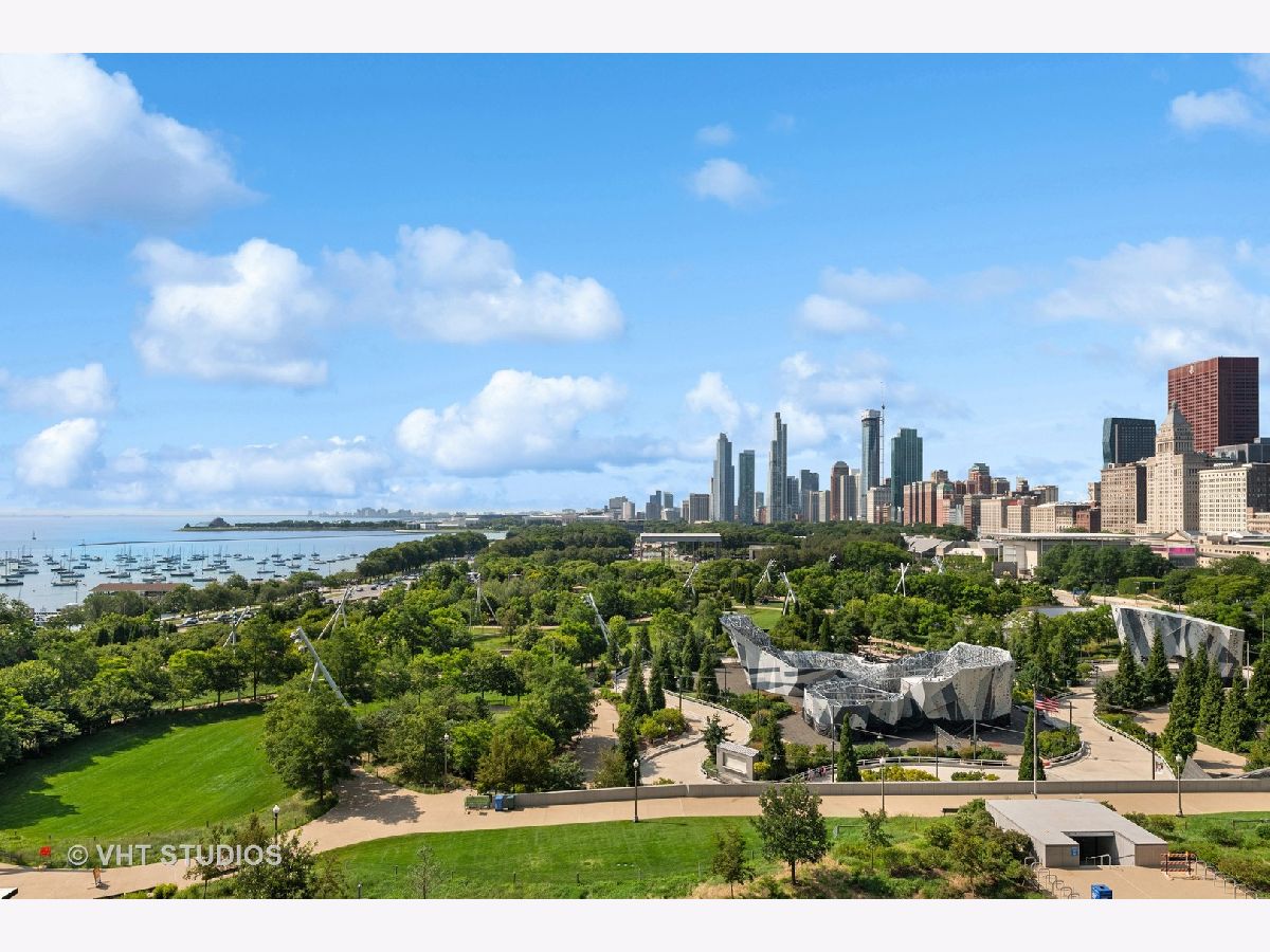 The perfect view height of the best representation of Chicago's Lake Michigan waterfront, Maggie Daley, Millennium and Grant Parks, Buckingham Fountain, incredible wall of significant wall ofArchitecture including CSO, former HQ of Encyclopedia Britannica, The Blackstone Hotel, Chicago Art Institute, Union League Club, Athletic Club and so much more. Residence 801 is the largest, south facing split bedroom, 2.1 bathroom floor plan at 340 on the Park, a southeast corner home, featuring floor to ceiling and only existing on floors 5 through 14. Magnificent and unobstructed views with no chance of ever being encumbered with sightline as far as Indiana and Michigan. Uninterrupted south and east glass curtain walls. Unique, augmented features include 5" quarter sawn, white oak "tongue and groove" hardwood floors throughout the entire residence, a primary suite with very accommodating walk-in closet completely built out with cabinetry, drawers, shelving and hanging space. A spa-like bathroom with larger glass enclosed shower, free standing soaking tub, floor to ceiling, large format, white-marble like porcelain tile with grey veining, large format, grey floor tiles, Snaidero vanity, white quartz counter, low profile, rectangular, ivory vessel sinks each with medicine cabinets, awevertical wall sconces and overhead lighting, full size stackable washer and dryer and built in speaker for music in the morning. Two zoned heating and cooling. Formal entry with room for a bench or small bureau, custom roller shades with additional remote control black out shades in primary suite. Freshly painted in a soft, contemporary grey, complemented by all white baseboards, doors and moldings. Separate living, and dining space with additional space for a third intimate seating area. Open kitchen concept with peninsula and breakfast bar overhang comfortably seating four. Quartz counters, under mount sink, disposal, stainless steel top of the line GE Monogram appliance package featuring built in oven, gas cooktop, vented culinary hood microwave and convection oven in one. Flat panel Snaidero cabinetry. Lower cabinets with pull out slider drawers. Central powder room. Second bedroom features 13' x 6' south facing terrace easily acclimating small table chairs and gas grill, walk-in closet, accommodates queen bed and office area with desk, walk-in closet with built-ins, full bathroom dressed in natural stone, Raised Snaidero vanity. Lighting purchased from Lightology. This is a full amenity building including 24 hour door staff, onsite management, maintenance and engineering team, dry cleaners, outdoor pet relief area, most convenient access to Mariano's and the Village Market than any other building in LSE. 25th amenities include 75' indoor 2 lane indoor lap pool, whirlpool, steam rooms, dry sauna, Winter Garden, private conference/dining room, complete caterer's kitchen, sun terrace, two communal gas grills, 4,000 square foot gym with state of the art equipment. Garage heated parking @ $50,000. Residence 801 is a very special and rare offering and will not disappoint even the most discriminating buyer.