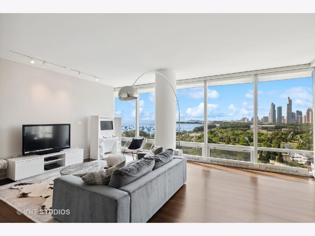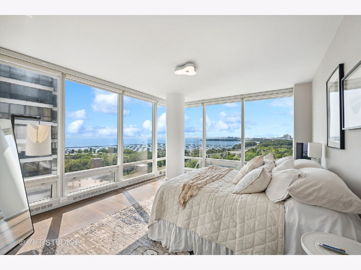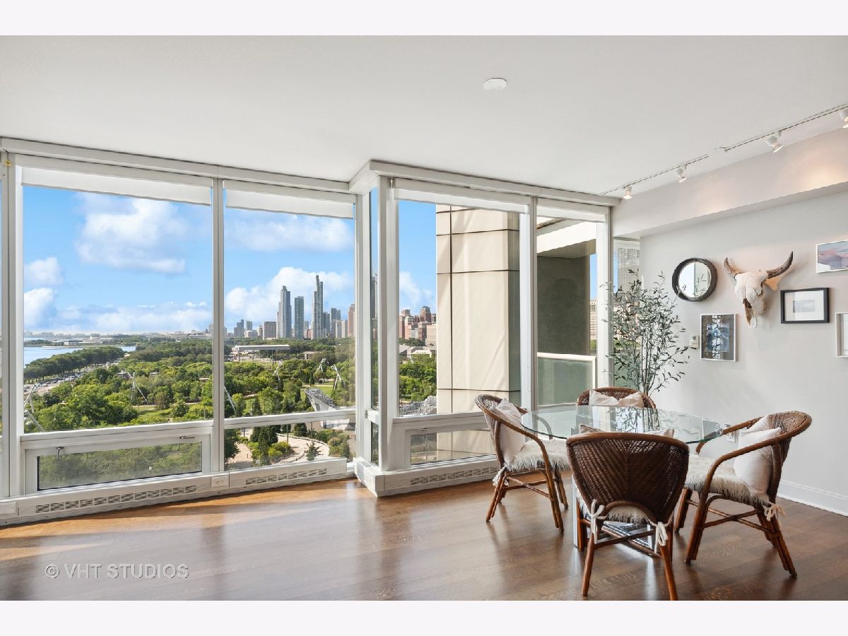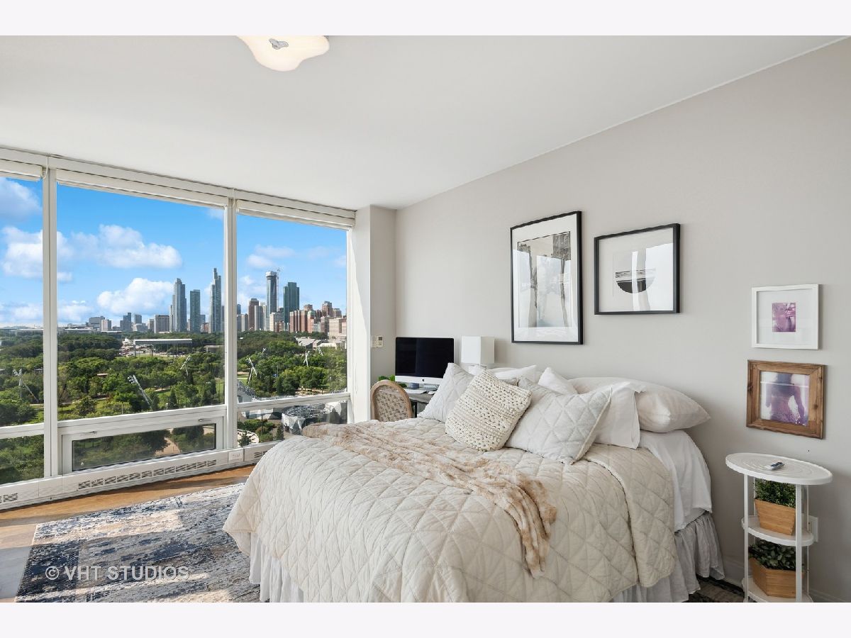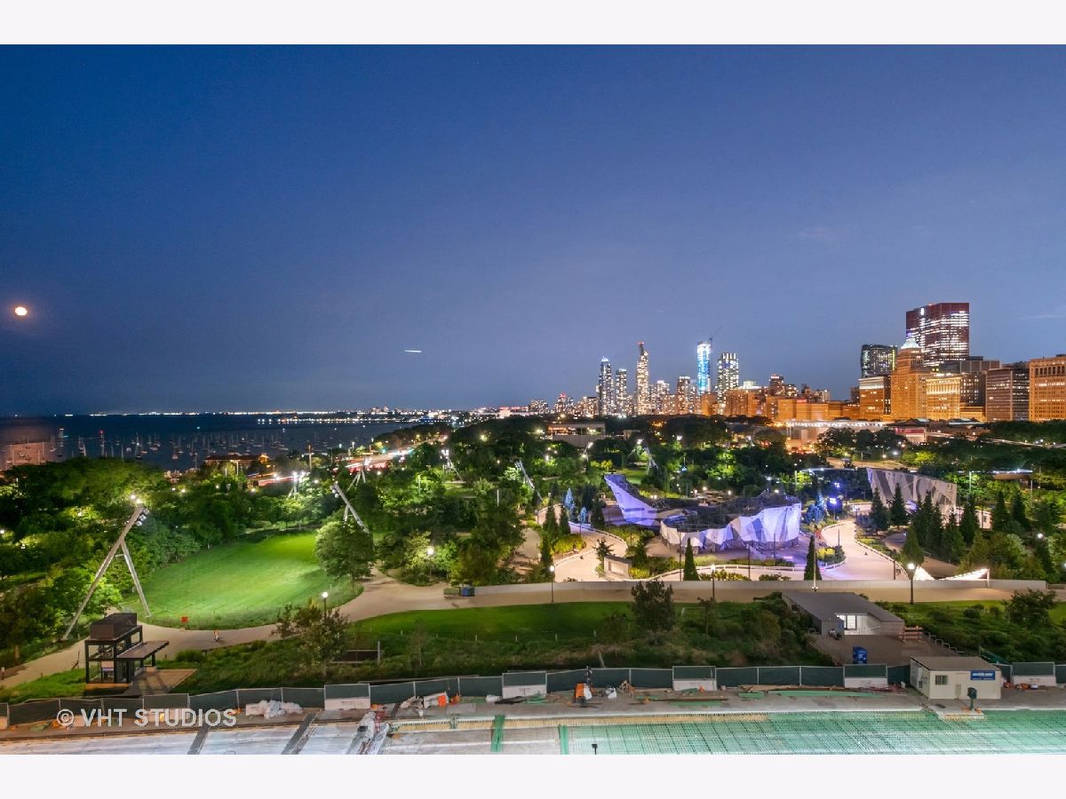 The perfect view height of the best representation of Chicago's Lake Michigan waterfront, Maggie Daley, Millennium and Grant Parks, Buckingham Fountain, incredible wall of significant wall ofArchitecture including CSO, former HQ of Encyclopedia Britannica, The Blackstone Hotel, Chicago Art Institute, Union League Club, Athletic Club and so much more. Residence 801 is the largest, south facing split bedroom, 2.1 bathroom floor plan at 340 on the Park, a southeast corner home, featuring floor to ceiling and only existing on floors 5 through 14. Magnificent and unobstructed views with no chance of ever being encumbered with sightline as far as Indiana and Michigan. Uninterrupted south and east glass curtain walls. Unique, augmented features include 5" quarter sawn, white oak "tongue and groove" hardwood floors throughout the entire residence, a primary suite with very accommodating walk-in closet completely built out with cabinetry, drawers, shelving and hanging space. A spa-like bathroom with larger glass enclosed shower, free standing soaking tub, floor to ceiling, large format, white-marble like porcelain tile with grey veining, large format, grey floor tiles, Snaidero vanity, white quartz counter, low profile, rectangular, ivory vessel sinks each with medicine cabinets, awevertical wall sconces and overhead lighting, full size stackable washer and dryer and built in speaker for music in the morning. Two zoned heating and cooling. Formal entry with room for a bench or small bureau, custom roller shades with additional remote control black out shades in primary suite. Freshly painted in a soft, contemporary grey, complemented by all white baseboards, doors and moldings. Separate living, and dining space with additional space for a third intimate seating area. Open kitchen concept with peninsula and breakfast bar overhang comfortably seating four. Quartz counters, under mount sink, disposal, stainless steel top of the line GE Monogram appliance package featuring built in oven, gas cooktop, vented culinary hood microwave and convection oven in one. Flat panel Snaidero cabinetry. Lower cabinets with pull out slider drawers. Central powder room. Second bedroom features 13' x 6' south facing terrace easily acclimating small table chairs and gas grill, walk-in closet, accommodates queen bed and office area with desk, walk-in closet with built-ins, full bathroom dressed in natural stone, Raised Snaidero vanity. Lighting purchased from Lightology. This is a full amenity building including 24 hour door staff, onsite management, maintenance and engineering team, dry cleaners, outdoor pet relief area, most convenient access to Mariano's and the Village Market than any other building in LSE. 25th amenities include 75' indoor 2 lane indoor lap pool, whirlpool, steam rooms, dry sauna, Winter Garden, private conference/dining room, complete caterer's kitchen, sun terrace, two communal gas grills, 4,000 square foot gym with state of the art equipment. Garage heated parking @ $50,000. Residence 801 is a very special and rare offering and will not disappoint even the most discriminating buyer.