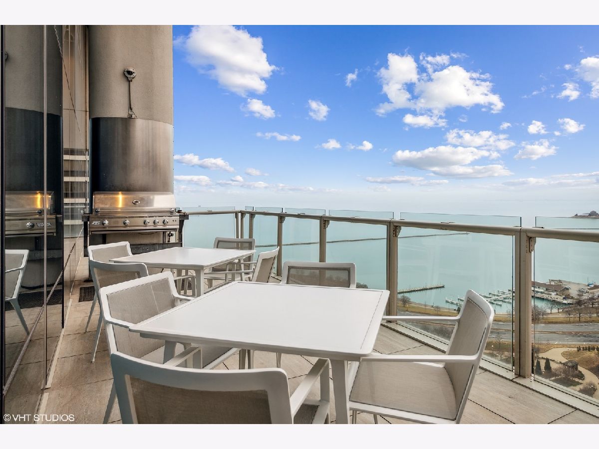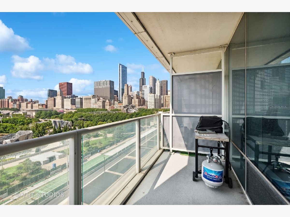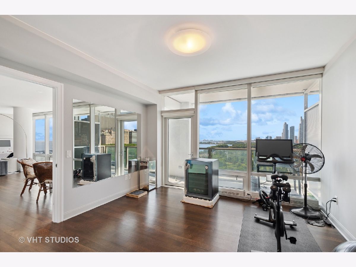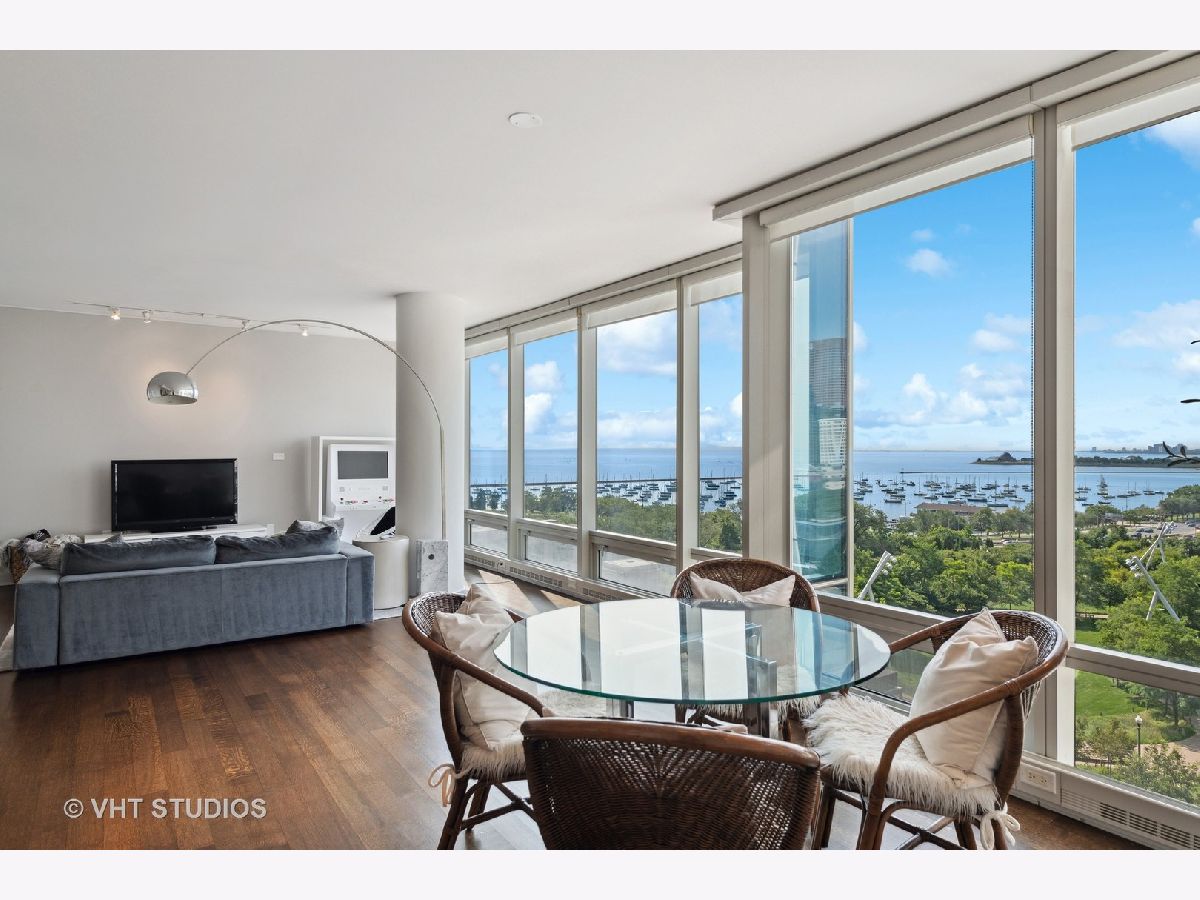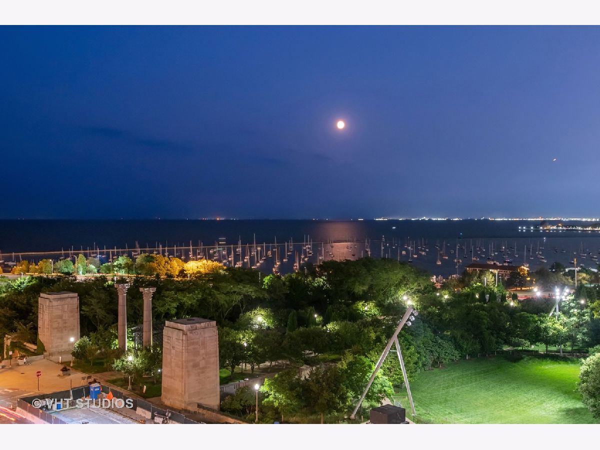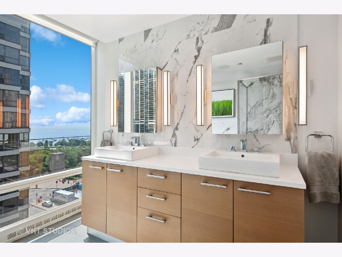 The perfect view height of the best representation of Chicago's Lake Michigan waterfront, Maggie Daley, Millennium and Grant Parks, Buckingham Fountain, incredible wall of significant wall ofArchitecture including CSO, former HQ of Encyclopedia Britannica, The Blackstone Hotel, Chicago Art Institute, Union League Club, Athletic Club and so much more. Residence 801 is the largest, south facing split bedroom, 2.1 bathroom floor plan at 340 on the Park, a southeast corner home, featuring floor to ceiling and only existing on floors 5 through 14. Magnificent and unobstructed views with no chance of ever being encumbered with sightline as far as Indiana and Michigan. Uninterrupted south and east glass curtain walls. Unique, augmented features include 5" quarter sawn, white oak "tongue and groove" hardwood floors throughout the entire residence, a primary suite with very accommodating walk-in closet completely built out with cabinetry, drawers, shelving and hanging space. A spa-like bathroom with larger glass enclosed shower, free standing soaking tub, floor to ceiling, large format, white-marble like porcelain tile with grey veining, large format, grey floor tiles, Snaidero vanity, white quartz counter, low profile, rectangular, ivory vessel sinks each with medicine cabinets, awevertical wall sconces and overhead lighting, full size stackable washer and dryer and built in speaker for music in the morning. Two zoned heating and cooling. Formal entry with room for a bench or small bureau, custom roller shades with additional remote control black out shades in primary suite. Freshly painted in a soft, contemporary grey, complemented by all white baseboards, doors and moldings. Separate living, and dining space with additional space for a third intimate seating area. Open kitchen concept with peninsula and breakfast bar overhang comfortably seating four. Quartz counters, under mount sink, disposal, stainless steel top of the line GE Monogram appliance package featuring built in oven, gas cooktop, vented culinary hood microwave and convection oven in one. Flat panel Snaidero cabinetry. Lower cabinets with pull out slider drawers. Central powder room. Second bedroom features 13' x 6' south facing terrace easily acclimating small table chairs and gas grill, walk-in closet, accommodates queen bed and office area with desk, walk-in closet with built-ins, full bathroom dressed in natural stone, Raised Snaidero vanity. Lighting purchased from Lightology. This is a full amenity building including 24 hour door staff, onsite management, maintenance and engineering team, dry cleaners, outdoor pet relief area, most convenient access to Mariano's and the Village Market than any other building in LSE. 25th amenities include 75' indoor 2 lane indoor lap pool, whirlpool, steam rooms, dry sauna, Winter Garden, private conference/dining room, complete caterer's kitchen, sun terrace, two communal gas grills, 4,000 square foot gym with state of the art equipment. Garage heated parking @ $50,000. Residence 801 is a very special and rare offering and will not disappoint even the most discriminating buyer.