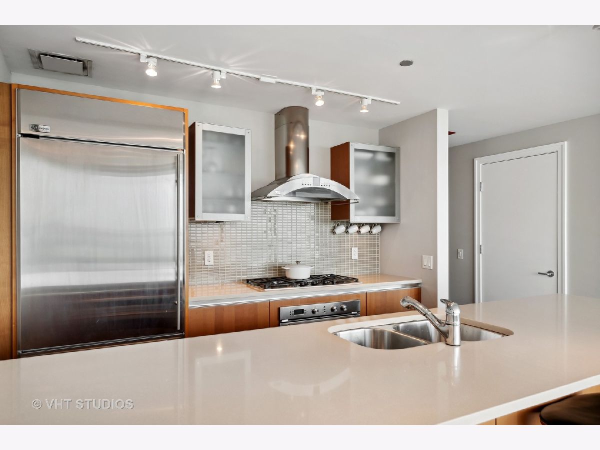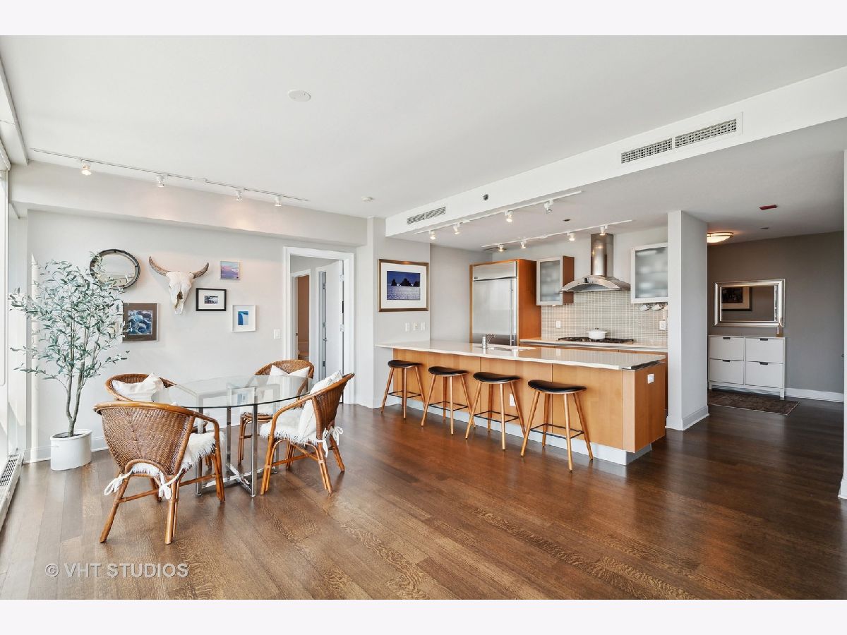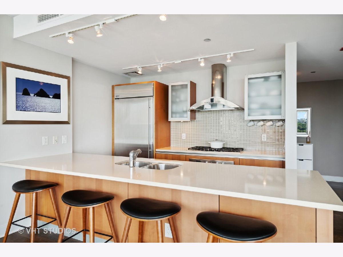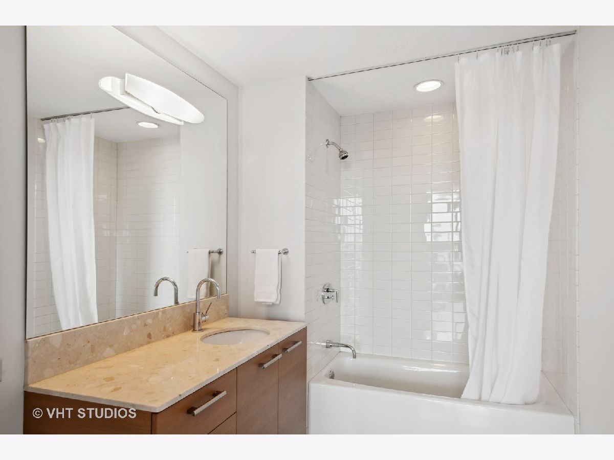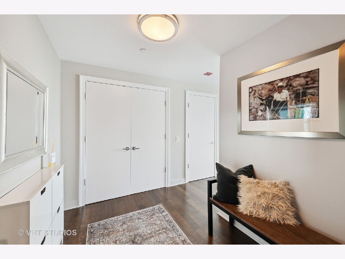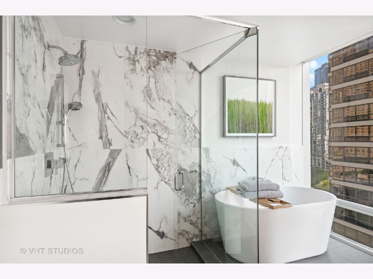 The perfect view height of the best representation of Chicago's Lake Michigan waterfront, Maggie Daley, Millennium and Grant Parks, Buckingham Fountain, incredible wall of significant wall ofArchitecture including CSO, former HQ of Encyclopedia Britannica, The Blackstone Hotel, Chicago Art Institute, Union League Club, Athletic Club and so much more. Residence 801 is the largest, south facing split bedroom, 2.1 bathroom floor plan at 340 on the Park, a southeast corner home, featuring floor to ceiling and only existing on floors 5 through 14. Magnificent and unobstructed views with no chance of ever being encumbered with sightline as far as Indiana and Michigan. Uninterrupted south and east glass curtain walls. Unique, augmented features include 5" quarter sawn, white oak "tongue and groove" hardwood floors throughout the entire residence, a primary suite with very accommodating walk-in closet completely built out with cabinetry, drawers, shelving and hanging space. A spa-like bathroom with larger glass enclosed shower, free standing soaking tub, floor to ceiling, large format, white-marble like porcelain tile with grey veining, large format, grey floor tiles, Snaidero vanity, white quartz counter, low profile, rectangular, ivory vessel sinks each with medicine cabinets, awevertical wall sconces and overhead lighting, full size stackable washer and dryer and built in speaker for music in the morning. Two zoned heating and cooling. Formal entry with room for a bench or small bureau, custom roller shades with additional remote control black out shades in primary suite. Freshly painted in a soft, contemporary grey, complemented by all white baseboards, doors and moldings. Separate living, and dining space with additional space for a third intimate seating area. Open kitchen concept with peninsula and breakfast bar overhang comfortably seating four. Quartz counters, under mount sink, disposal, stainless steel top of the line GE Monogram appliance package featuring built in oven, gas cooktop, vented culinary hood microwave and convection oven in one. Flat panel Snaidero cabinetry. Lower cabinets with pull out slider drawers. Central powder room. Second bedroom features 13' x 6' south facing terrace easily acclimating small table chairs and gas grill, walk-in closet, accommodates queen bed and office area with desk, walk-in closet with built-ins, full bathroom dressed in natural stone, Raised Snaidero vanity. Lighting purchased from Lightology. This is a full amenity building including 24 hour door staff, onsite management, maintenance and engineering team, dry cleaners, outdoor pet relief area, most convenient access to Mariano's and the Village Market than any other building in LSE. 25th amenities include 75' indoor 2 lane indoor lap pool, whirlpool, steam rooms, dry sauna, Winter Garden, private conference/dining room, complete caterer's kitchen, sun terrace, two communal gas grills, 4,000 square foot gym with state of the art equipment. Garage heated parking @ $50,000. Residence 801 is a very special and rare offering and will not disappoint even the most discriminating buyer.