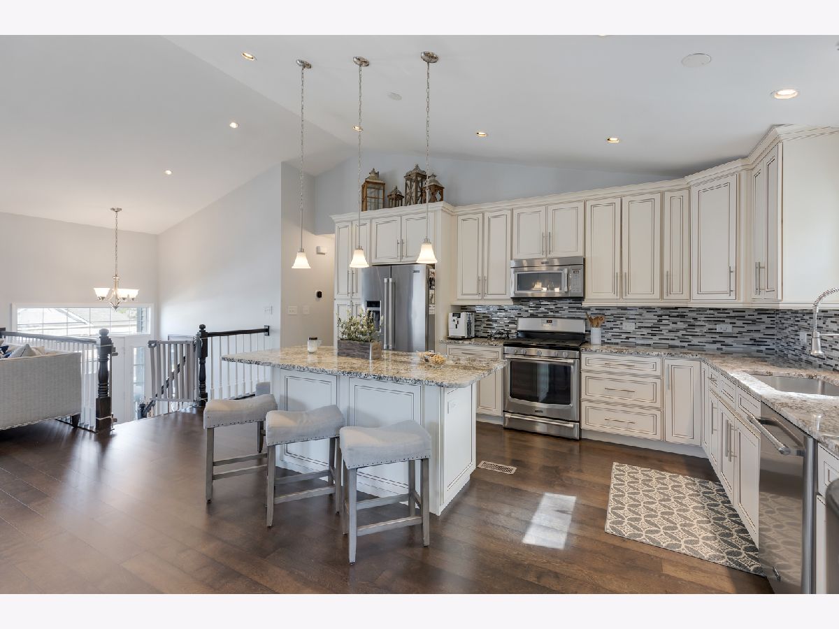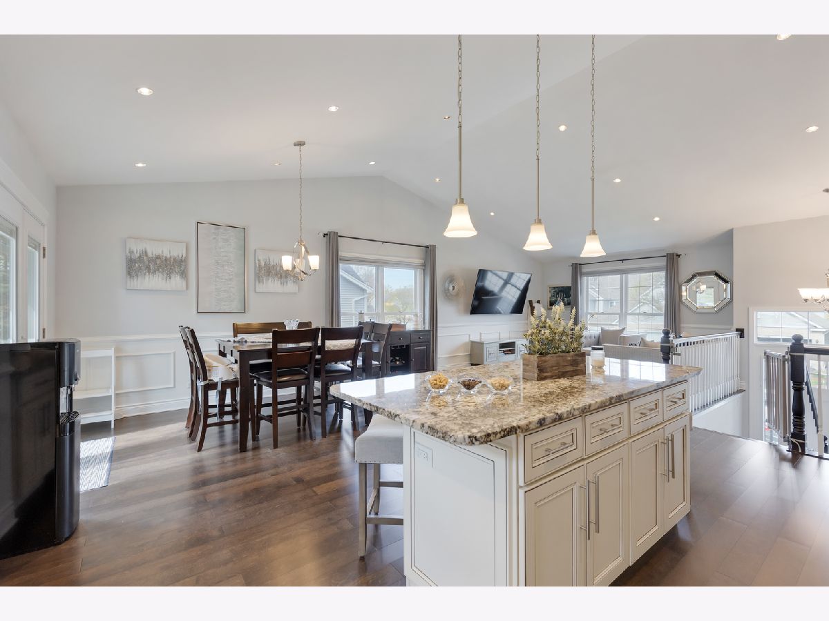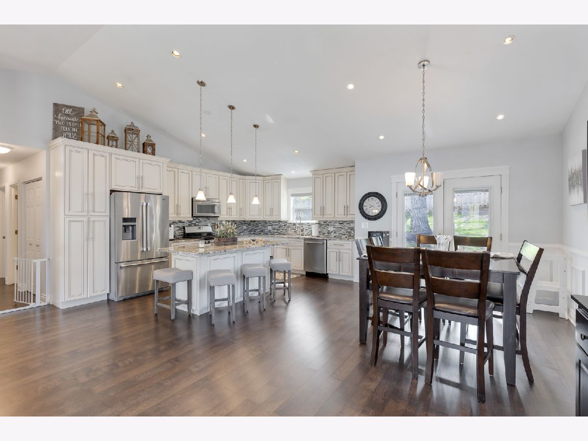 Schedule your movers! Move-in-ready raised ranch with 3 BRs and 2.1 baths in almost 2,100 square feet. The main level in this home features wood laminate flooring throughout and a wide open floor plan ideal for entertaining. It includes the kitchen with a large island, eating area and living room. Kitchen has newer stainless steel appliances, 42-inch cabinets, granite countertops and a vaulted ceiling. The dining and living room areas have attractive wainscoting paneling. Also on the main level are three bedrooms. The main bedroom has a vaulted ceiling, a private ensuite bath with a walk-in shower and a double vanity. There also is a large walk-in closet in the main bedroom. The other two bedrooms have generous closets as well as wood laminate floors. The lower level has a large family room with decorative wainscoting that is currently used as a home office. There also is a wood burning fireplace as well as a half bath near the family room. A laundry room with a sink is also in the lower level and features a newer washer and dryer. There is a large workroom behind the 2-car garage that can also be used for storage. The backyard has a massive 46x12 wood deck for outside entertainment. Recent home improvements include new roof and gutter guards (2023), new furnace & AC (2021) and whole house blinds (2019). This home is a 2-minute drive to the Fox River Grove Metra train station and close to the Fox River, library, park, ponds, shopping and dining.