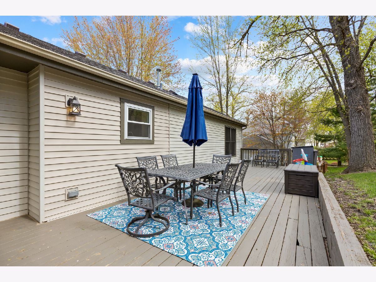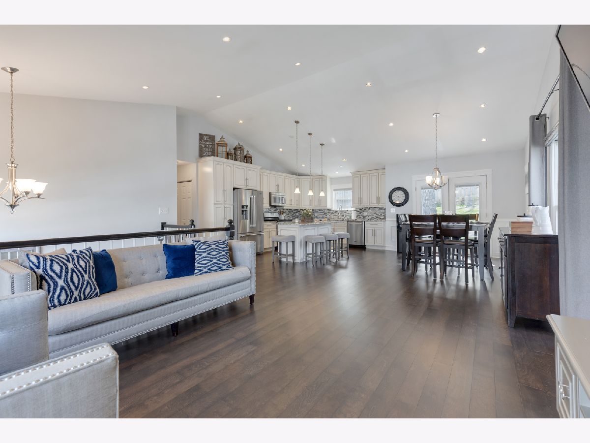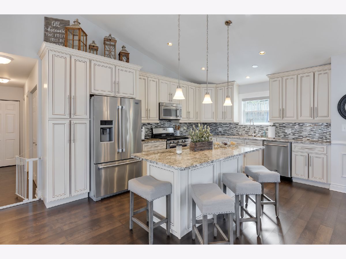 Schedule your movers! Move-in-ready raised ranch with 3 BRs and 2.1 baths in almost 2,100 square feet. The main level in this home features wood laminate flooring throughout and a wide open floor plan ideal for entertaining. It includes the kitchen with a large island, eating area and living room. Kitchen has newer stainless steel appliances, 42-inch cabinets, granite countertops and a vaulted ceiling. The dining and living room areas have attractive wainscoting paneling. Also on the main level are three bedrooms. The main bedroom has a vaulted ceiling, a private ensuite bath with a walk-in shower and a double vanity. There also is a large walk-in closet in the main bedroom. The other two bedrooms have generous closets as well as wood laminate floors. The lower level has a large family room with decorative wainscoting that is currently used as a home office. There also is a wood burning fireplace as well as a half bath near the family room. A laundry room with a sink is also in the lower level and features a newer washer and dryer. There is a large workroom behind the 2-car garage that can also be used for storage. The backyard has a massive 46x12 wood deck for outside entertainment. Recent home improvements include new roof and gutter guards (2023), new furnace & AC (2021) and whole house blinds (2019). This home is a 2-minute drive to the Fox River Grove Metra train station and close to the Fox River, library, park, ponds, shopping and dining.
