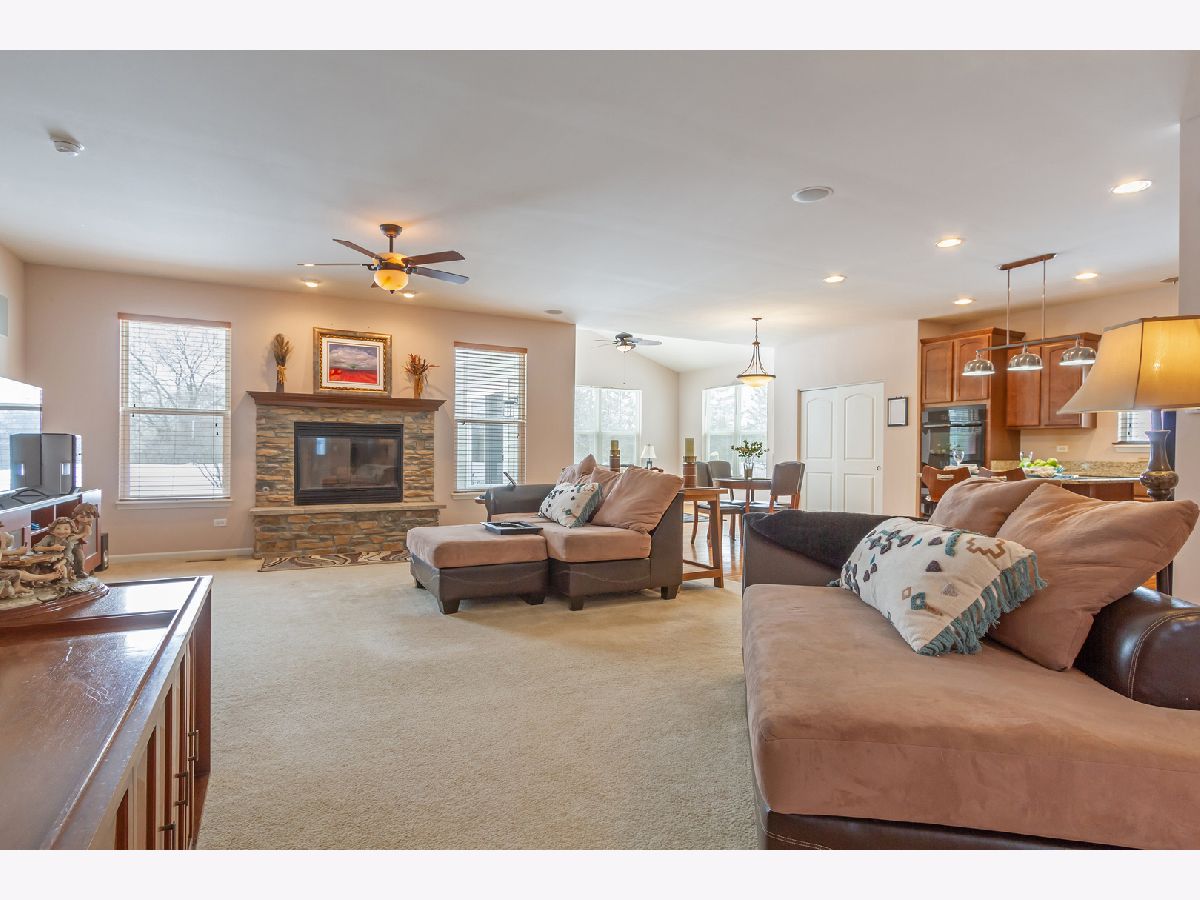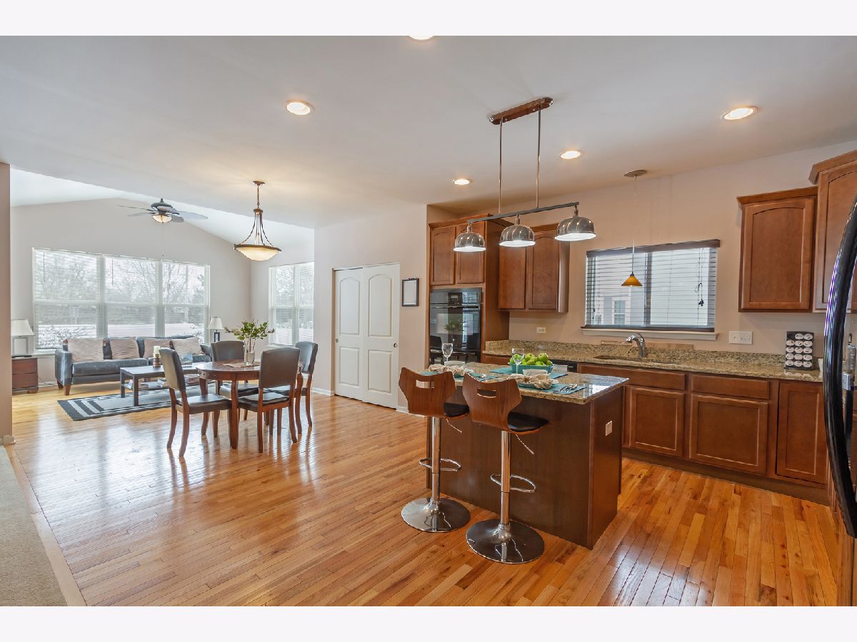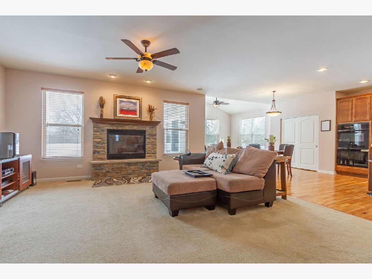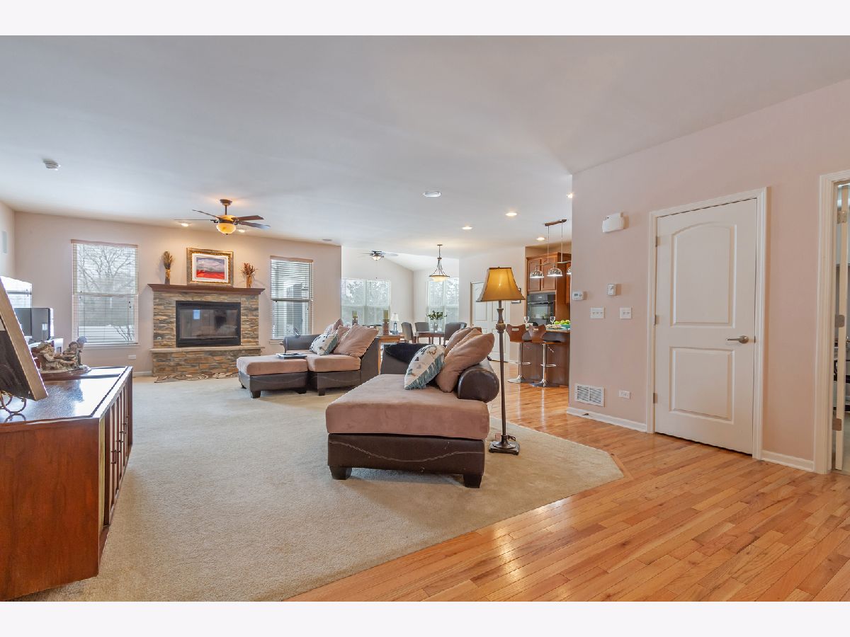 Move right in to this beautiful ranch home in the desirable Highland Woods neighborhood! Gorgeous hardwood flooring in the foyer/hall, kitchen, and sun room. Living room showcases a raised wood-burning fireplace with stone surround, accented by eyeball lights and a beautiful wood mantle. Living room also features built-in surround sound, and two convenient floor outlets. Gourmet kitchen boasts maple cabinetry, granite countertops, recessed lighting, double door convection oven, gas cooktop, center island with seating, closet pantry, and an eating area with table space. Kitchen opens to the sun room which has a vaulted ceiling, and exits to the new custom stamped-concrete patio. Ideal layout for entertaining! Master suite features an arched doorway, tray ceiling, and upgraded private master bath with double sink vanity, separate shower, and soaking tub. Arched entry hallway leads to the 2nd and 3rd bedrooms, which are bright and spacious, and have access to a full hall bath. Private home office with double french doors, tray ceiling, and built-in credenza. Completing the main level is the laundry room. Semi-finished basement is ready for your finishing touches and can potentially add more living space! Oversized driveway and attached three-car garage with door accessing the backyard. Home is on an upgraded pie-shaped lot and has a large backyard with a beautiful new custom stamped concrete patio with a built-in gas line. Enjoy all of the amenities that Highland Woods has to offer, including the clubhouse, pool, parks, walking/biking trails, and more! Highly-rated District #301 schools - the elementary school is in the neighborhood! Just minutes to Route 20, I-90 and the Metra for easy commuting. This one won't last!!