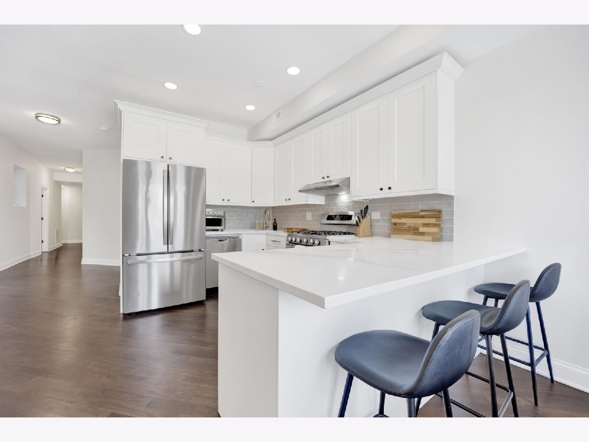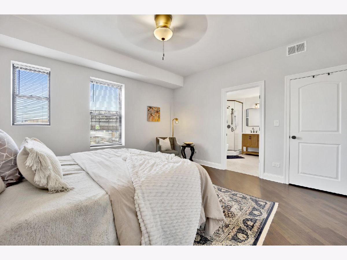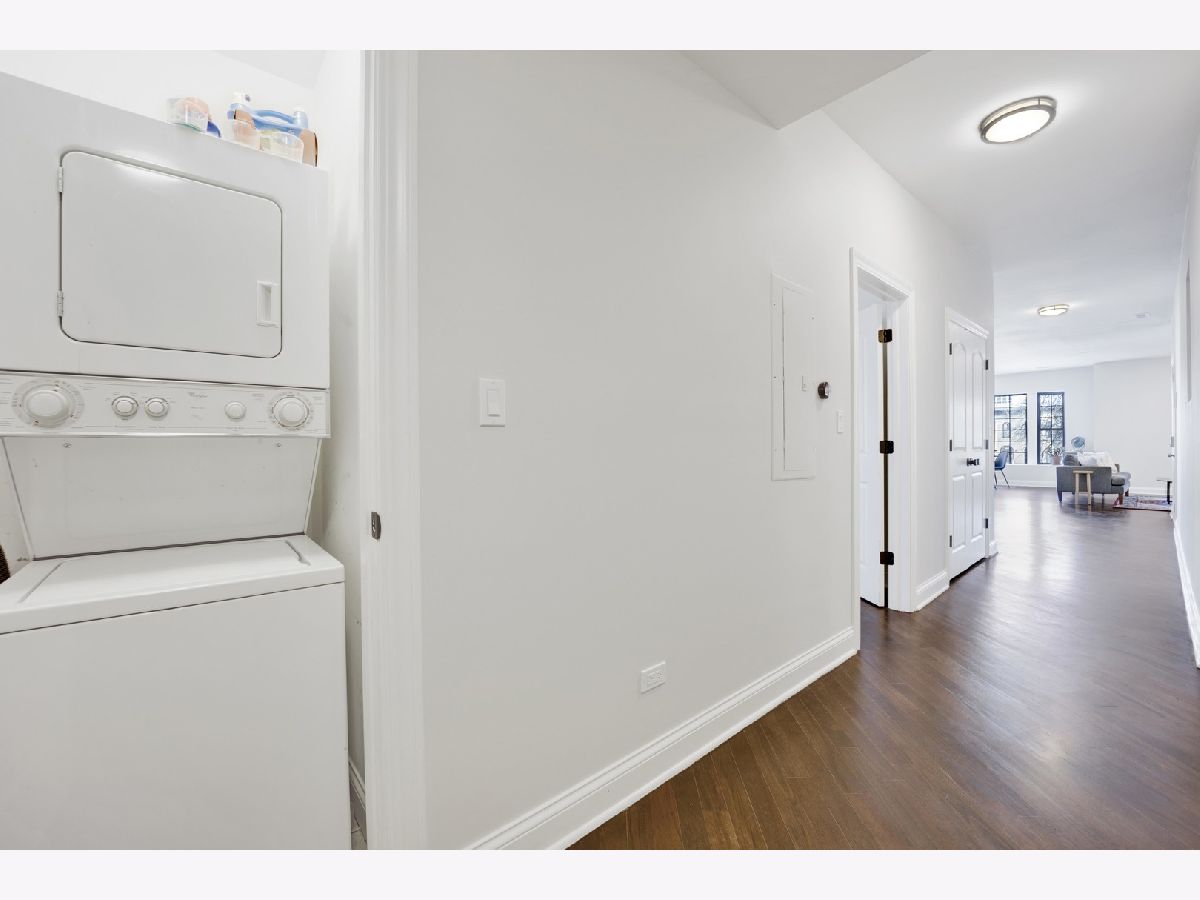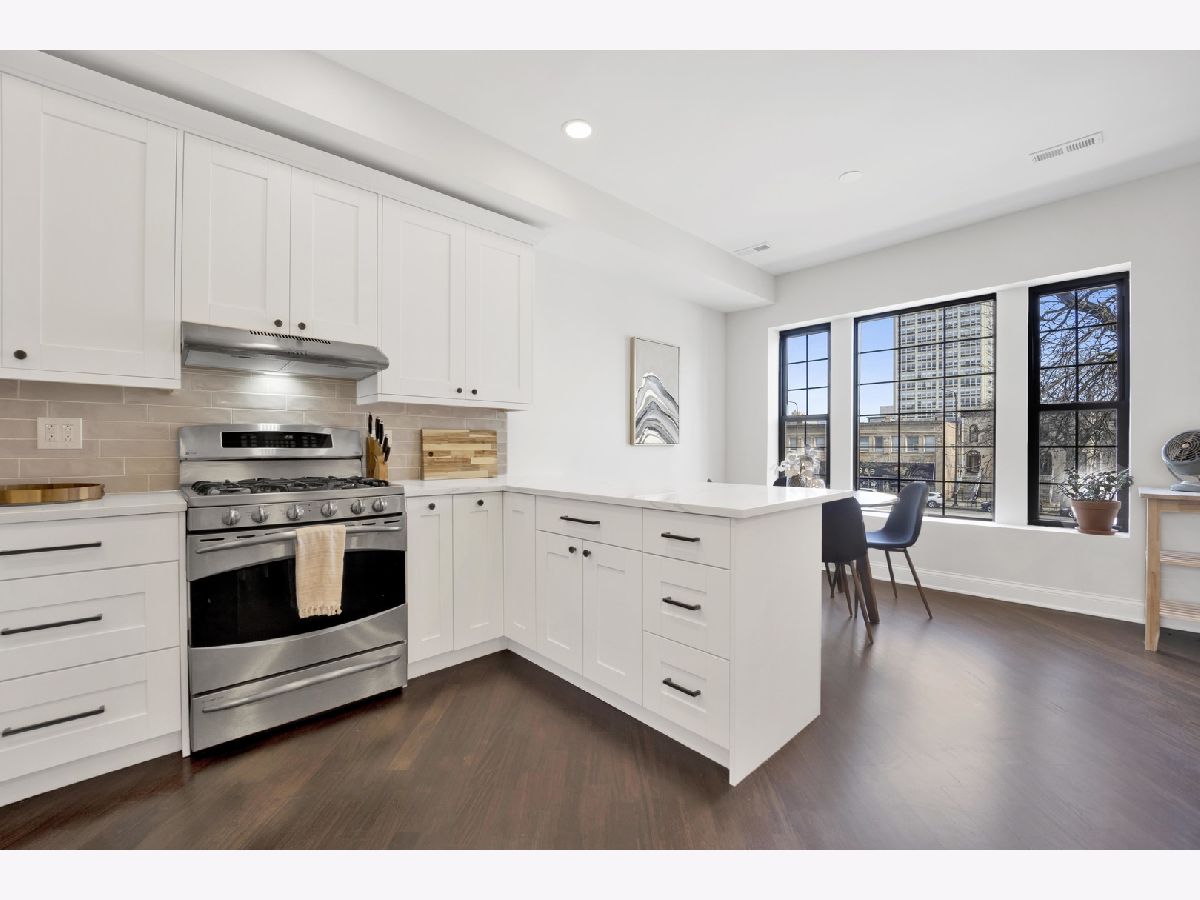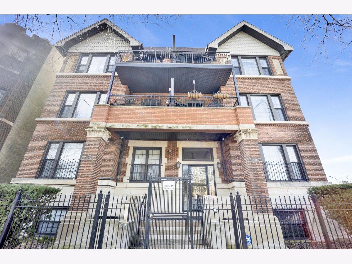 MOVE-IN READY! This expansive 3-bedroom, 2-bathroom condominium is nestled on a charming tree-lined street in the vibrant heart of Bronzeville. Recently renovated in 2022, this unit offers a modern aesthetic and thoughtful design throughout. The kitchen is equipped with sleek white shaker-style cabinetry, quartz countertops, stainless steel appliances, and a stylish subway tile backsplash. The primary bathroom is a luxurious retreat, featuring a freestanding tub, stand-up shower, double vanity, and all-new hexagon floor tile, subway tile, and matte black hardware. The unit's spacious floor plan provides versatile living, entertaining, and home office options. Enjoy an open concept living and dining area flooded with natural light. Step out onto the large private balcony & additional rear deck for relaxation and outdoor enjoyment. Added conveniences include an in-unit washer/dryer, hardwood flooring throughout, and 1 EXTERIOR PARKING SPACE INCLUDED IN THE PRICE!