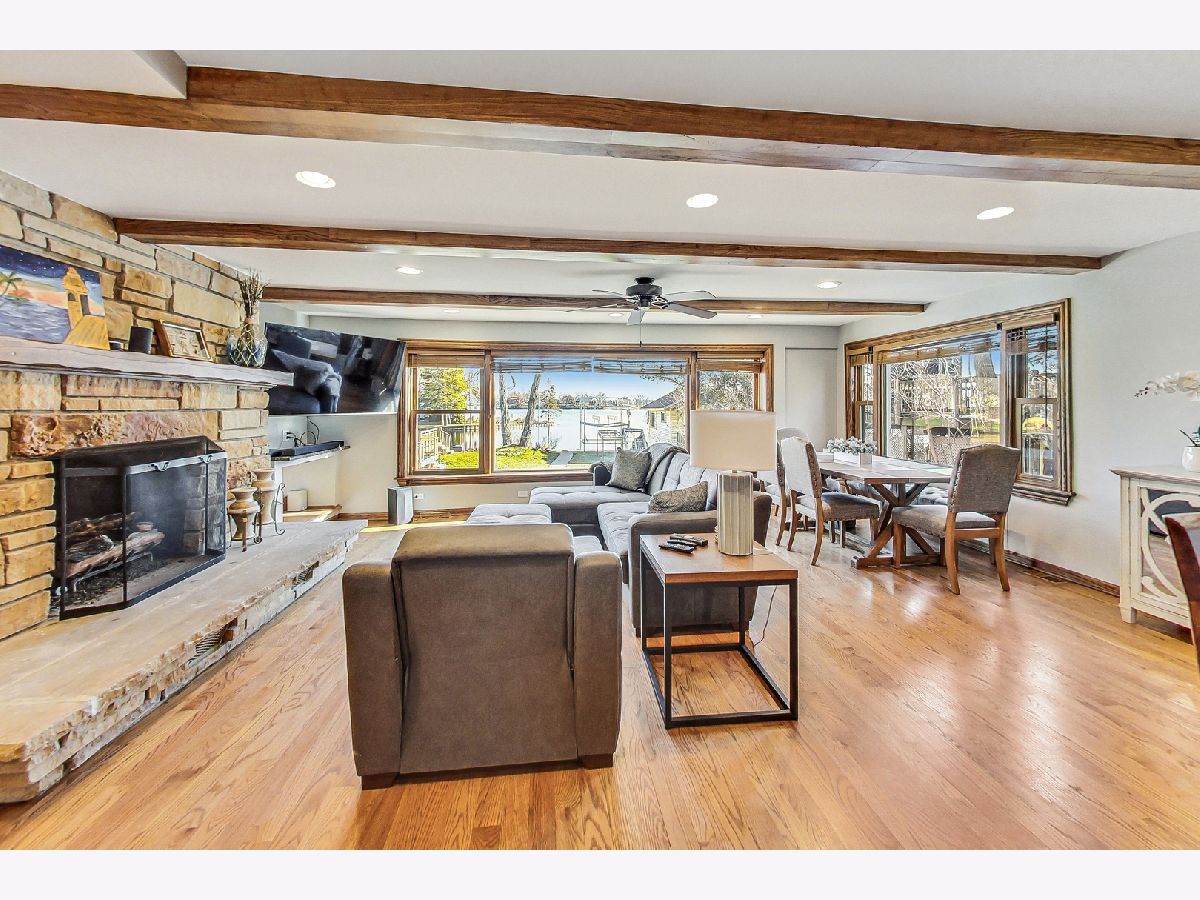 BEAUTIFUL, two-story waterfront property located in the highly desirable township of Ingleside! This 3 bedroom, 2 bathroom home offers a charming interior with a spacious open floor plan that includes over 1,500 square feet of living space! This Cape Cod-style home provides an open concept layout on the main floor that offers a seamless flow between the living, dining, and kitchen areas! The main floor features a spacious-sized living room with a gas starter fireplace and cobblestone mantle, and includes large picture windows that provide abundant natural light with stunning views of the surrounding lake! The living room also provides direct access to the backyard with separate sliding doors. The entire interior of the home has been recently repainted and includes refinished hardwood floors throughout (2021). The updated kitchen features cherry cabinets, granite countertops, and stainless steel appliances. The kitchen also includes an island with a two-person breakfast bar, providing plenty of additional counter space. The main level also features a laundry room, and a full bathroom with a newly installed toilet (2021). The second level offers three perfectly-sized bedrooms, including a spacious master suite with picturesque views of the lake. The second floor provides an additional full bathroom that has been completely updated and includes a new toilet (2021). The lower level offers a partially finished basement with direct access to the backyard. The home is equipped with an updated furnace (2020), boiler (2020), hot water heater (2020), and air conditioning system (2020). The exterior of the property features a large backyard with a concrete paver patio that leads directly to a aluminum metal deck surrounding the lake with boat access, perfect for outdoor gatherings! The home also includes an attached two-car garage with plenty of additional parking. This property is situated on a quiet tree-lined street near the lake, parks, biking trails, great schools, shops, and restaurants. The property is close to public transportation, including the Ingleside Metra Station, and a suburban bus route. The property is also conveniently located in an unincorporated area with relatively lower property taxes! LOCATION, LOCATION. This home is a must see, don't miss out! (*PLEASE NOTE: This sale also includes a pontoon (2015 StarCraft) and electric boat lift with two remotes)