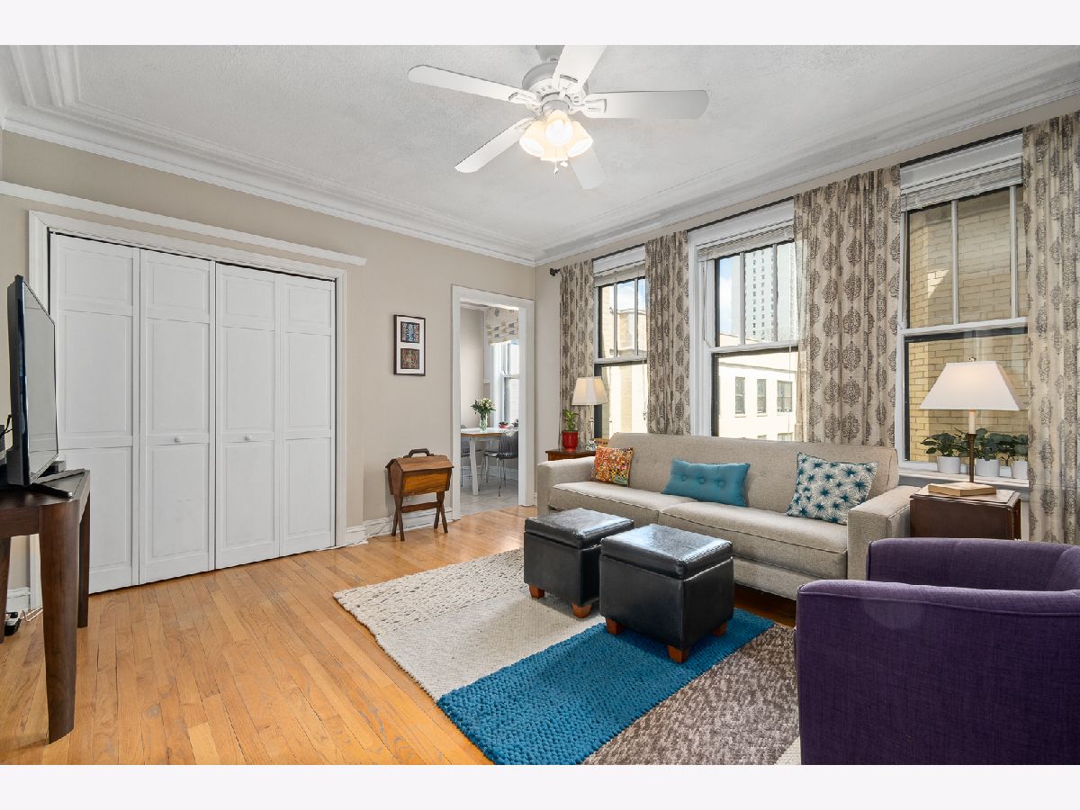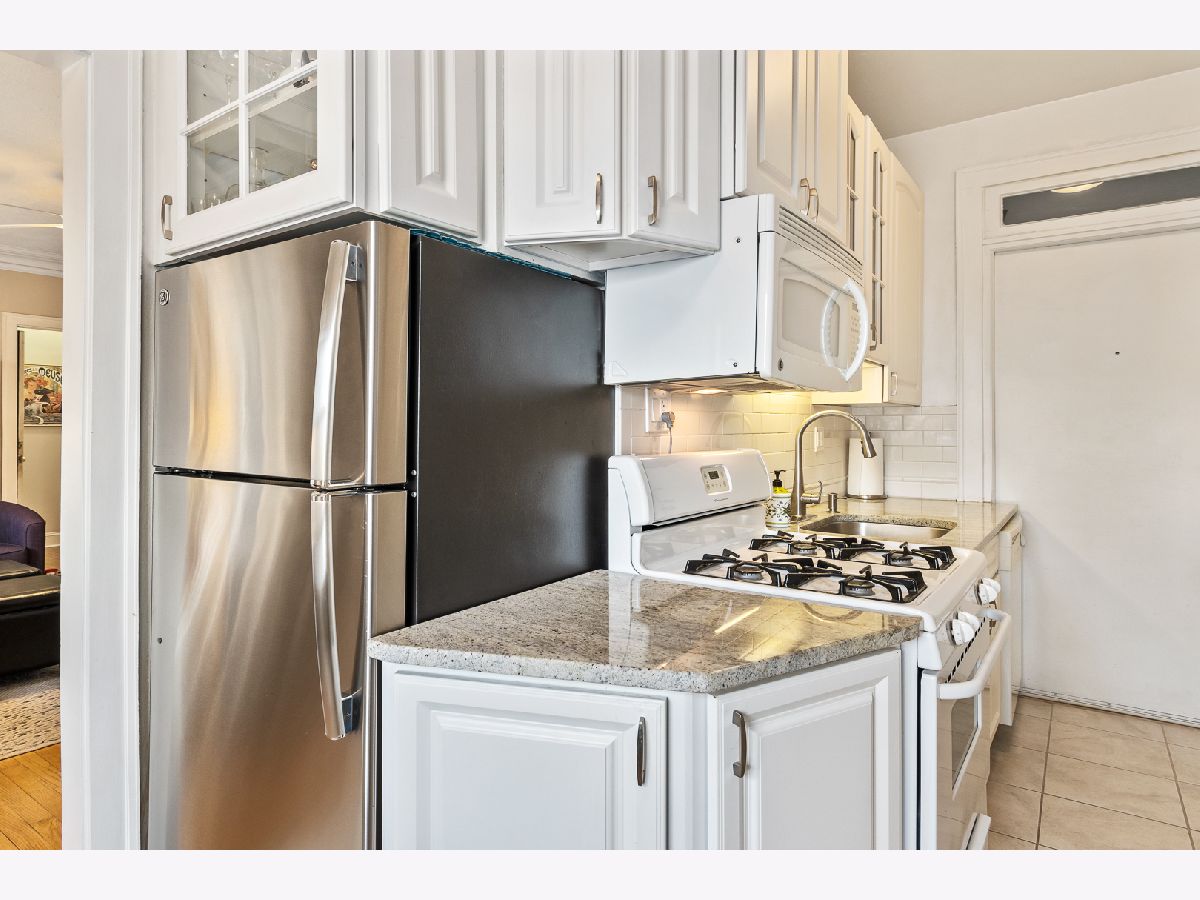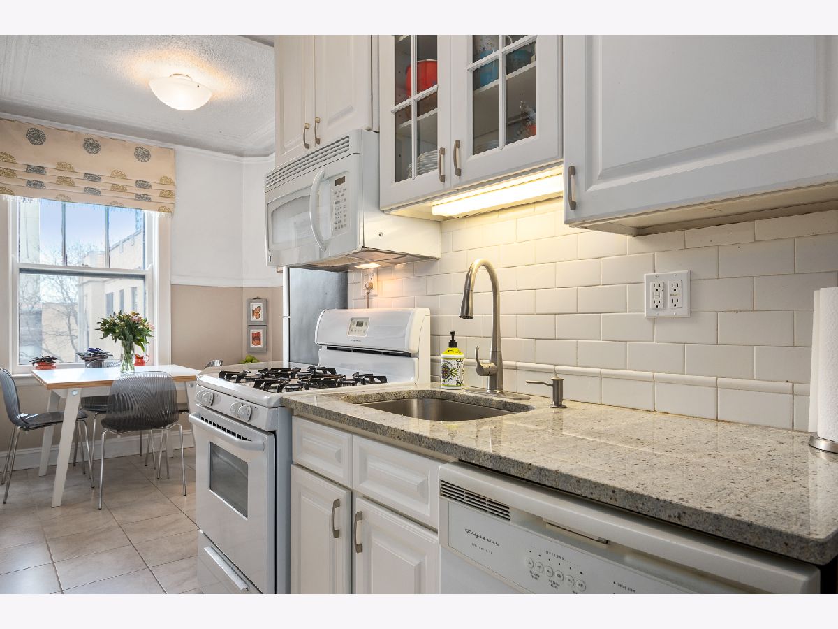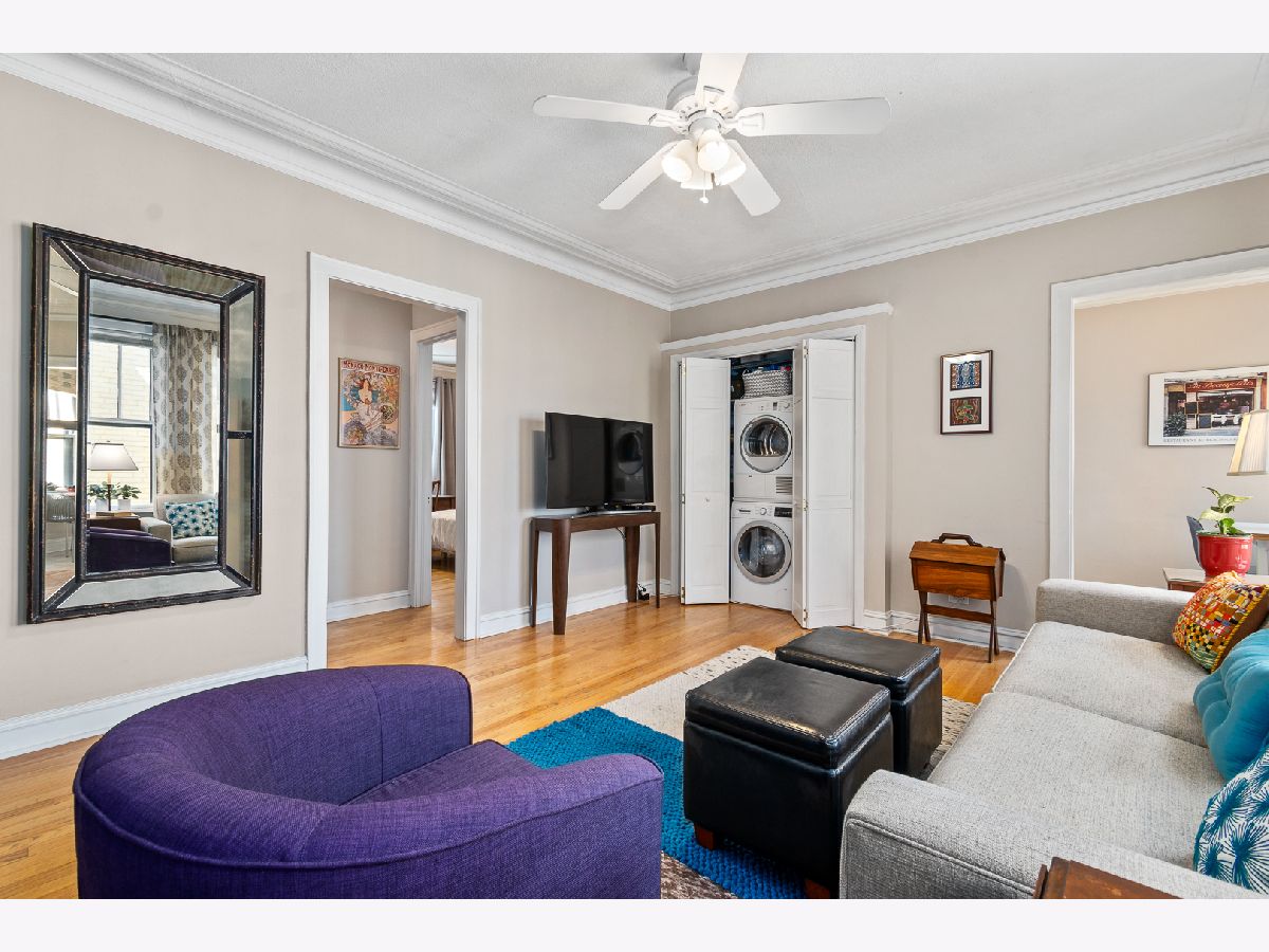 East Lakeview top floor 1 bedroom 1 bath includes Bosch in-unit stackable washer & dryer. Large living area has full wall of east facing windows with tons of morning light. Kitchen features white cabinets, stainless steel fridge, granite counters, subway tile backsplash and room for dining table. Large bedroom has 2 closets with lots of storage. Updated bathroom has west facing window. Hardwood floors. Gated courtyard is professionally landscaped. Amazing location just steps to the lakefront, restaurants, shopping and short walk to Addison Red Line. Assessments include heat, gas, cable TV & internet. Storage closet & bike area in the basement. Owner currently rents garage parking 1/2 block away at 3600 LSD.