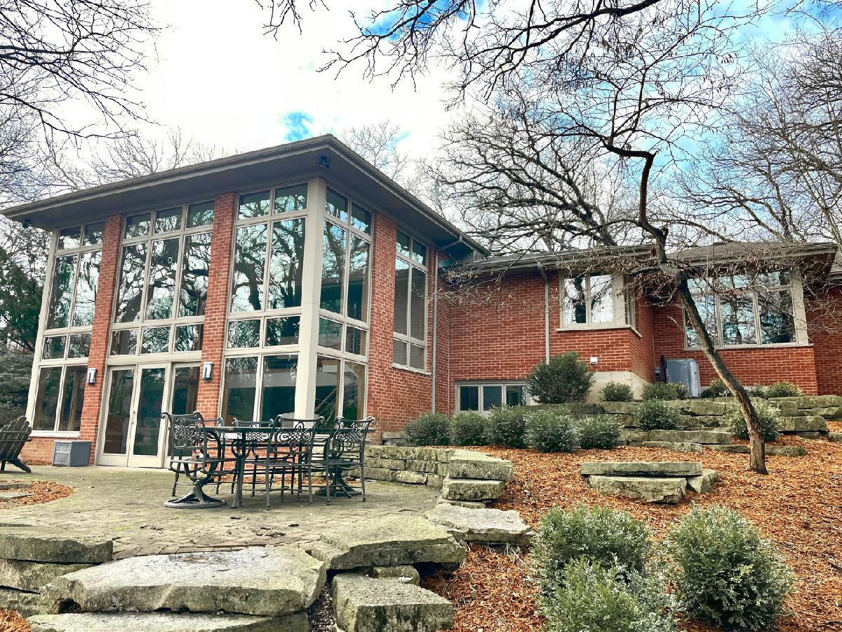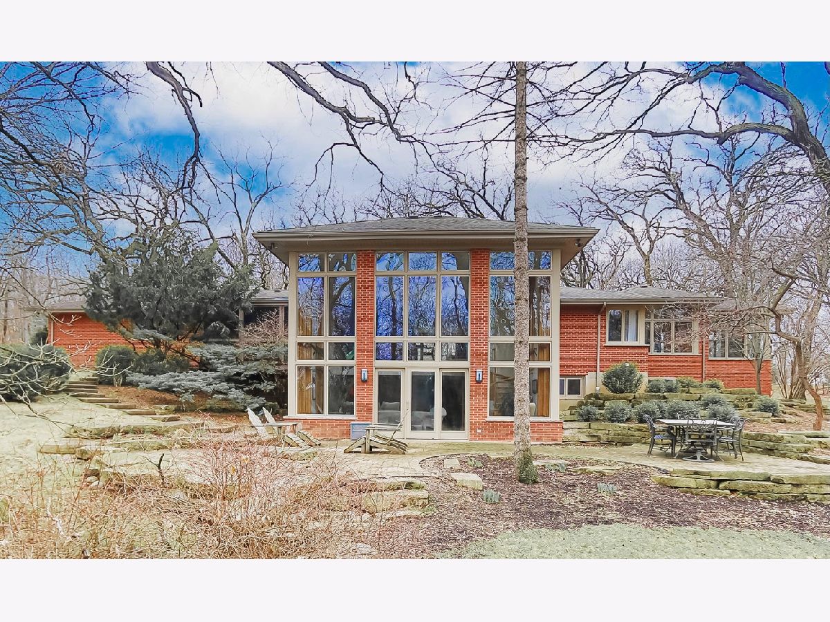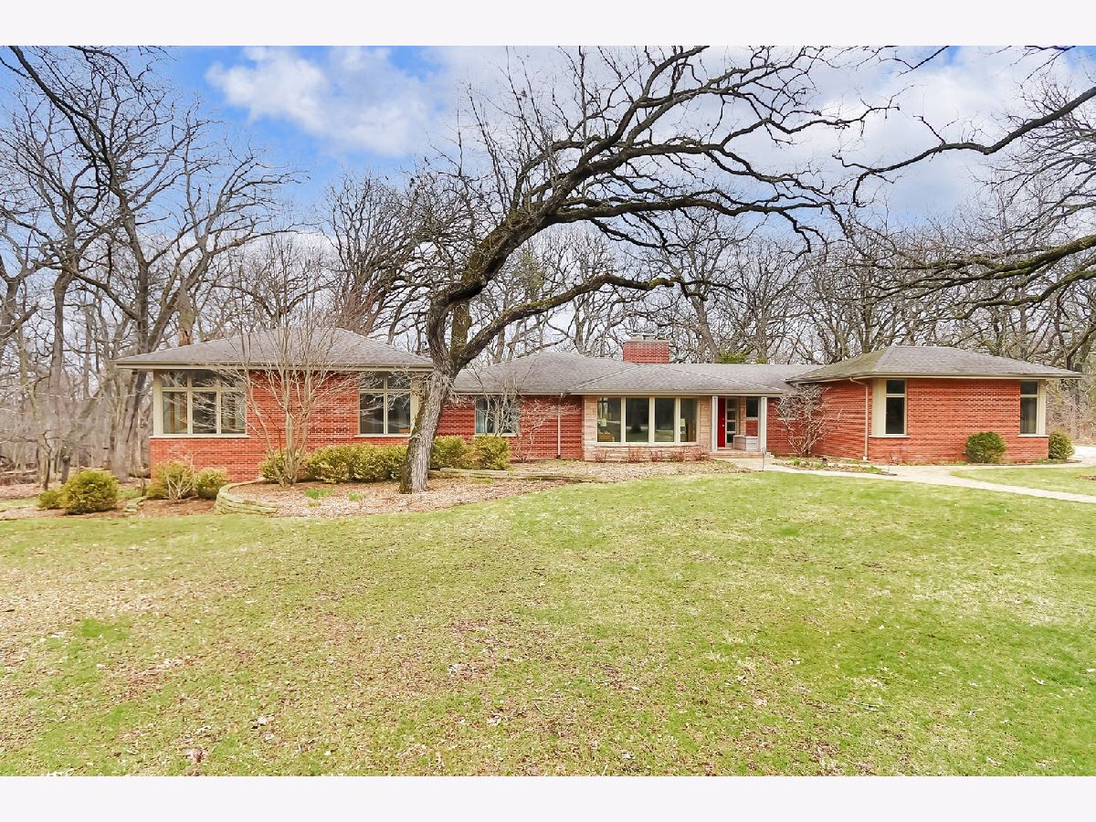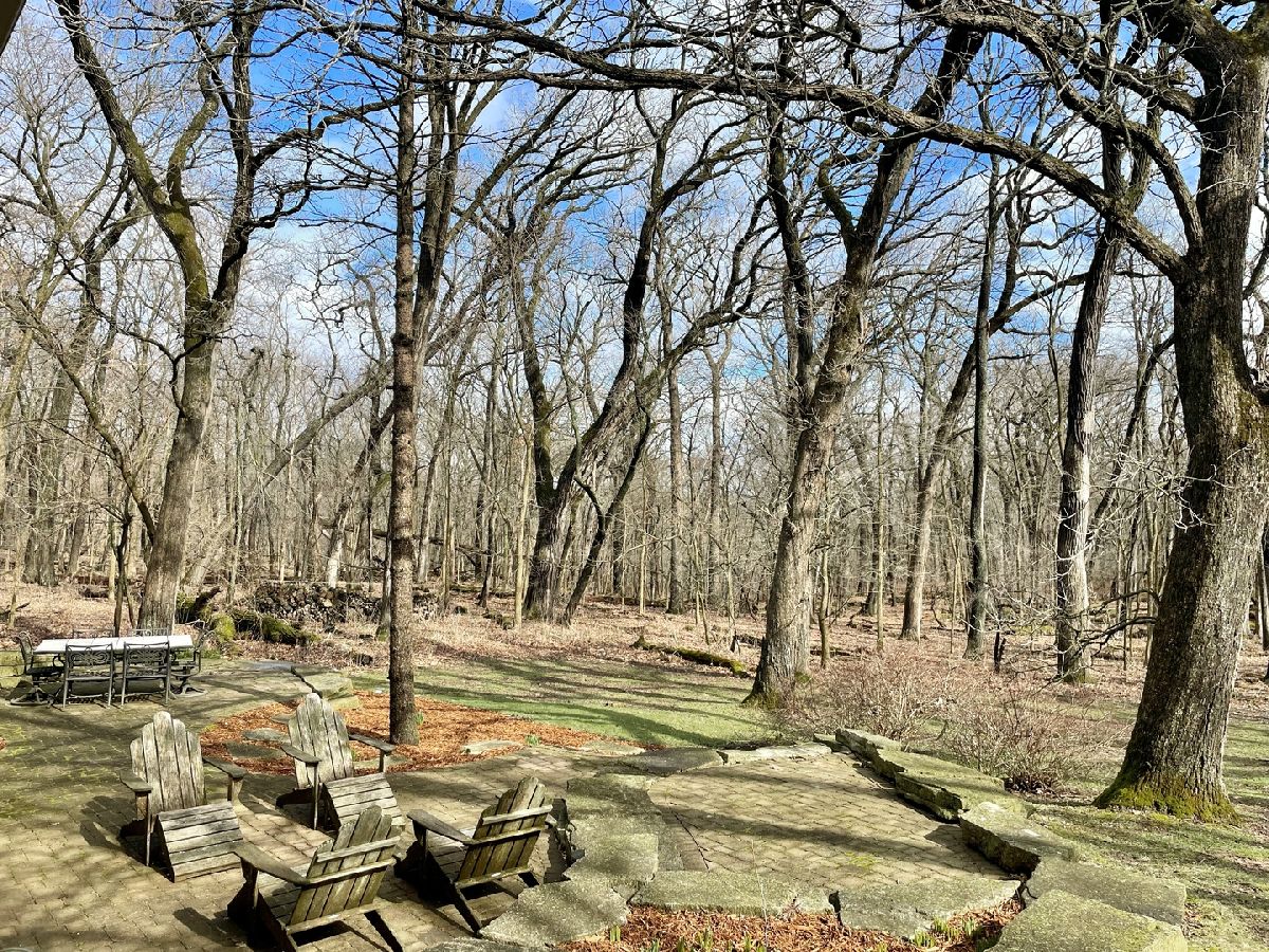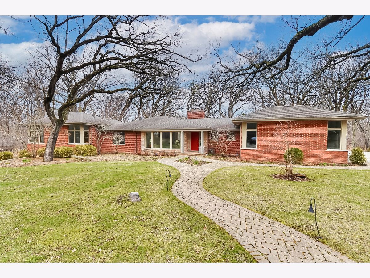 Towering mature oak trees surround this beautiful brick mid-century modern ranch home with expansive walkout lower level on a unique private, serene wooded Barrington Hills property. This elegant, updated, meticulously maintained home has a chef's kitchen with center island, wood cabinetry, granite counters and stainless appliances, open to large dining and living rooms with a double-sided fireplace, all overlooking a stunning walkout lower level great room featuring heated floors and walls of two-story windows with panoramic views of the property. Natural light on three sides! Sliding doors open to huge stone patio great for entertaining! Home is wired throughout for speedy ethernet network and sound system. Bright main floor primary suite with soaring ceilings, walk-in closet and spa bath with heated stone floors, double vanity, soaking tub and rain head shower with body sprays. A windowed study with woodland views, powder room with artisan stone sink and two large bedrooms sharing a full bath with stone flooring complete the main level. Lower level features a second office area plus media room (bring your speakers and big screen) or 4th bedroom with closet. Double-sided fireplace, library, exercise area, full marble bath, laundry room and huge storage area. See floor plans and 3D tour. Get back to nature and enjoy this spectacular lot surrounded by forest preserve, yet only 10 minutes from town, Metra and I-90. Barrington Hills Riding Center is nearby and riding trails. A must see for that special buyer who appreciates nature, privacy and serene living.