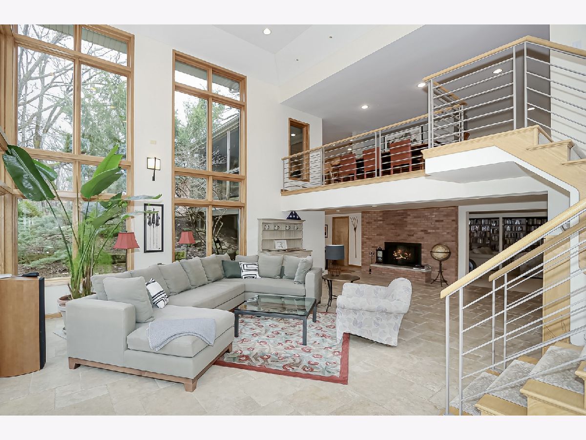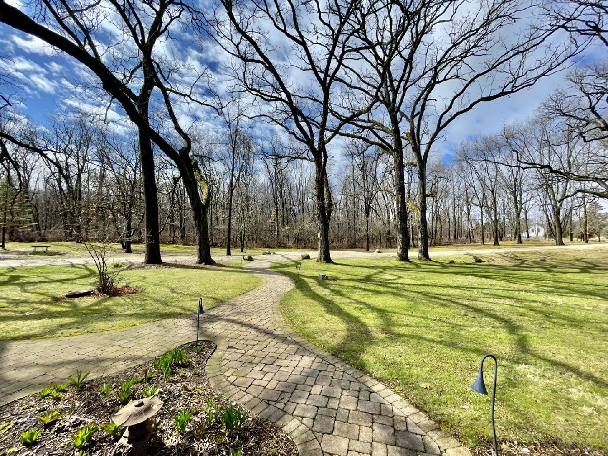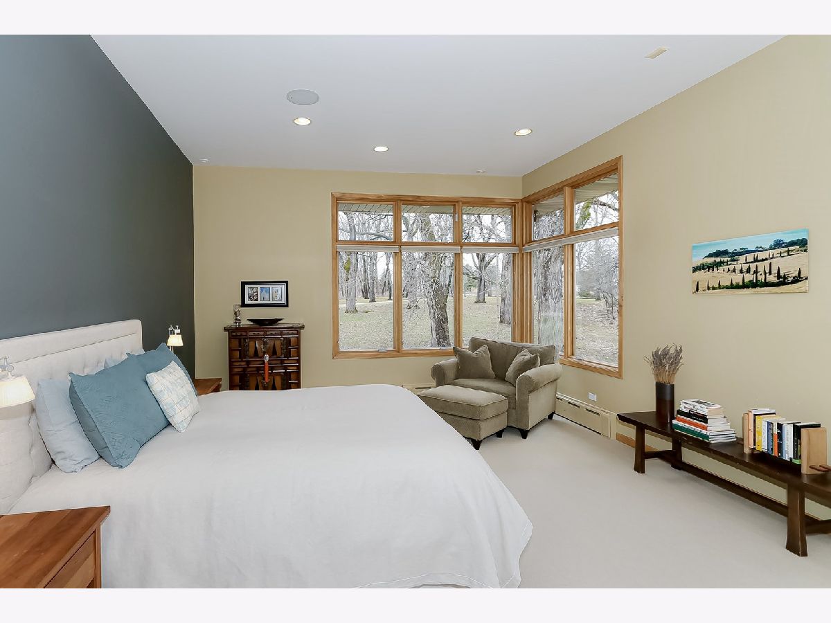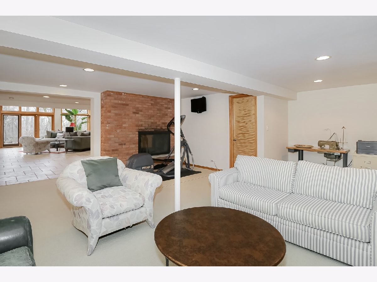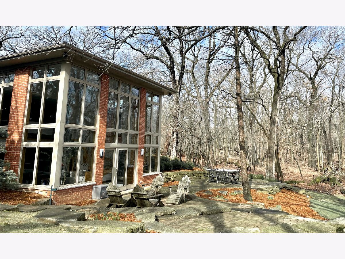 Towering mature oak trees surround this beautiful brick mid-century modern ranch home with expansive walkout lower level on a unique private, serene wooded Barrington Hills property. This elegant, updated, meticulously maintained home has a chef's kitchen with center island, wood cabinetry, granite counters and stainless appliances, open to large dining and living rooms with a double-sided fireplace, all overlooking a stunning walkout lower level great room featuring heated floors and walls of two-story windows with panoramic views of the property. Natural light on three sides! Sliding doors open to huge stone patio great for entertaining! Home is wired throughout for speedy ethernet network and sound system. Bright main floor primary suite with soaring ceilings, walk-in closet and spa bath with heated stone floors, double vanity, soaking tub and rain head shower with body sprays. A windowed study with woodland views, powder room with artisan stone sink and two large bedrooms sharing a full bath with stone flooring complete the main level. Lower level features a second office area plus media room (bring your speakers and big screen) or 4th bedroom with closet. Double-sided fireplace, library, exercise area, full marble bath, laundry room and huge storage area. See floor plans and 3D tour. Get back to nature and enjoy this spectacular lot surrounded by forest preserve, yet only 10 minutes from town, Metra and I-90. Barrington Hills Riding Center is nearby and riding trails. A must see for that special buyer who appreciates nature, privacy and serene living.