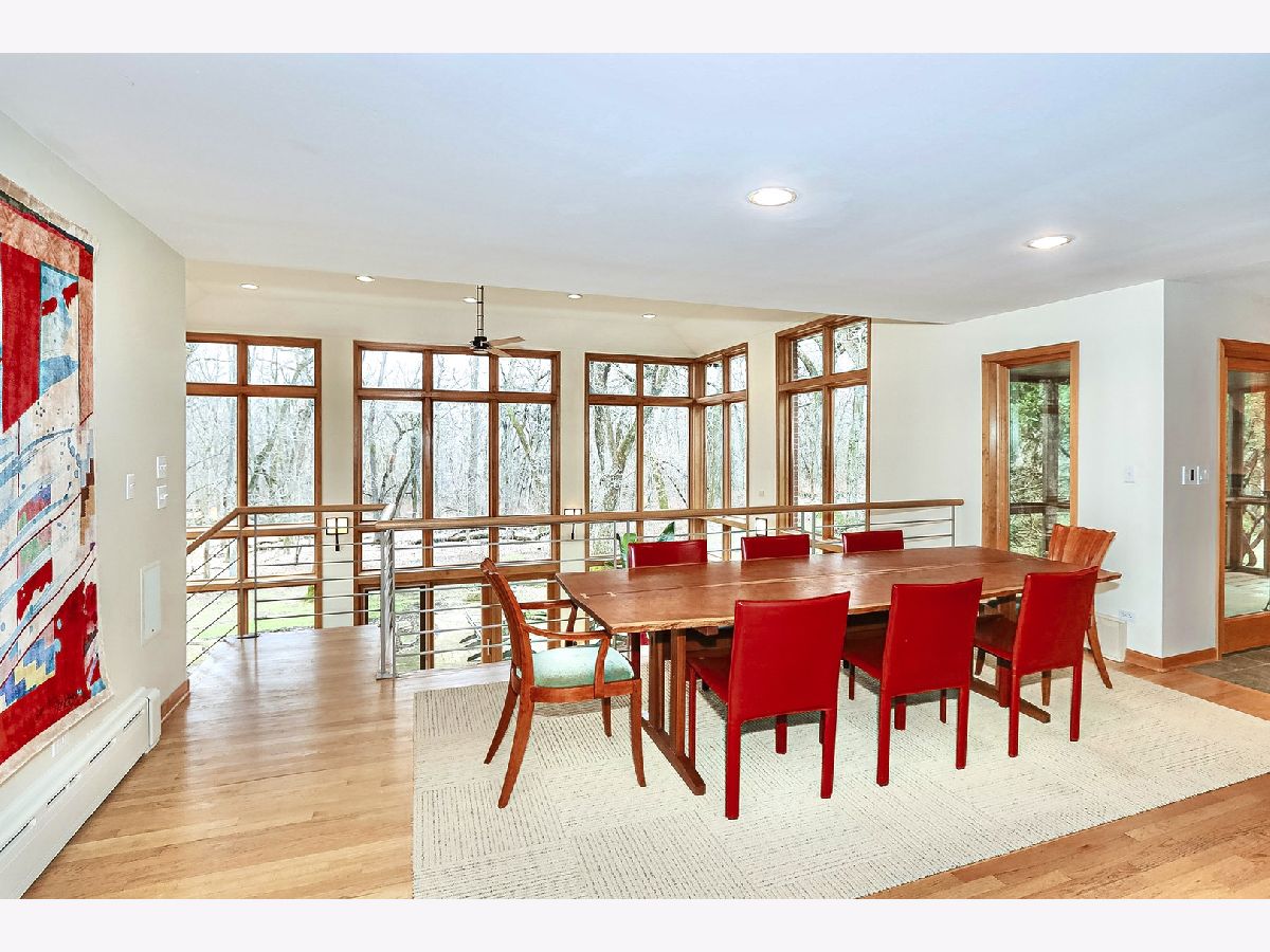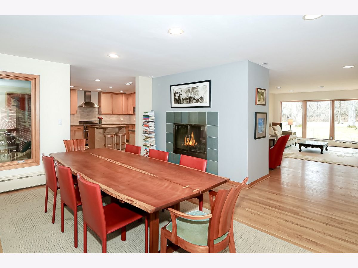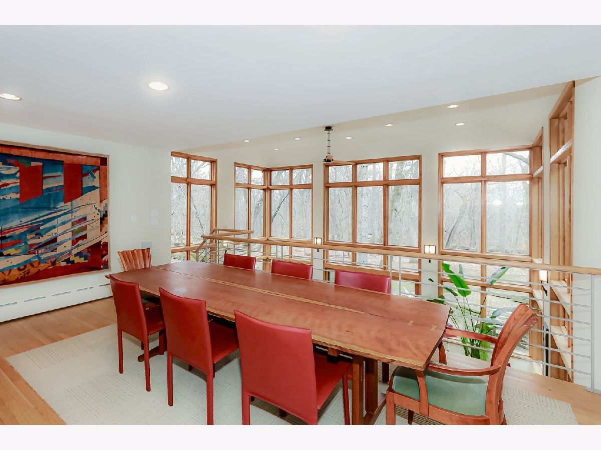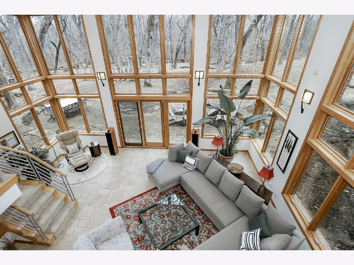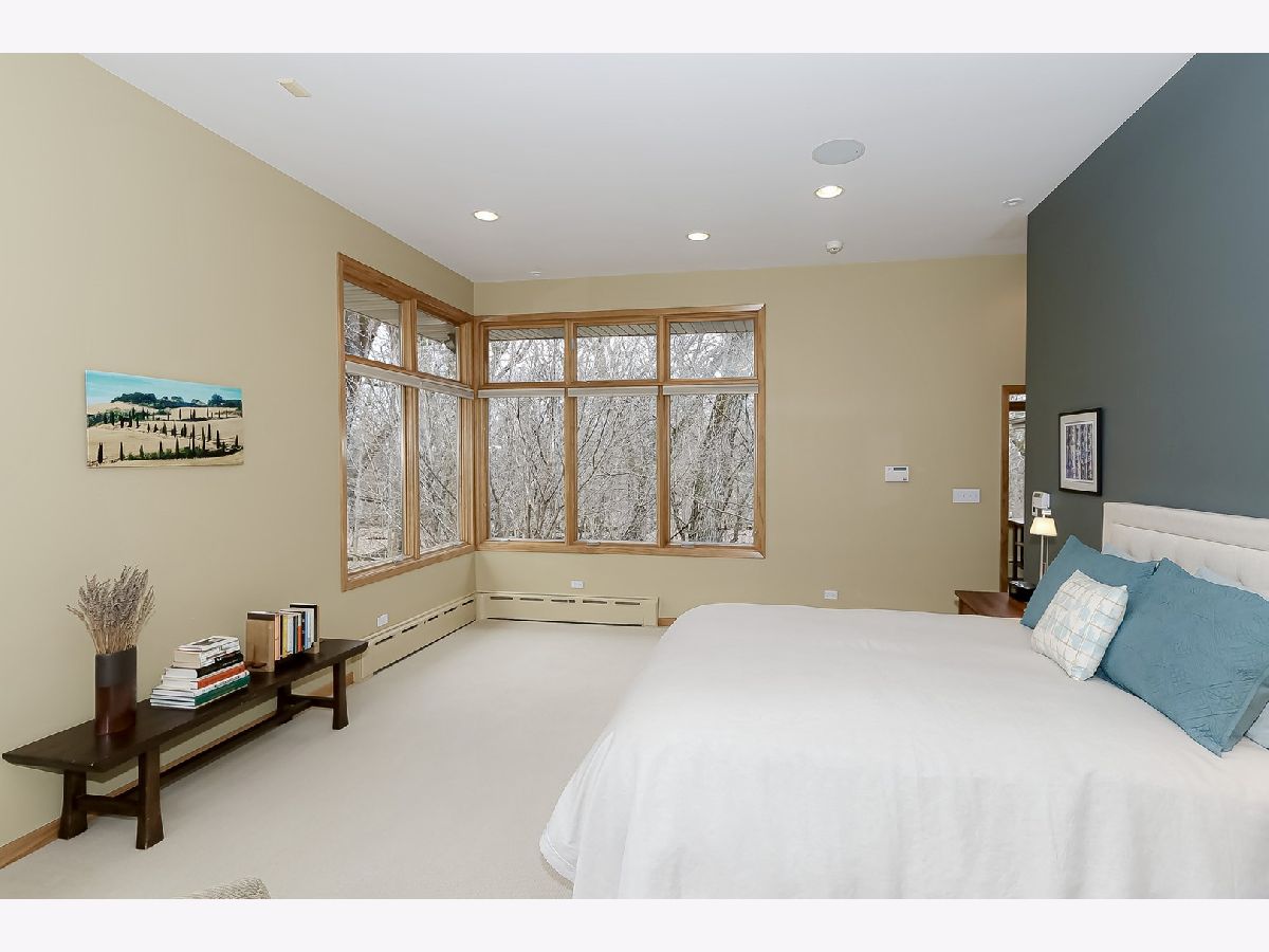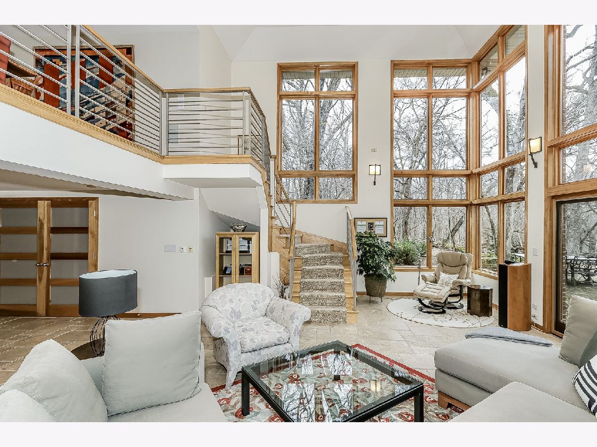 Towering mature oak trees surround this beautiful brick mid-century modern ranch home with expansive walkout lower level on a unique private, serene wooded Barrington Hills property. This elegant, updated, meticulously maintained home has a chef's kitchen with center island, wood cabinetry, granite counters and stainless appliances, open to large dining and living rooms with a double-sided fireplace, all overlooking a stunning walkout lower level great room featuring heated floors and walls of two-story windows with panoramic views of the property. Natural light on three sides! Sliding doors open to huge stone patio great for entertaining! Home is wired throughout for speedy ethernet network and sound system. Bright main floor primary suite with soaring ceilings, walk-in closet and spa bath with heated stone floors, double vanity, soaking tub and rain head shower with body sprays. A windowed study with woodland views, powder room with artisan stone sink and two large bedrooms sharing a full bath with stone flooring complete the main level. Lower level features a second office area plus media room (bring your speakers and big screen) or 4th bedroom with closet. Double-sided fireplace, library, exercise area, full marble bath, laundry room and huge storage area. See floor plans and 3D tour. Get back to nature and enjoy this spectacular lot surrounded by forest preserve, yet only 10 minutes from town, Metra and I-90. Barrington Hills Riding Center is nearby and riding trails. A must see for that special buyer who appreciates nature, privacy and serene living.