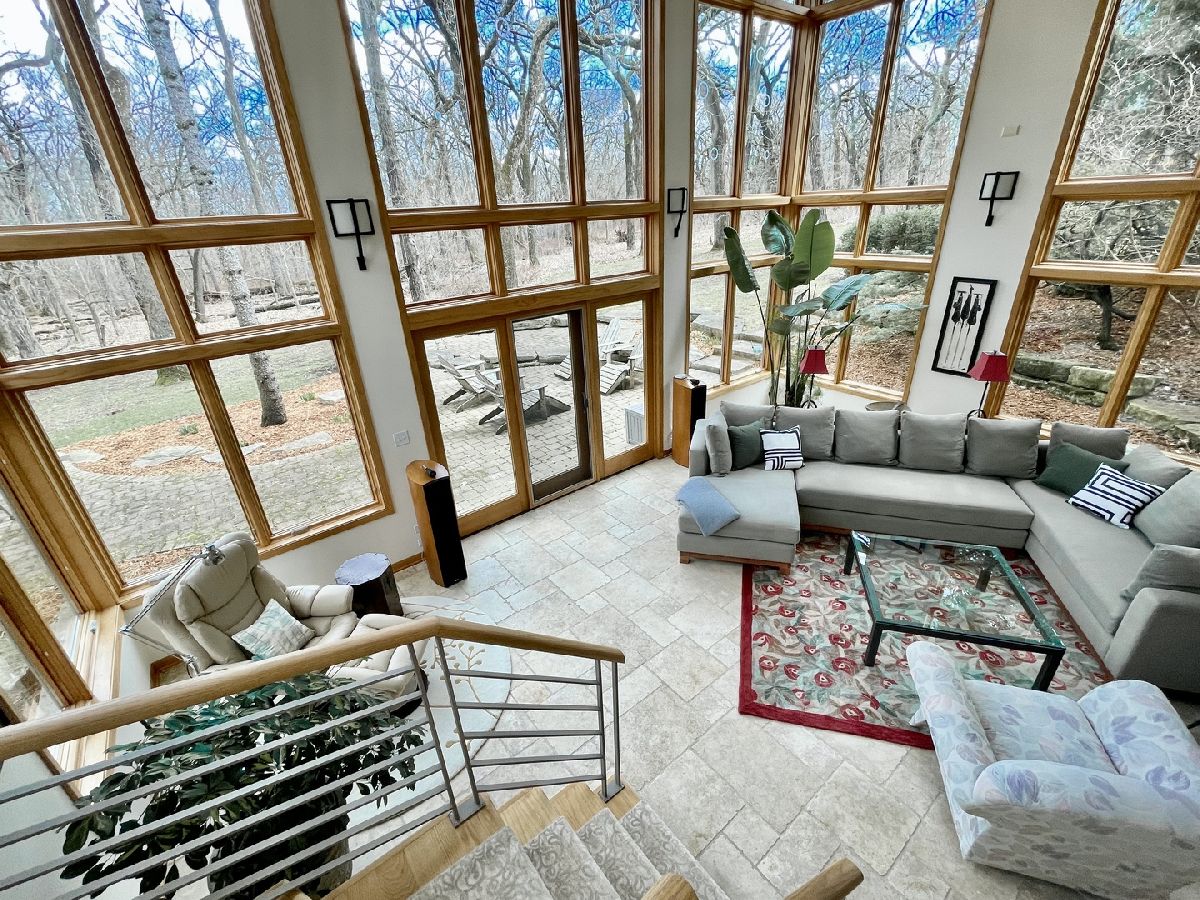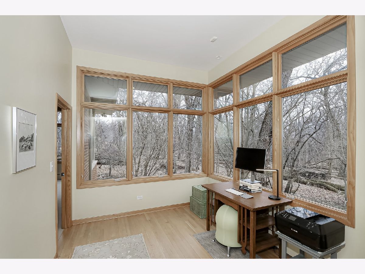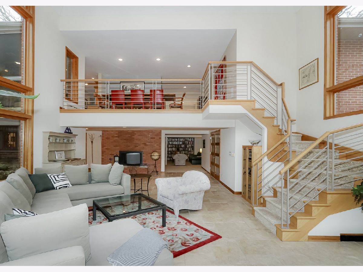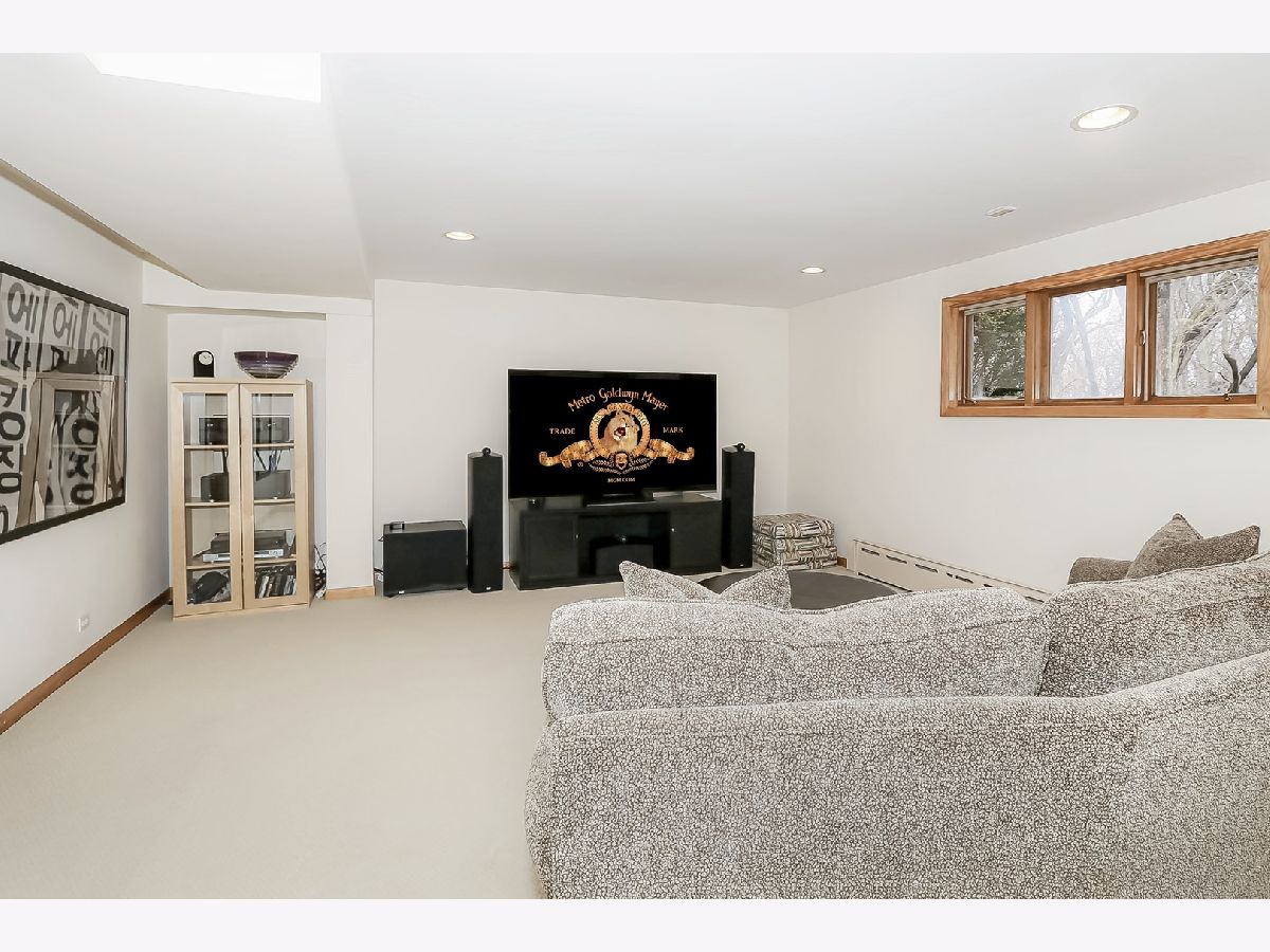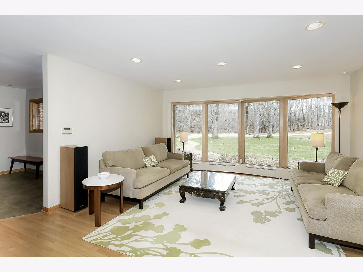 Towering mature oak trees surround this beautiful brick mid-century modern ranch home with expansive walkout lower level on a unique private, serene wooded Barrington Hills property. This elegant, updated, meticulously maintained home has a chef's kitchen with center island, wood cabinetry, granite counters and stainless appliances, open to large dining and living rooms with a double-sided fireplace, all overlooking a stunning walkout lower level great room featuring heated floors and walls of two-story windows with panoramic views of the property. Natural light on three sides! Sliding doors open to huge stone patio great for entertaining! Home is wired throughout for speedy ethernet network and sound system. Bright main floor primary suite with soaring ceilings, walk-in closet and spa bath with heated stone floors, double vanity, soaking tub and rain head shower with body sprays. A windowed study with woodland views, powder room with artisan stone sink and two large bedrooms sharing a full bath with stone flooring complete the main level. Lower level features a second office area plus media room (bring your speakers and big screen) or 4th bedroom with closet. Double-sided fireplace, library, exercise area, full marble bath, laundry room and huge storage area. See floor plans and 3D tour. Get back to nature and enjoy this spectacular lot surrounded by forest preserve, yet only 10 minutes from town, Metra and I-90. Barrington Hills Riding Center is nearby and riding trails. A must see for that special buyer who appreciates nature, privacy and serene living.