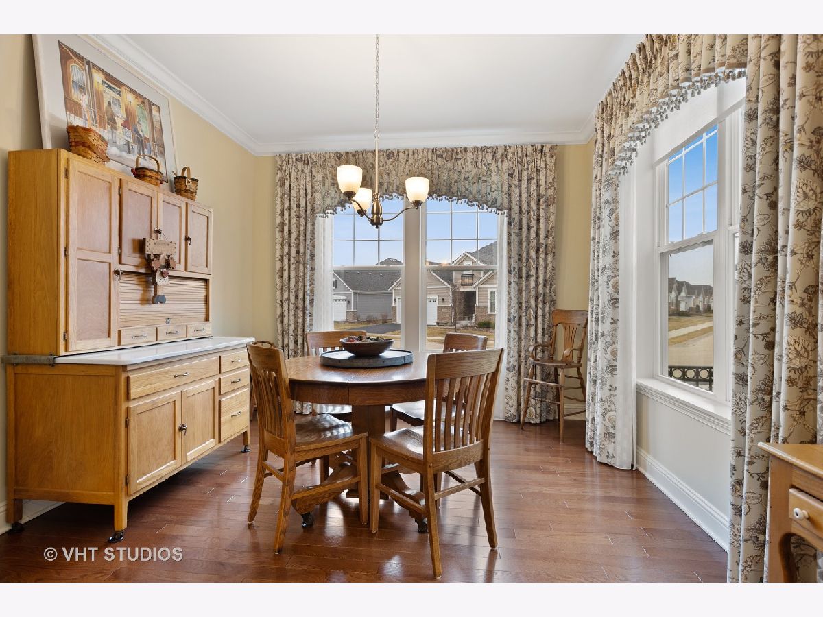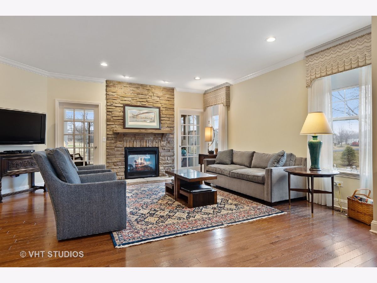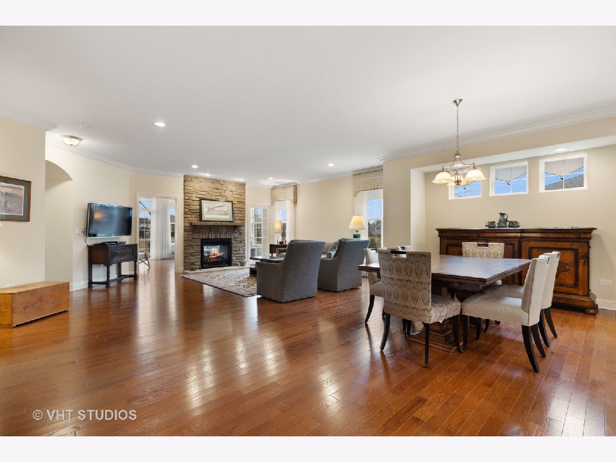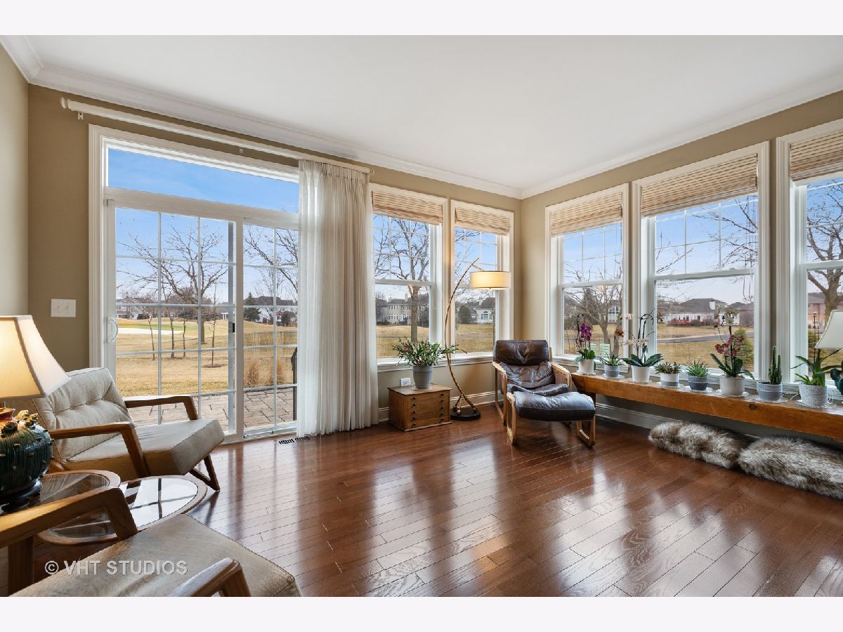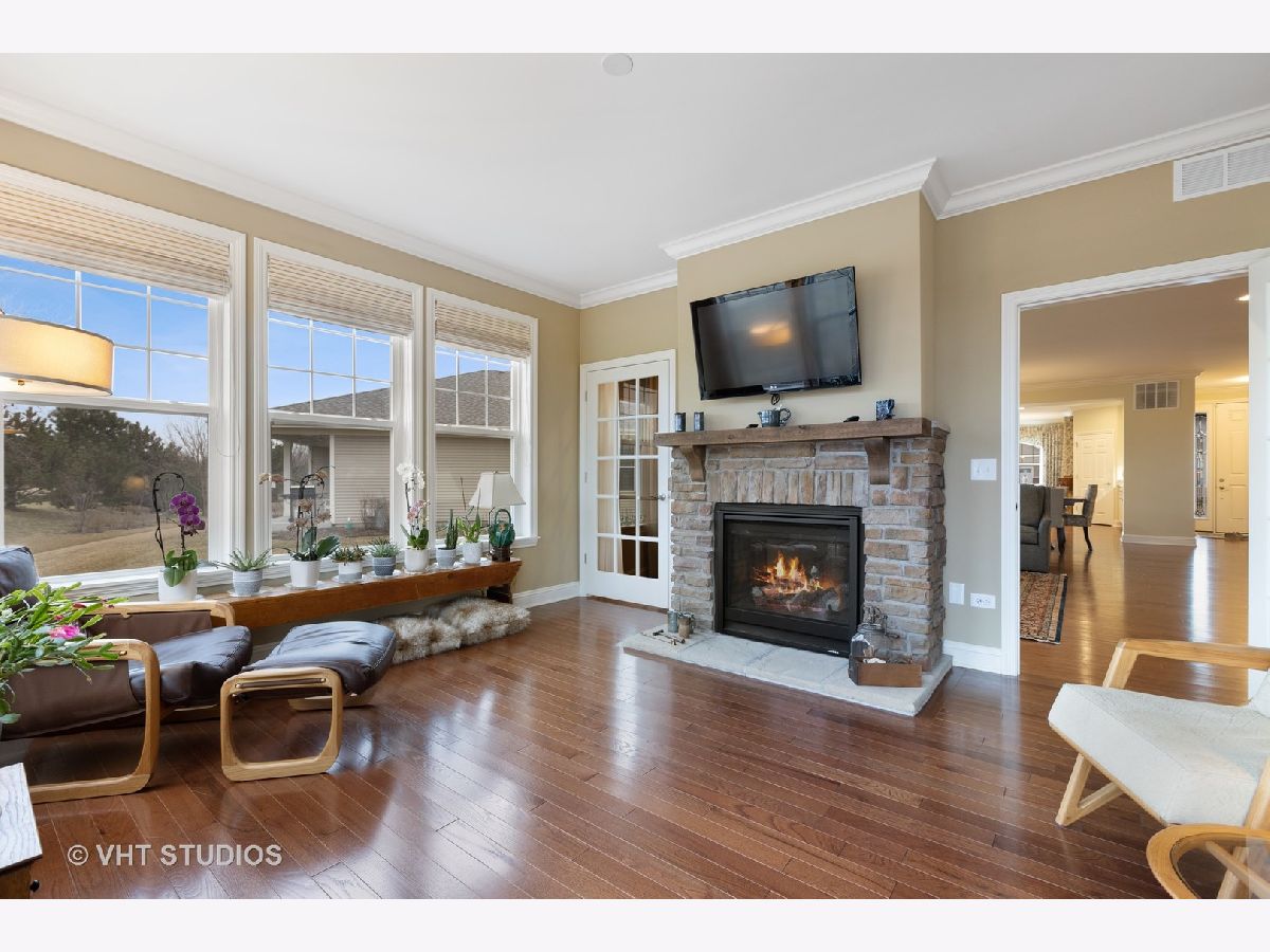 Gorgeous & Exquisite 3 yr. New home, on a phenomenal lot in the Carillon Club of Naperville, an active adult community. Attention to detail! The minute you drive up to this Metropolitan Ranch home you can see why this home is spectacular! The beautiful exterior of stone and vinyl siding is virtually maintenance free with entry door and stained glass sidelights with a welcoming covered porch to protect your guests from the weather. Upon entering the home you see the expansive living space, gleaming oak hardwood floors that are throughout the entire home, crown molding, 5" baseboards and loads of sunlight. This open floor plan is perfect for your everyday living and entertaining needs. The gourmet kitchen has an abundance of 42" Maple (bisque painted) cabinets with custom crown molding, pull out shelves, soft close drawers, a spacious walk-in pantry, granite counter tops, breakfast island, separate eating area AND premium Electrolux Stainless Steel appliances; double oven, microwave, 5 burner cook top and refrigerator along with a Bosch dishwasher. Your eyes will be drawn to professionally designed window treatments of valances, drapery, sheers and shades (every window in the home are fashionably appointed in the same manner.) The adjoining dinning room gives easy access to the host of the home for entertaining. The living room with a double-sided gas stone fireplace with French doors on both sides creates a double entry to the bright and spacious sunroom. Your master suite has his and her walk in closets, and a much desired linen closet. The master serenity shower with custom ceramic tile and glass enclosure is extra large. A comfort height vanity and make-up space along with an extra custom cabinet will provide all the bathroom storage you need. A 32" transom and larger operable window will provide sunlight and ventilation. The second bedroom on-suite with comfort height vanity, tub and custom ceramic tile is perfect for guests. An adjoining den can be used as a second living/family room, office space or playroom for the grandkids. Do you like the outdoors? Are you looking for a spacious professionally landscaped yard? This home has the largest lot in the Carillon and backs up to the White Eagle golf course (see Drone pictures.) Relax on your 490 square foot brick paver patio and enjoy the weather and golf course views. Be wowed with the expansive basement with additional storage space - plumbed-in & ready for your ideas. There are so many wonderful upgrades in this exquisite home - you have to see to believe! The Carillon Club is an over 55 active adult community and one owner must be 55 years old. The Carillon offers an indoor and outdoor pool, children's pool, tennis courts, exercise facility, activities, clubs and much, much more! Come live the life you have worked for!