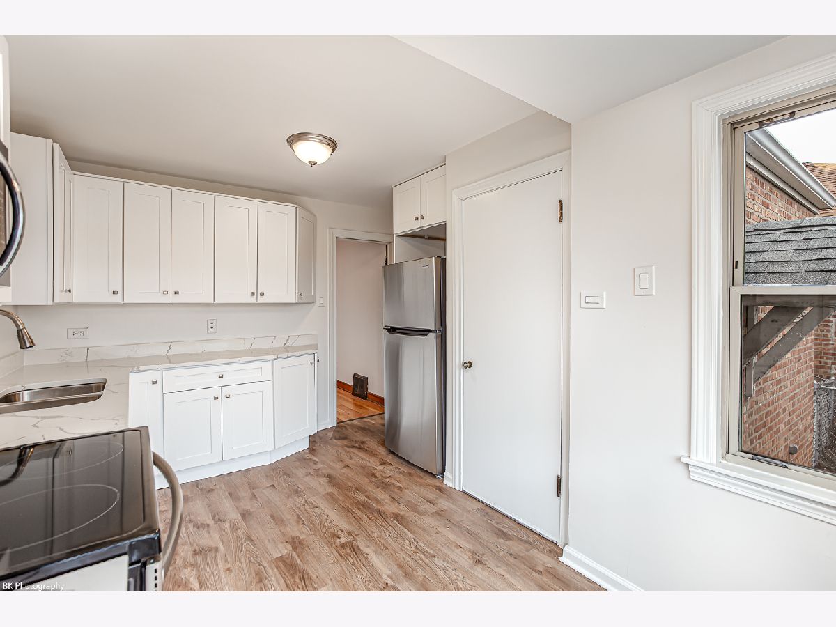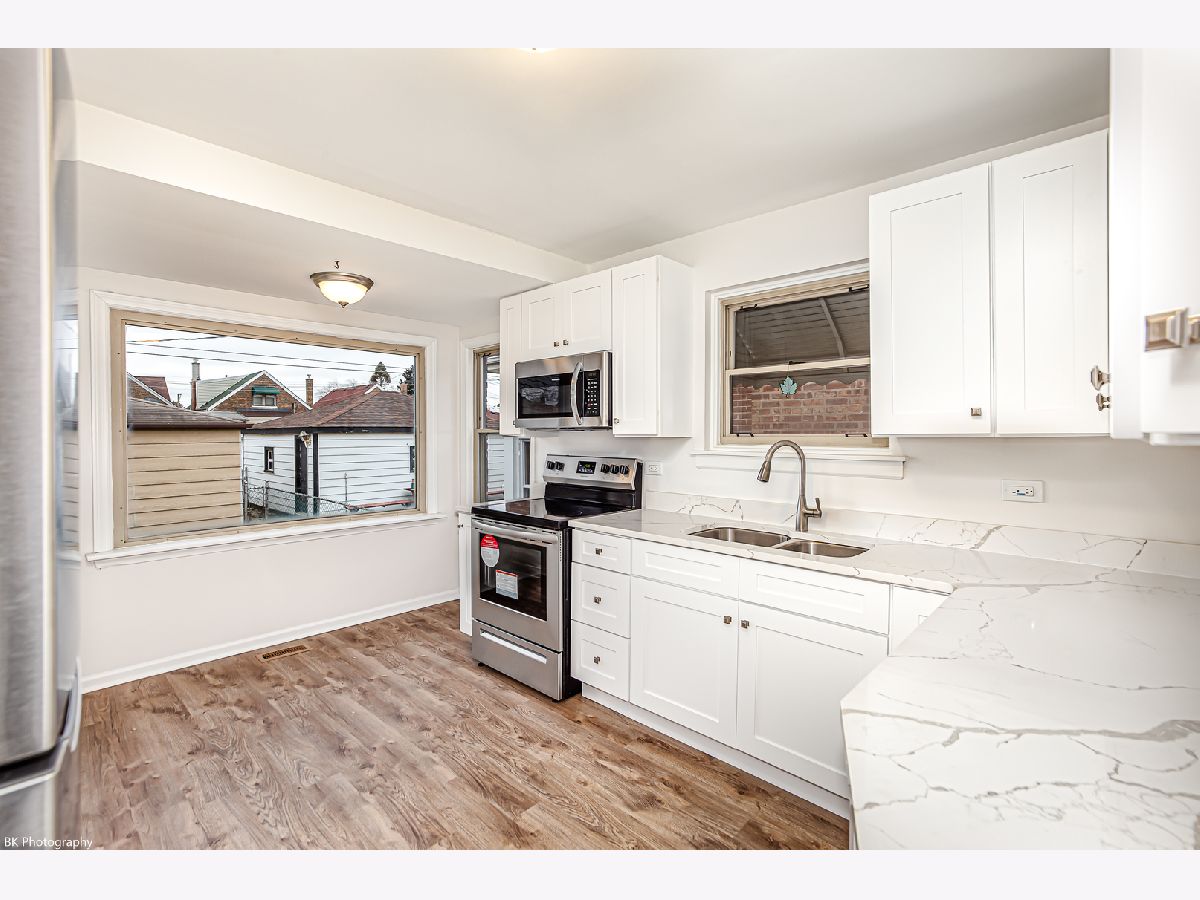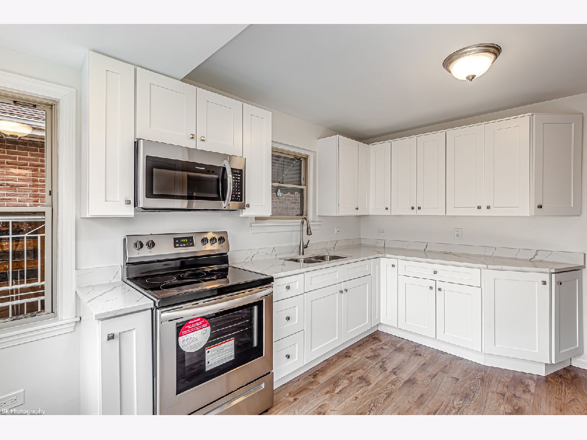 Gorgeous 2 bedroom 1 bath brick raised ranch features beautifully refinished hardwood floors, fresh paint, an inviting living room, formal dining room, brand new gourmet kitchen with high end white soft close cabinets, quartz countertops, stainless steel appliances, vinyl plank flooring and picture window overlooking the yard. The main level has two good sized bedrooms and a full bathroom with tub/shower combination. Amazing full unfinished basement with storage room and laundry with newer washer and dryer. Updated 200 amp electric! Good sized fenced yard. Detached two-car garage with alley access. New/Newer: kitchen renovation, kitchen plumbing, paint, flooring (2023), electric, sump pump (2022) and roof (8 years). Great location near shopping, restaurants, Senka park and Midway Airport! A short distance to I-55 and downtown Chicago!