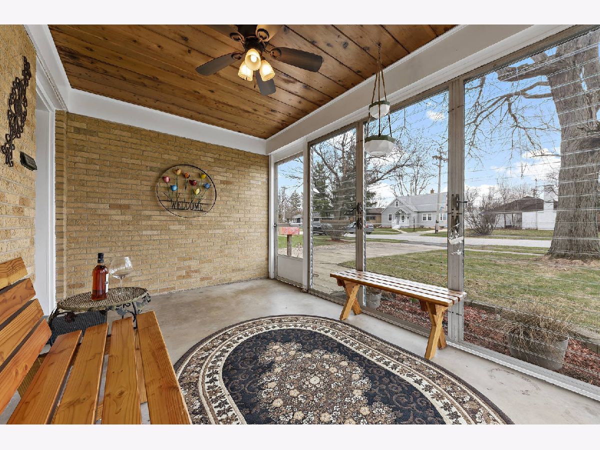MID-CENTURY ALL BRICK RANCH sitting on partially fenced CORNER LOT features ENCLOSED FRONT PORCH ceiling-to-floor jalousie windows, ceilings fans in enclosed porch and bedrooms. Small PATIO in backyard. Home has attached garage but is currently being used as an oversized WORKSHOP/STORAGE OR CAN BE MAN CAVE/SHE SHED/REC ROOM, laundry room, or storage room. Country kitchen with handmade cabinets on one side and newer cabinets on the other side for added storage, matching kitchen wood valances. Two nice-sized bedrooms, kitchen table & 6 chairs stay with full-price offer. Almost all newer APPLIANCES stay. Furnace is located in attic. Mostly all CONCRETE INTERIOR walls. Blocks from downtown Crete.