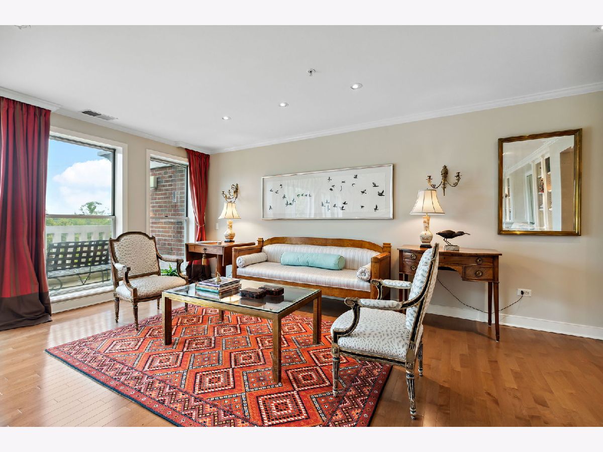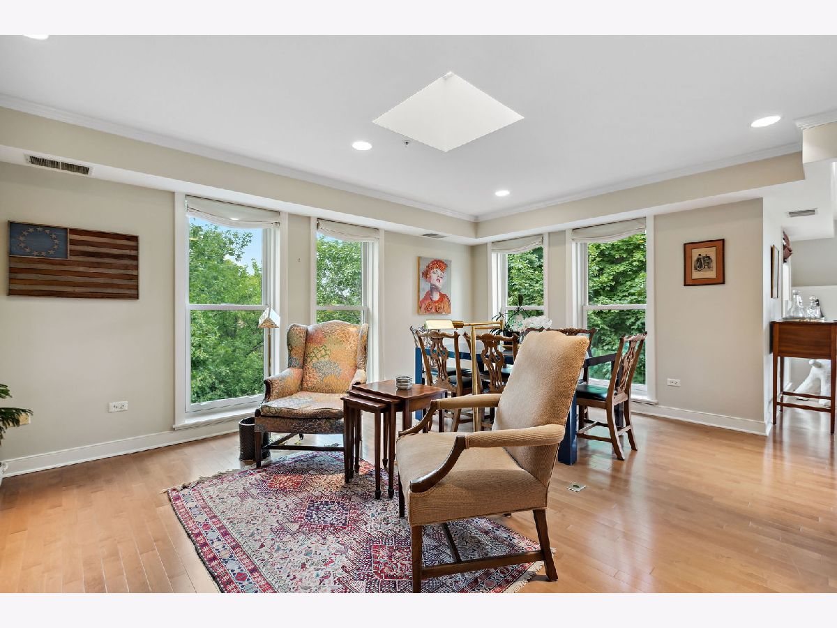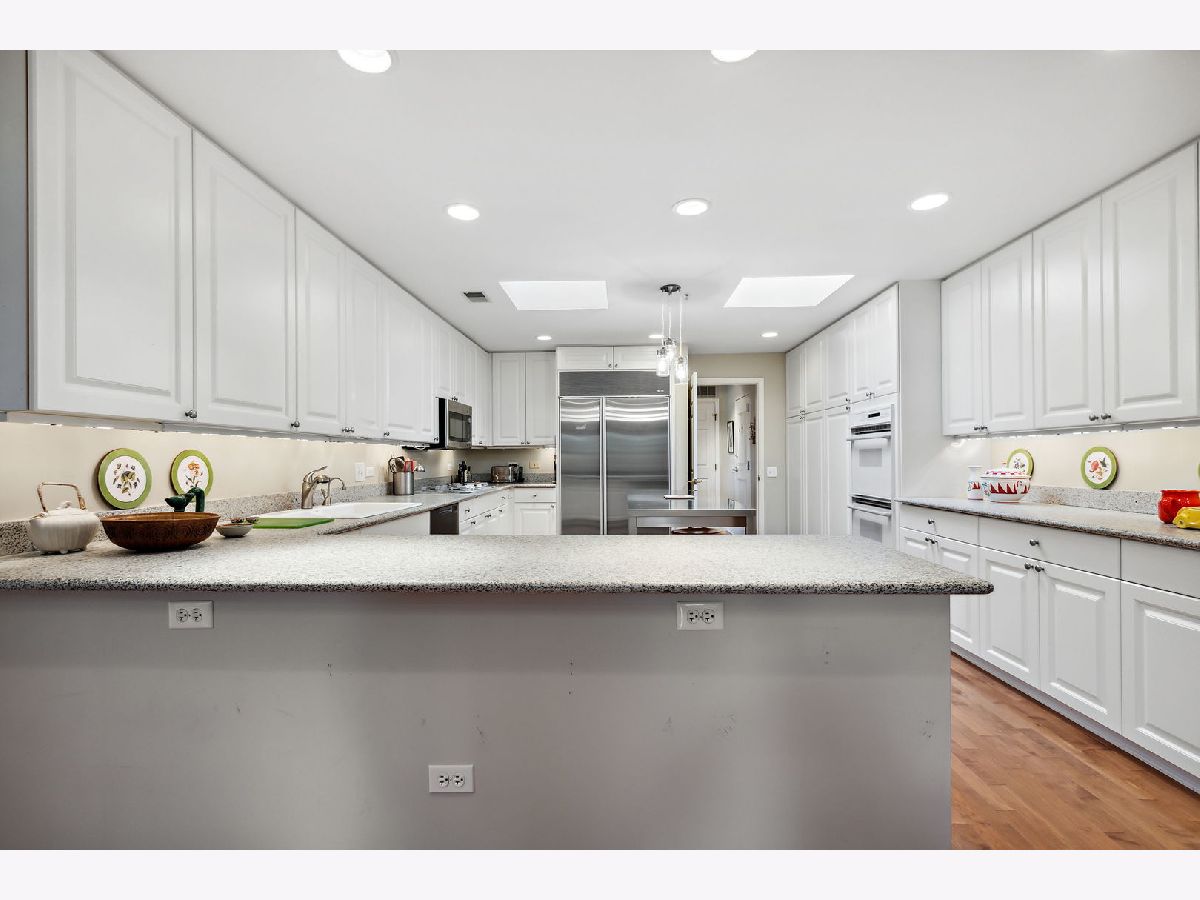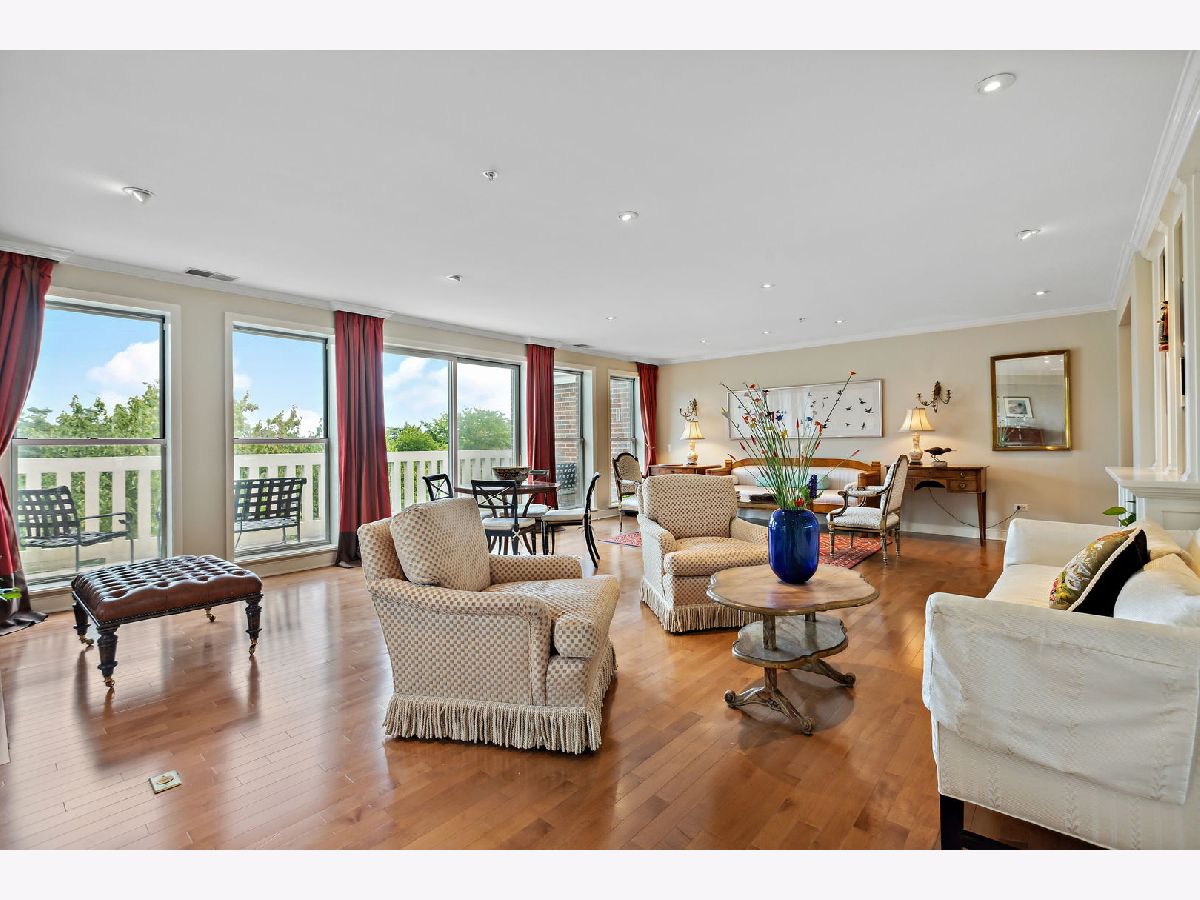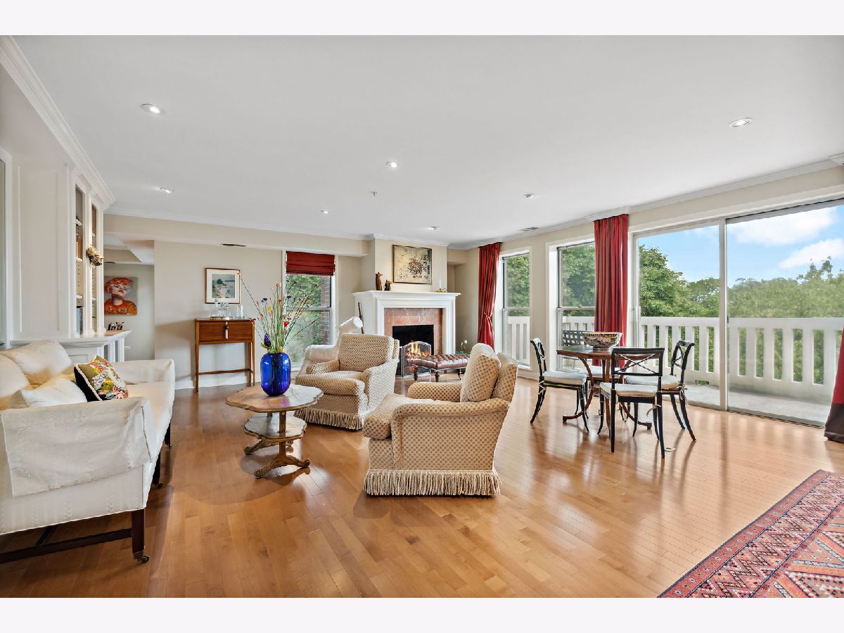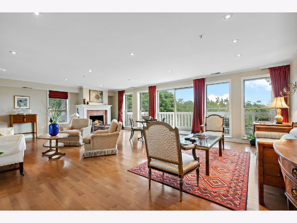 Rarely available, this top floor sophisticated penthouse has the most incomparable space and functional floor plan offering the best of living in desirable Hedge Row. One of the largest and gracious units in the building, this elegant 3 bedroom, 2 1/2 bath corner end unit overlooks the tree-tops creating a calm serene space, coupled with custom design features through-out composes harmonious and refined living. The wide foyer is welcoming and opens into the expansive living room and dining room encircled by greenery at every window brings the outdoors in. Combined with a warm fireplace, beautiful hardwood floors, extensive wood details, built-ins, beveled wall mirrors and a wall of windows overlooking the significant balcony - this home is so appealing and perfect for entertaining! The huge chef's kitchen features new stainless steel appliances, double oven, Fisher Paykel double DishDrawer, Sub-Zero Fridge, generous counter space and cabinets and large central eating area - great for an island or small table. Adjoining the kitchen is a comfortable family room - enjoy relaxing and cooking with this open living concept. The substantial primary bedroom has both a walk-in closet, additional large closet, linen closet and beautiful marble bath offering a double vanity, Kohler hardware, separate shower and jacuzzi tub. There are 2 additional bedrooms, several windows in each room and one with another walk-in closet. Also included is a laundry room with side-by-side washer/dryer and sink, large powder room for guests and 2 additional large hall closets for storage. This well-designed home flows from one room to the other with hardwood floors throughout and filled with light from 6 different sky-lights. Plus, there is an extra private storage room just off the 2 car garage spots - storage galore! Don't miss this tasteful home in a stellar locale near the library, in the heart of Winnetka, close to restaurants, shopping, train, beach and parks!