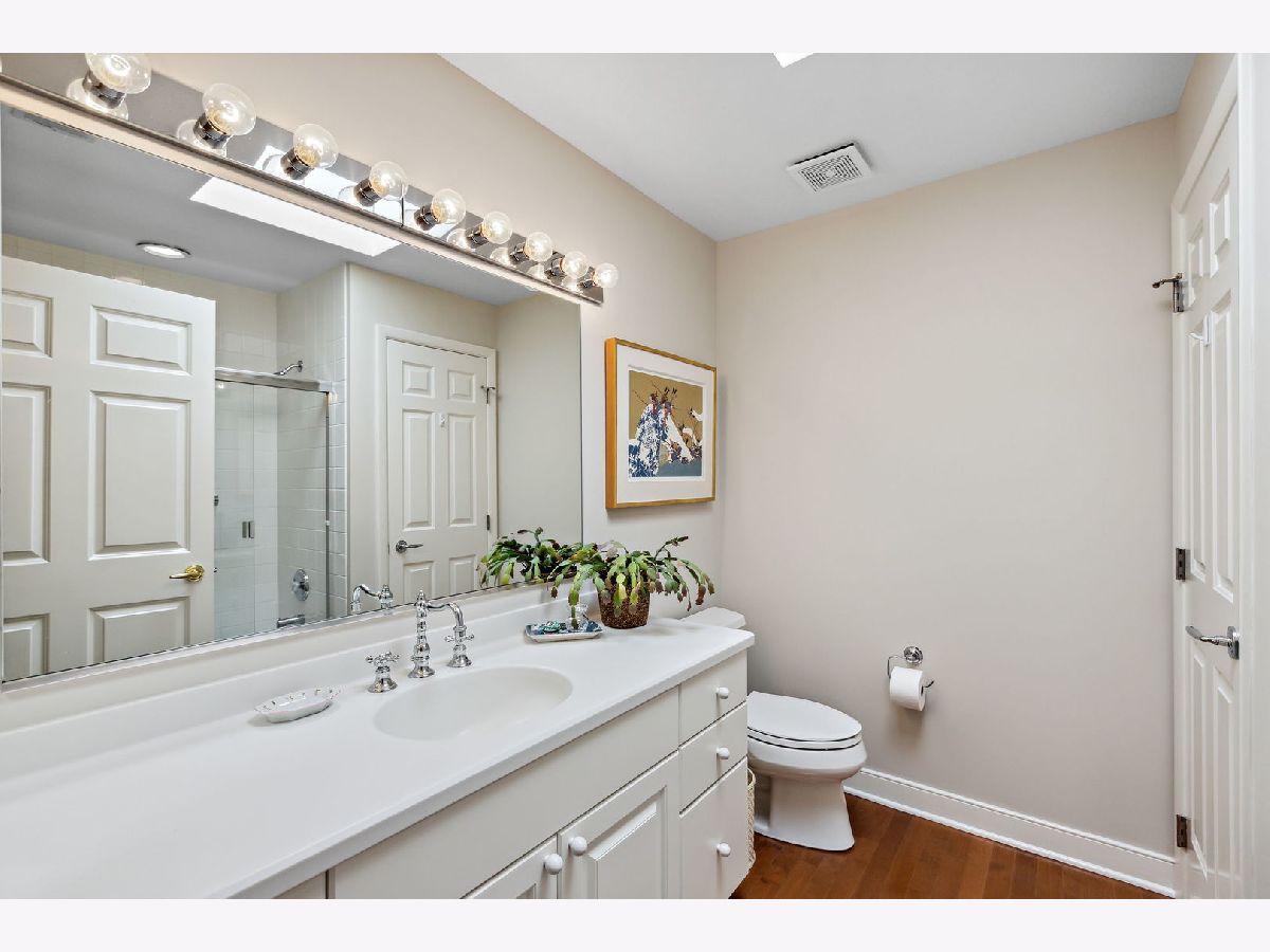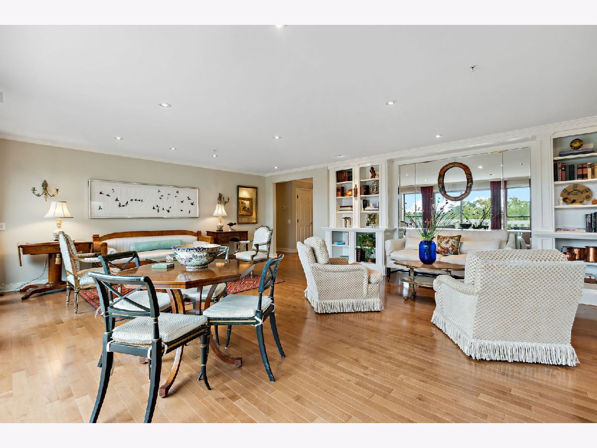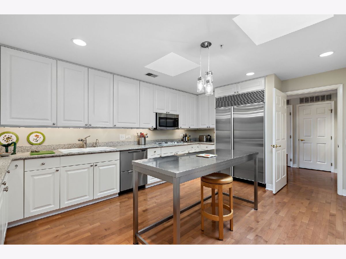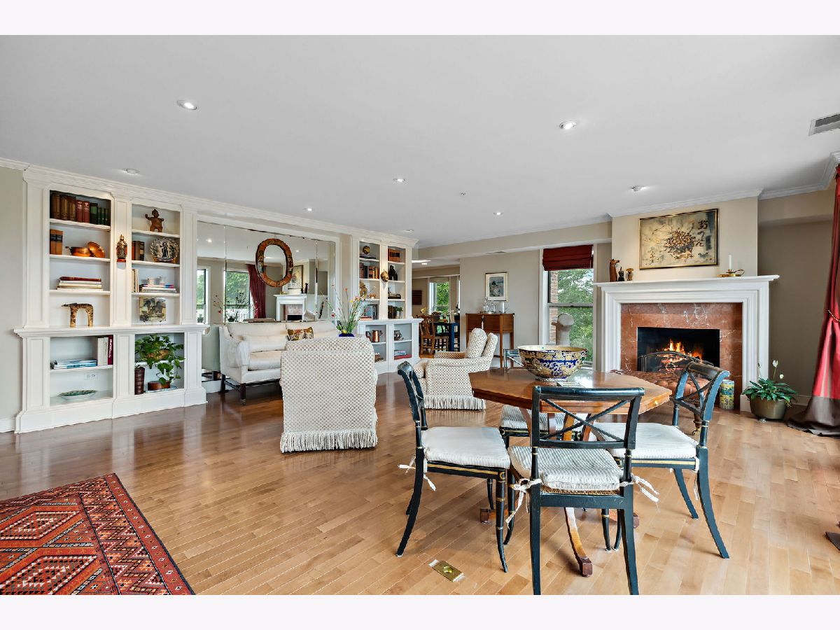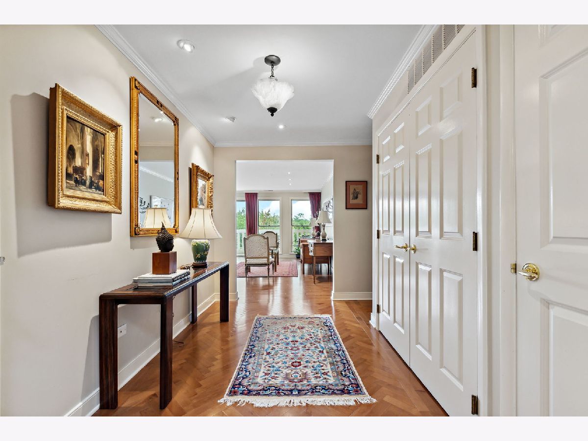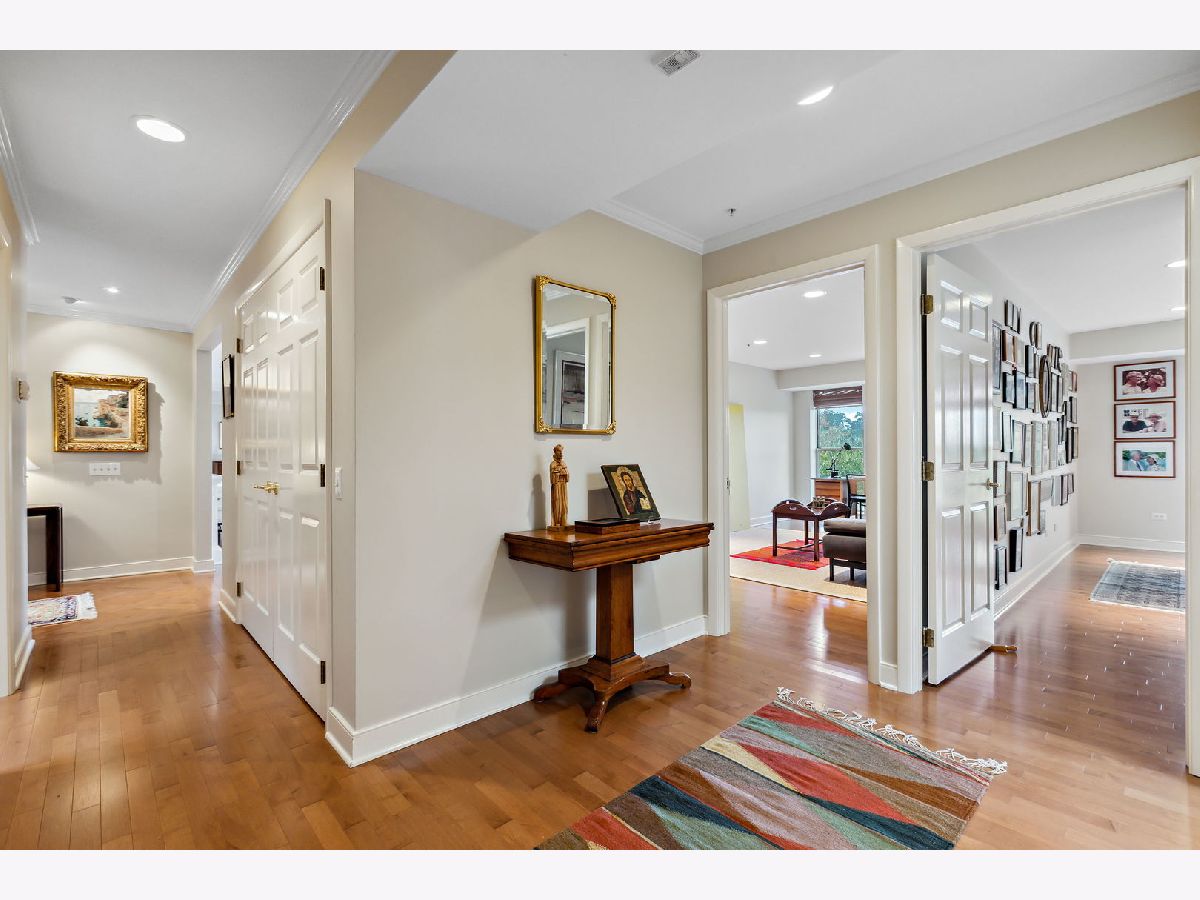 Rarely available, this top floor sophisticated penthouse has the most incomparable space and functional floor plan offering the best of living in desirable Hedge Row. One of the largest and gracious units in the building, this elegant 3 bedroom, 2 1/2 bath corner end unit overlooks the tree-tops creating a calm serene space, coupled with custom design features through-out composes harmonious and refined living. The wide foyer is welcoming and opens into the expansive living room and dining room encircled by greenery at every window brings the outdoors in. Combined with a warm fireplace, beautiful hardwood floors, extensive wood details, built-ins, beveled wall mirrors and a wall of windows overlooking the significant balcony - this home is so appealing and perfect for entertaining! The huge chef's kitchen features new stainless steel appliances, double oven, Fisher Paykel double DishDrawer, Sub-Zero Fridge, generous counter space and cabinets and large central eating area - great for an island or small table. Adjoining the kitchen is a comfortable family room - enjoy relaxing and cooking with this open living concept. The substantial primary bedroom has both a walk-in closet, additional large closet, linen closet and beautiful marble bath offering a double vanity, Kohler hardware, separate shower and jacuzzi tub. There are 2 additional bedrooms, several windows in each room and one with another walk-in closet. Also included is a laundry room with side-by-side washer/dryer and sink, large powder room for guests and 2 additional large hall closets for storage. This well-designed home flows from one room to the other with hardwood floors throughout and filled with light from 6 different sky-lights. Plus, there is an extra private storage room just off the 2 car garage spots - storage galore! Don't miss this tasteful home in a stellar locale near the library, in the heart of Winnetka, close to restaurants, shopping, train, beach and parks!