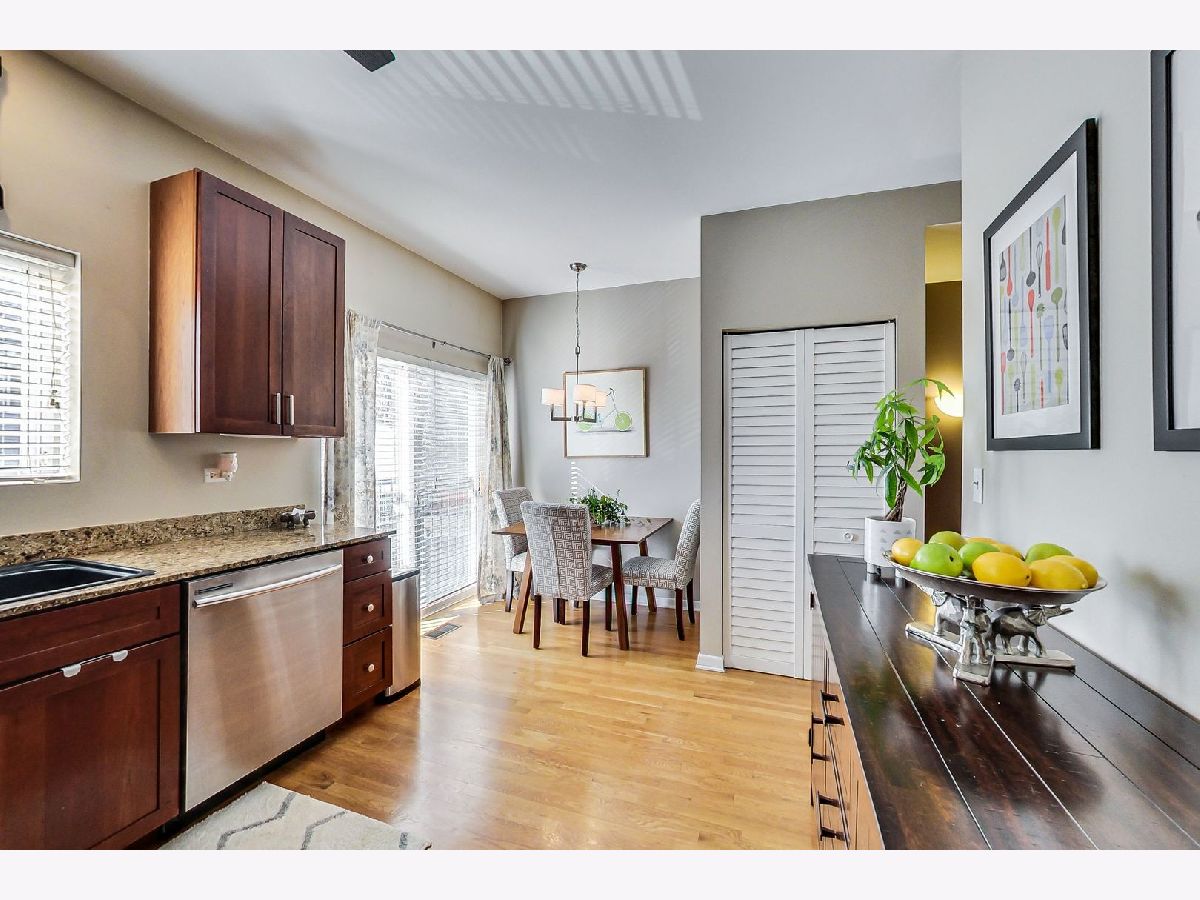 Newer 2 Bed + Den /2.1 Bath townhome located in quiet and private community in Old Irving/Portage Park. Property is on Milwaukee Court (not Milwaukee Avenue) and located between single family homes, rowhomes and townhomes. Convenient two (2) car attached garage for Chicago winters. Spacious living/dining area with upgraded slate gas fireplace, hardwood floors, 9 ft. ceilings, spacious eat-in kitchen w/ 42" cherry cabinetry, granite, stainless steel appliances, large pantry, laundry and Juliette balcony off the kitchen. Vaulted ceilings in master bedroom suite with large custom closet organizers, bath w/ double vanity, separate shower and soaker tub. Custom darkening shades in the bedrooms. Newer carpeting in bedrooms/hallways, and custom light fixtures. Access to semi-private rooftop from 3rd floor with views of the skyline and perfect space to entertain, grill or relax. Low monthly assessments, located near Six Corners with easy access to expressway, Metra, CTA, shops, restaurants. Steps to Metra Grayland Station and close to the Irving Park Blue Line. Enjoy a little feel of the suburbs in the City. * Den can be enclosed for 3rd bedroom - Seller will offer a $2500 credit towards this change**