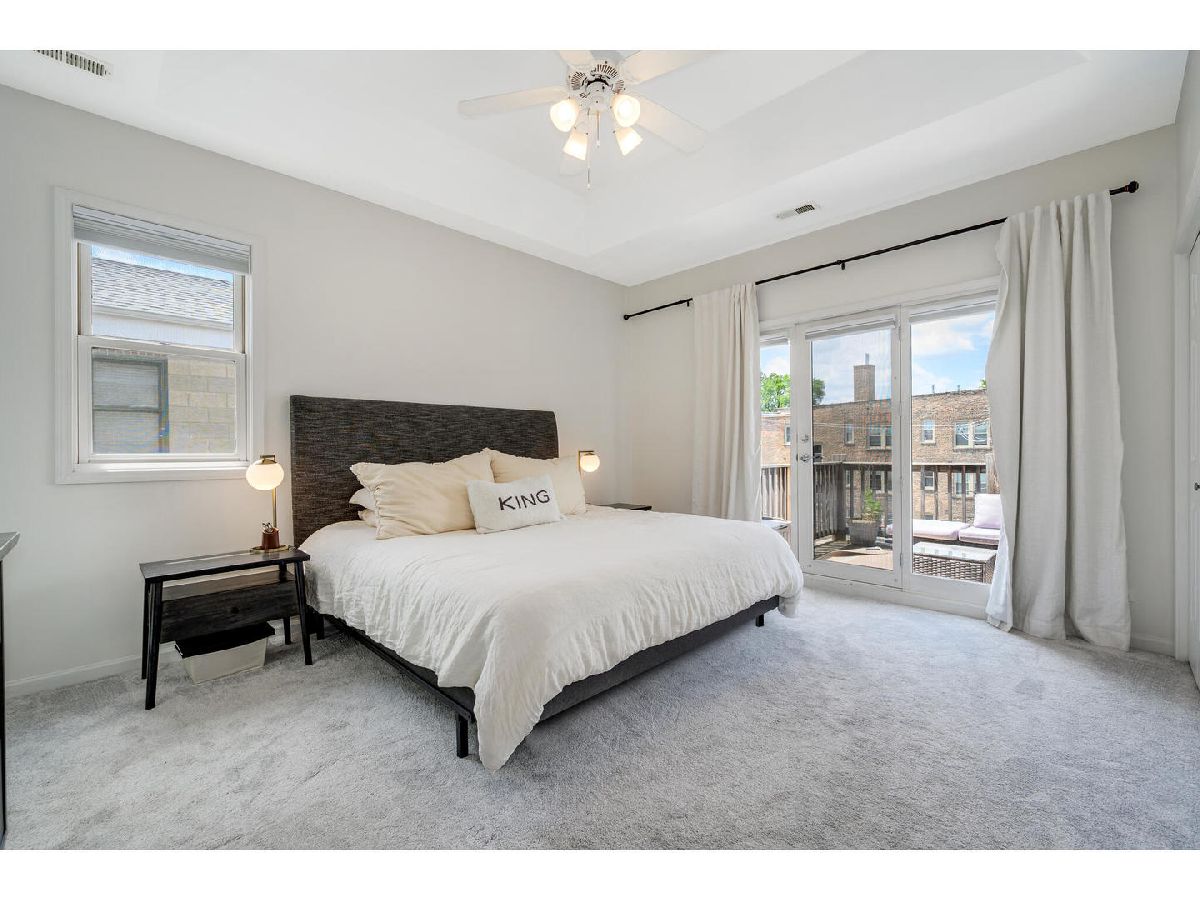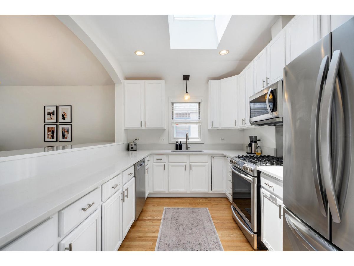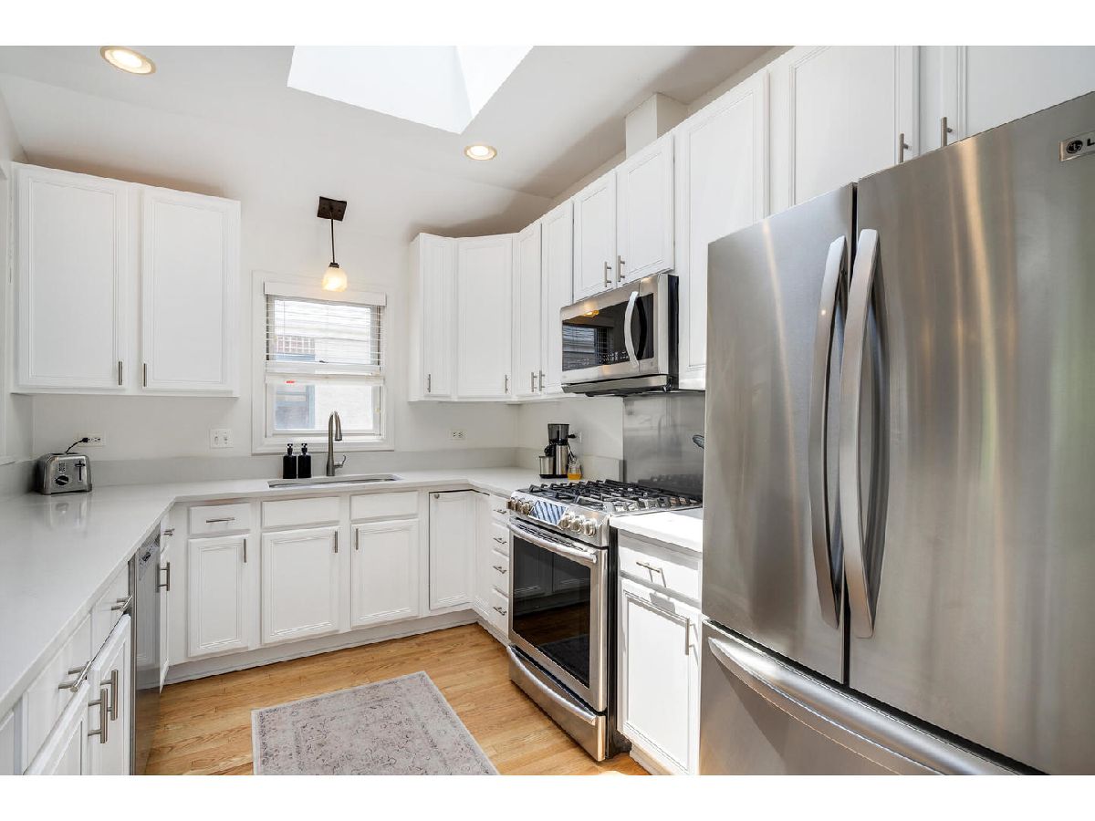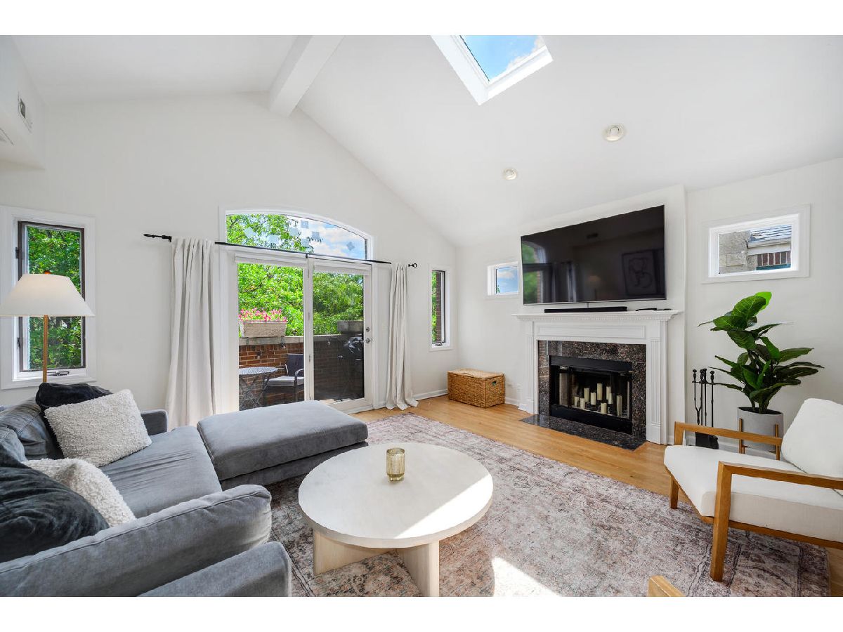 Stunning top-floor three bedroom, two bath condo with private two car garage in prime Southport Corridor Location! Nestled on tree-lined block in the highly sought-after Southport Corridor, this beautiful residence offers the perfect blend of space, light and functionality. Step into a sun-filled home featuring vaulted ceilings, skylights, and windows facing east, west, and south, allowing natural light throughout the day. The updated kitchen showcases new quartz countertops, a vast breakfast bar, stainless steel appliances, 42" white cabinetry and a large pantry for all your storage needs. The spacious living area offers a designated dining space, a cozy wood-burning fireplace and access to the front balcony. The generous primary suite offers three closets, a renovated en-suite bath with a large walk-in shower and dual vanities. Laundry room with side-by-side washer & dryer, countertop, and plenty of storage space. Front entry foyer and back entry foyer/mudroom. Additional features include: linen closet, gleaming hardwood floors, updated second full bathroom and new furnace. Enjoy ample private outdoor space, including a front and back balcony perfect for relaxing or entertaining. Boutique shopping, parks, acclaimed restaurants, grocery stores, CTA transportation, Wrigley Field and Blaine School right outside your door!