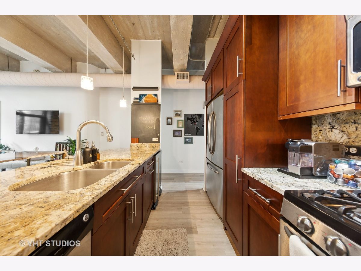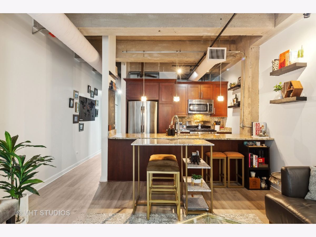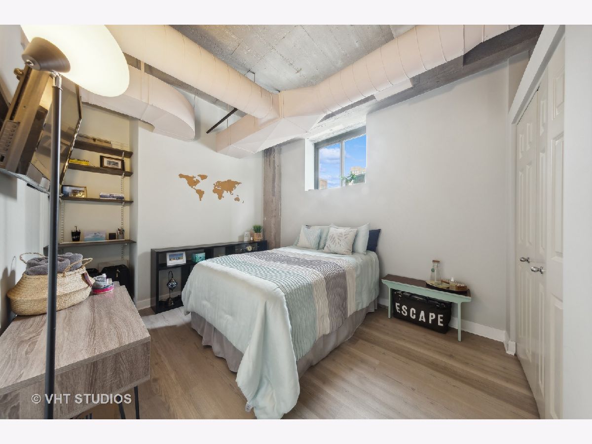 This exceptional 2-bedroom, 2-bathroom condo loft with split floorplan is located in the highly sought-after River North neighborhood. Upon entering you pass the 2nd bedroom and enter a spacious open plan living area with floor-to-ceiling windows. The brick accent walls and high beamed ceilings add to the loft's charm, creating a warm and inviting atmosphere. This well-equipped kitchen features Cherry cabinets and stunning granite countertops that glisten under the light. The kitchen also boasts all stainless steel appliances, including a convenient wine fridge, and a breakfast bar. The primary suite offers ample space and plenty of natural light, while the ensuite bathroom is well-appointed and features a whirlpool shower/tub combo and double sink vanity. Enjoy plenty of storage space with the walk-in closet and California Closet organization. Large 2nd bedroom. This condo loft also includes an in-unit washer and dryer, a Juliette balcony providing a perfect spot watch the sunrise or sunset and 1-garage space for 25k.