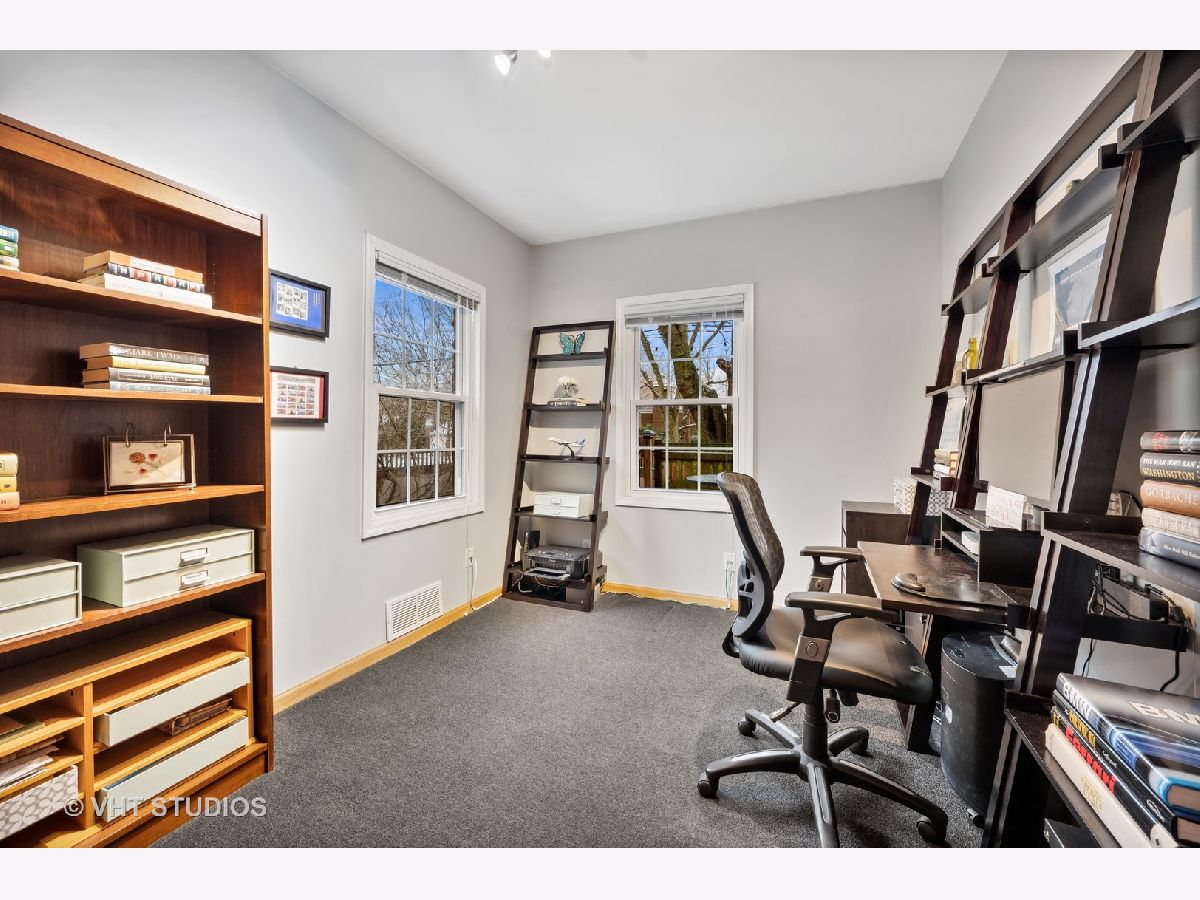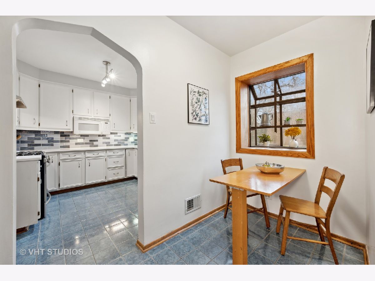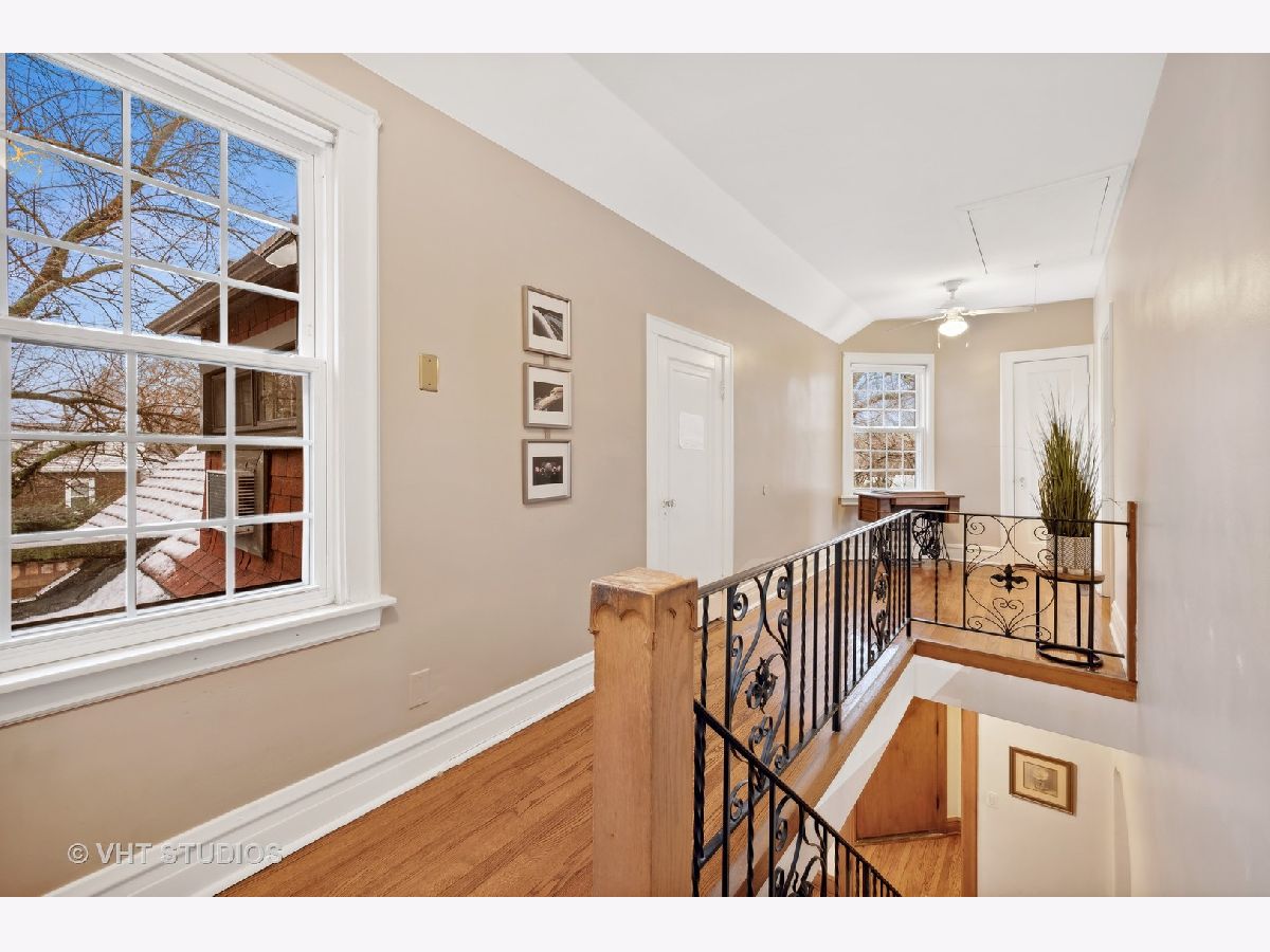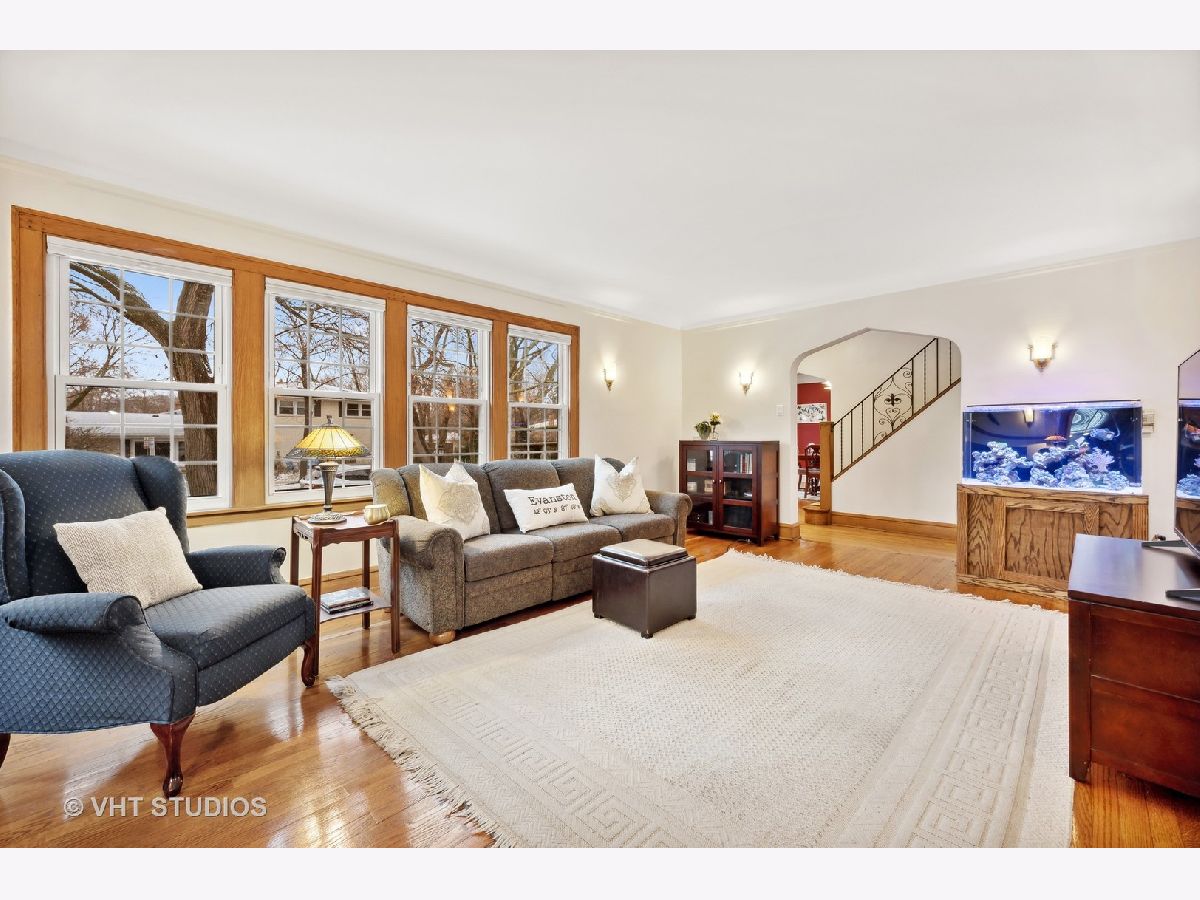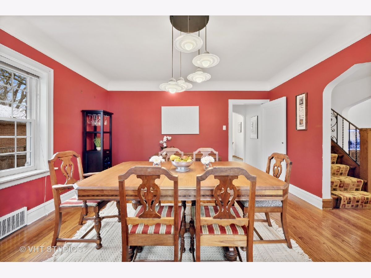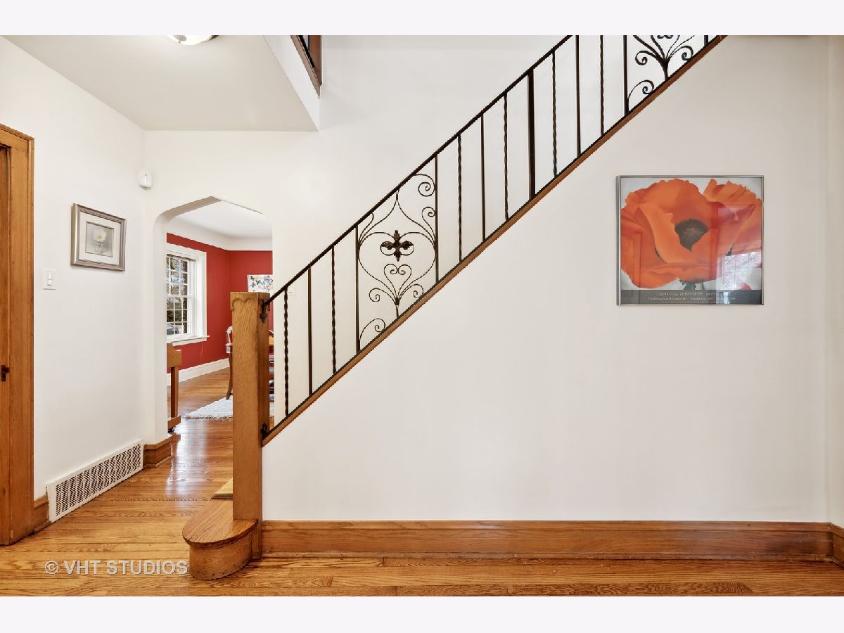 There's character at every turn in this rare, light-filled brick Tudor in south Evanston. Gorgeous oak floors, large windows, and 9 foot ceilings show off this charming home. The first-floor circular floor plan boasts a large living room, dining room and desirable office/bedroom as well as a half bath, and a bright updated kitchen with stainless appliances, white cabinets, quartz counters and separate breakfast nook. The stunning staircase with wrought-iron railing is the focal point of the entry and leads to the second story living space with three bedrooms and a full bath. The primary bedroom is oversized with 2 closets. The second bedroom is also generously sized with 2 exposures. The third bedroom is a cozy oasis with an east facing dormer. The partially finished basement features a large family room with retro built-in dry bar, bonus room/office, a workshop, craft room and ample storage space. Clean well kept 1-car garage completes this brick home's appeal. Enjoy the beautiful landscaping that blooms throughout the season. Conveniently located minutes from all schools, James Park, Levy Center, Robert Crown Center & library, Quad Indoor Sports, groceries and retail.